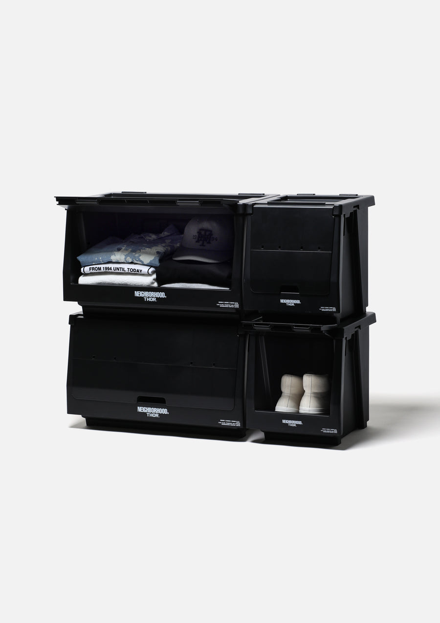 A collaborative item with THOR, featuring the "Stacking Shelf Container," which allows the main body, lid, and door to be freely combined according to use. This 20L model comes as a set including the body, lid, and door. Printed logos from both brands. Made of polypropylene.