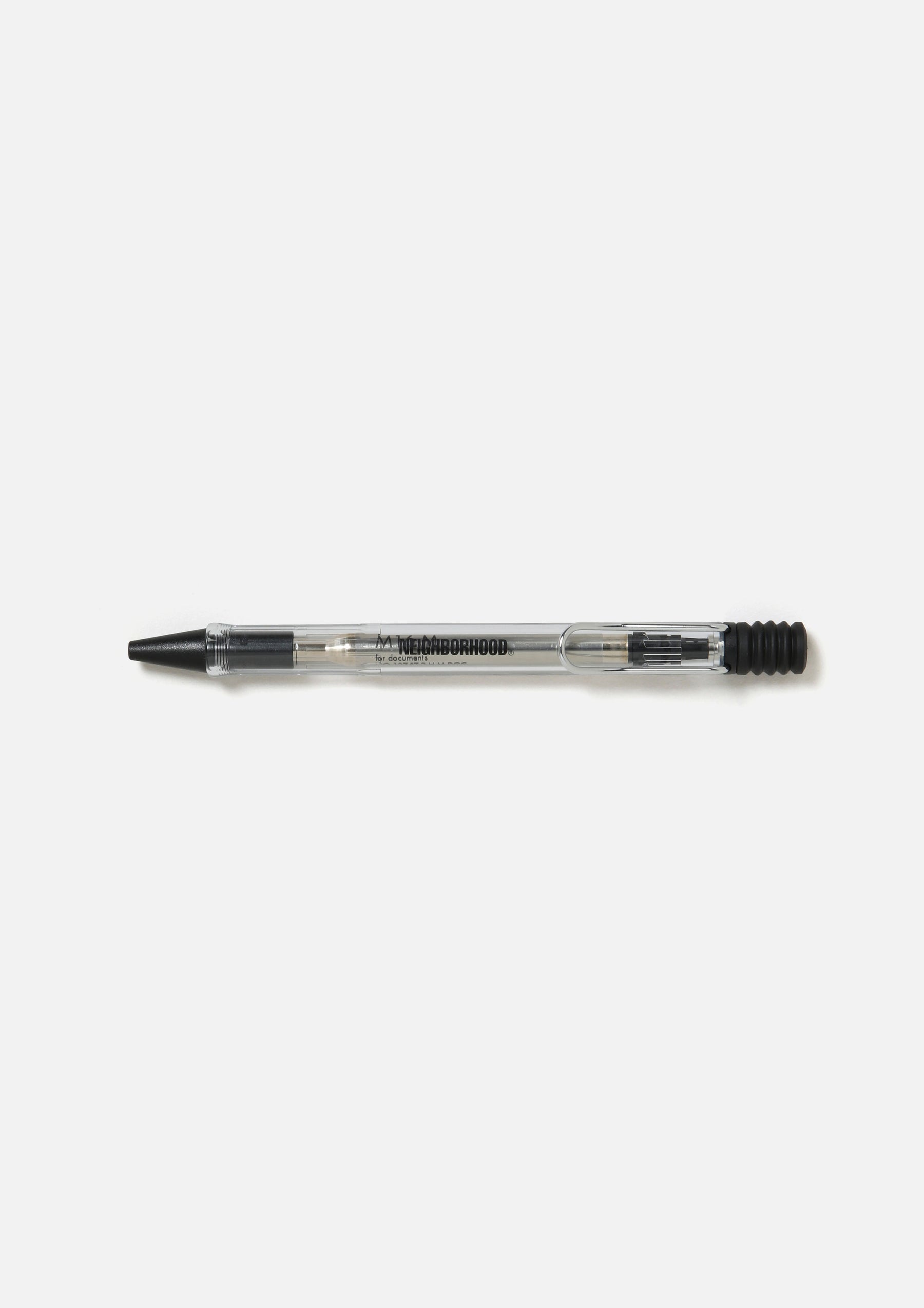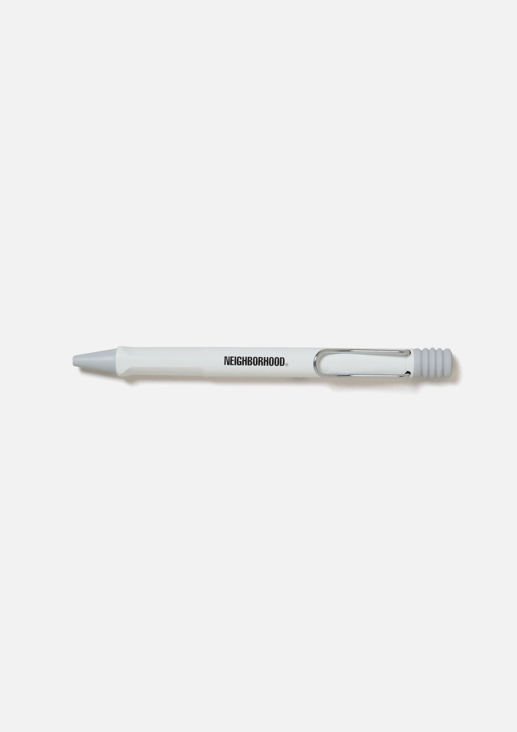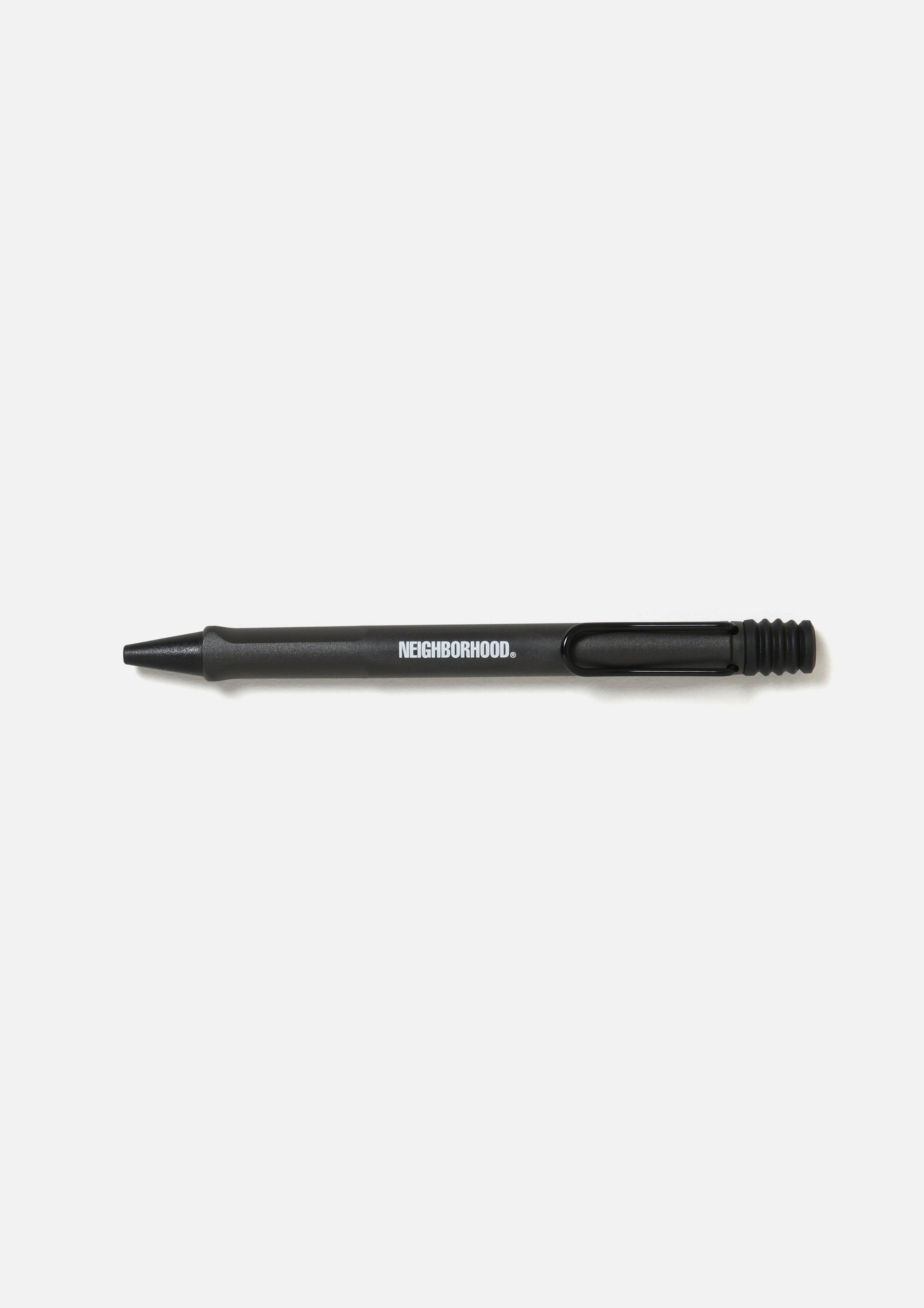 A collaborative item with LAMY. Based on the "Safari Ballpoint Pen," featuring a distinctive spring-loaded clip. The grip section features a printed logo. Designed with an ergonomic grip and a highly durable shock-resistant plastic body.