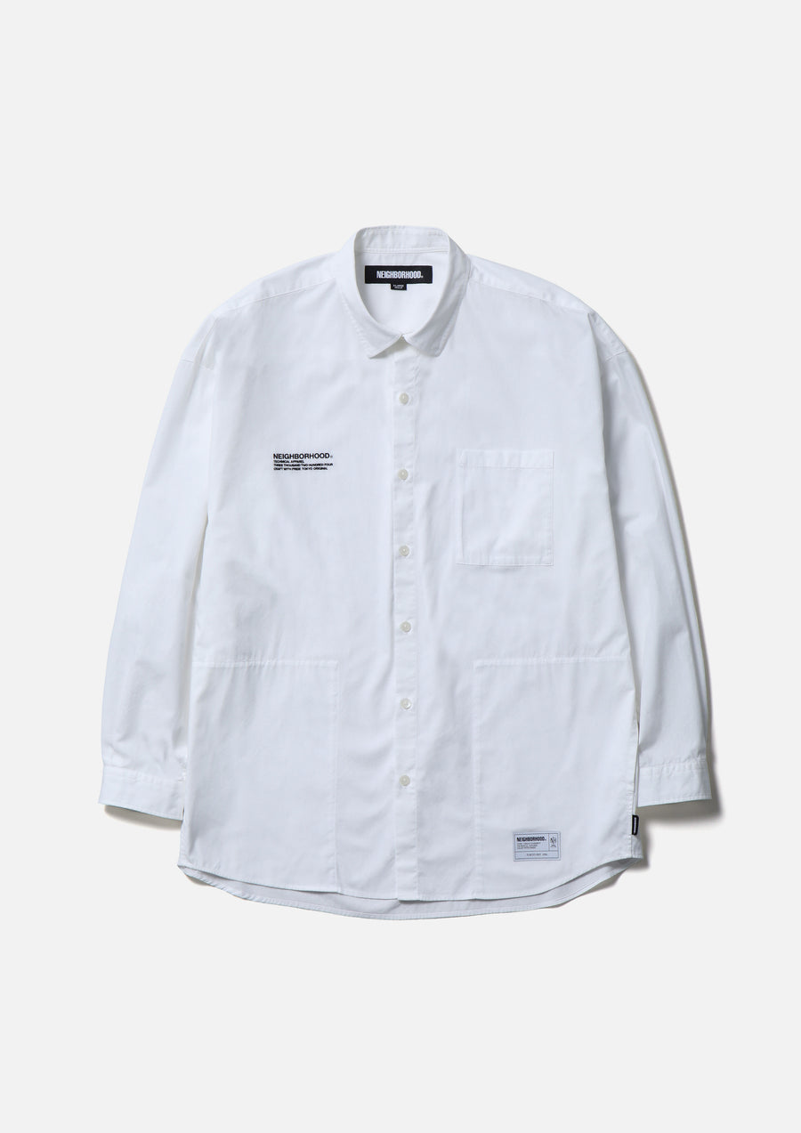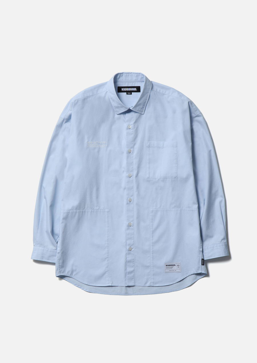 An overshirt made from lightweight broadcloth fabric with a smooth touch and moderate firmness. Equipped with hand pockets utilizing side details. Embroidered logo on the right chest. Features original shell-like buttons, a brand tag on the left hem and side seam. Relaxed silhouette. One-wash finish.