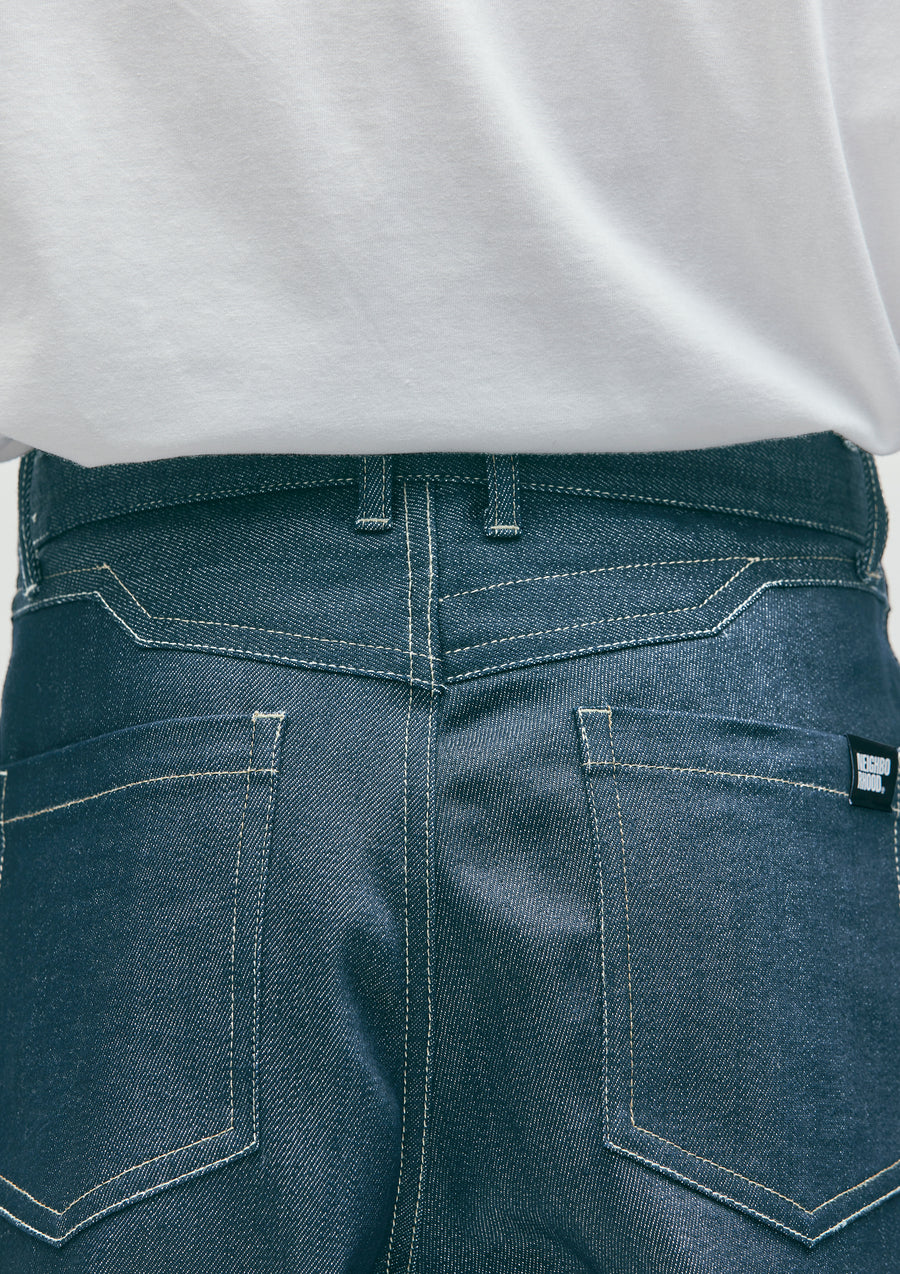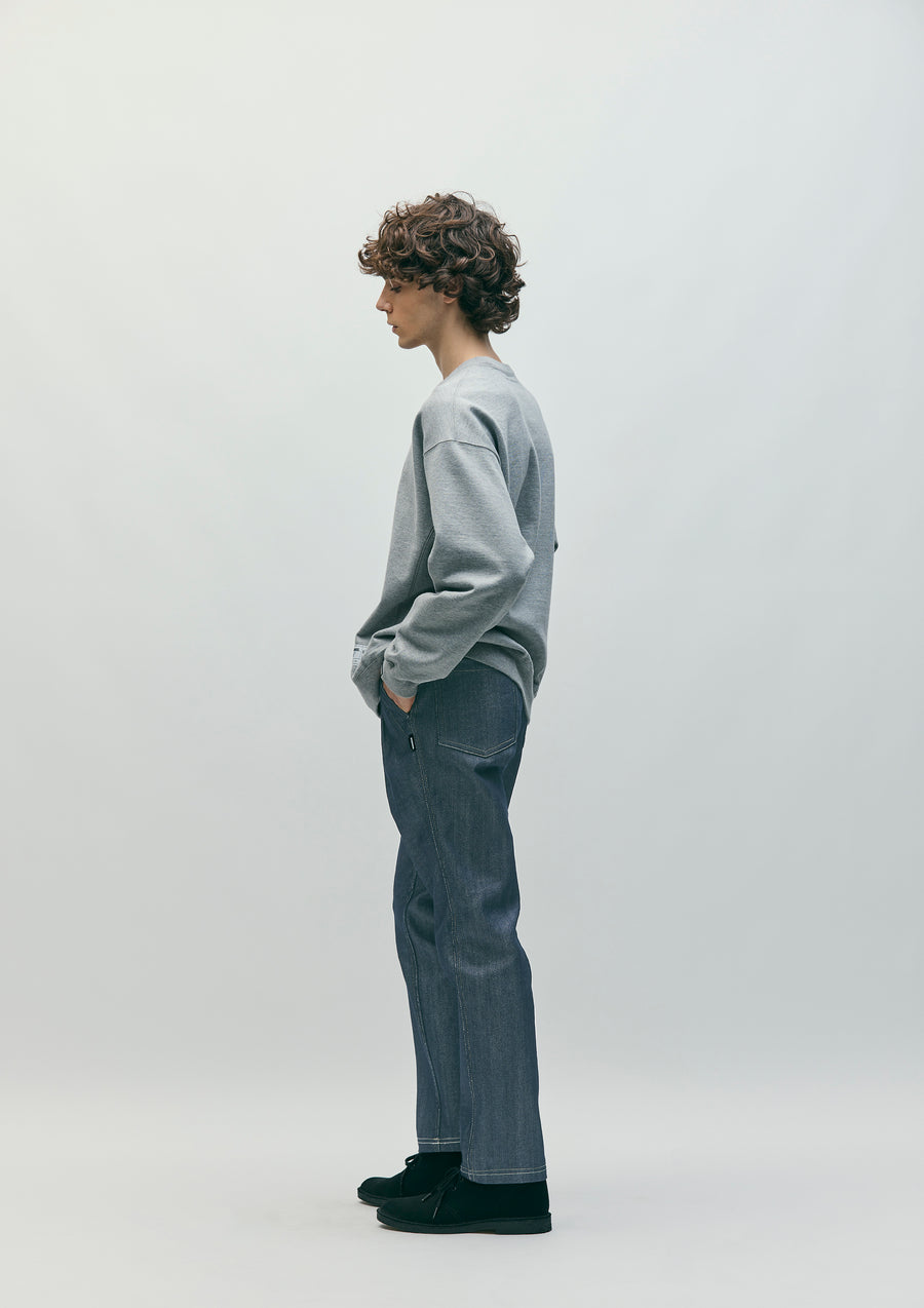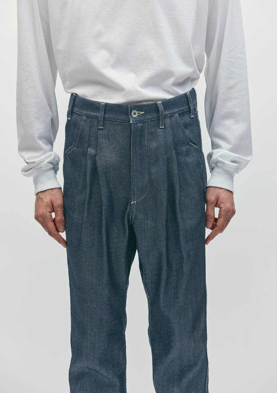A pair of two-tuck pants made from SOLOTEX® blended denim fabric. Features design stitching on the front pockets and back yoke. Equipped with original tuck buttons, a front zipper, signature tape, and pocket lining fabric. Includes a brand tag on the side seam. Features a gusseted crotch for a clean silhouette.