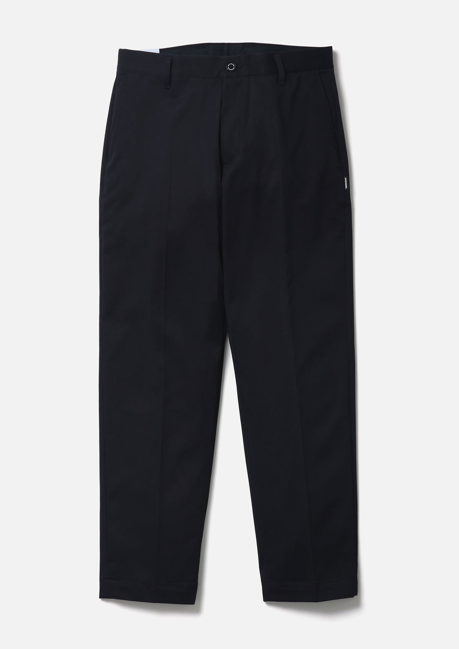 A pair of ankle pants made from chino fabric with a luxurious sheen and a soft, voluminous texture. Equipped with original four-hole buttons, a front zipper, and signature tape. Includes brand tags on the back of the waistband and on the side seam. Tapered narrow silhouette with center creases.
