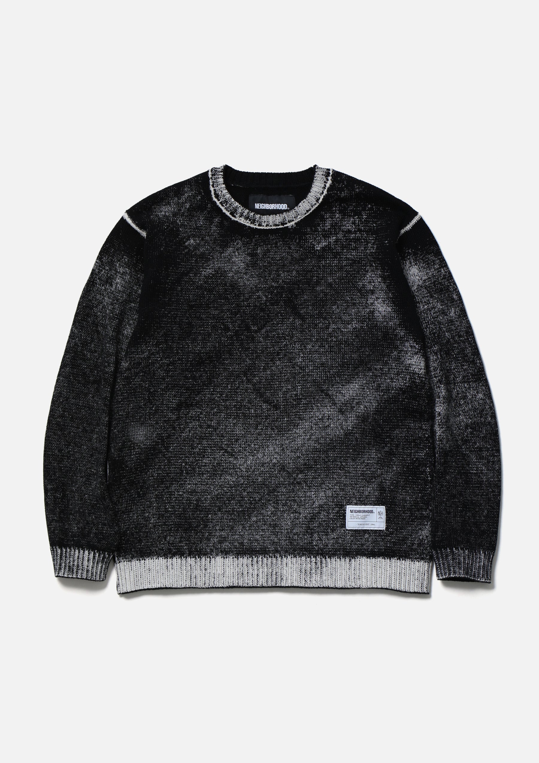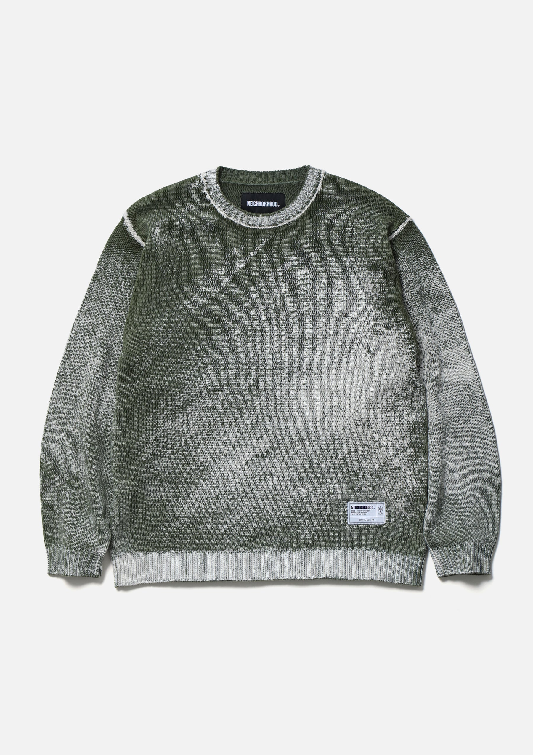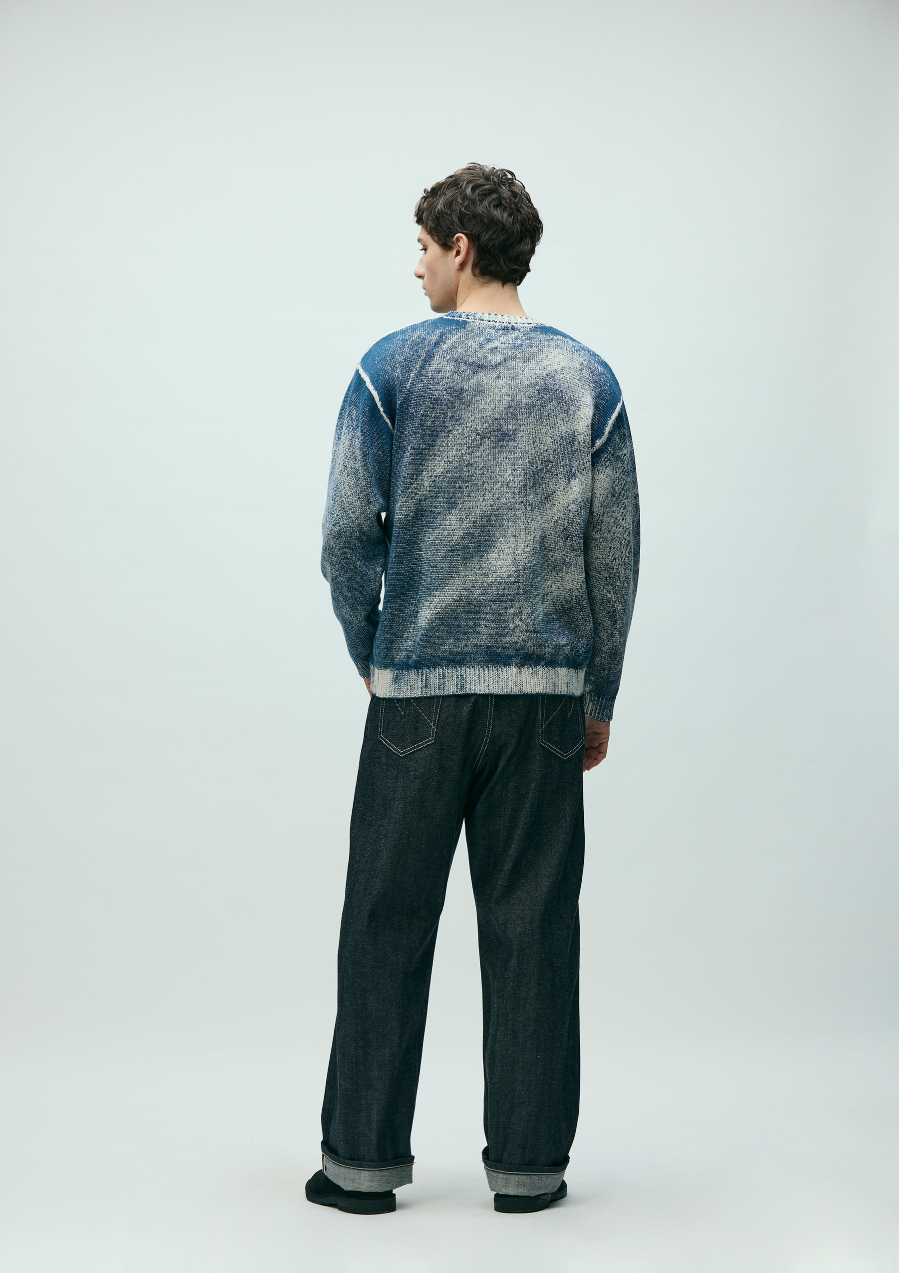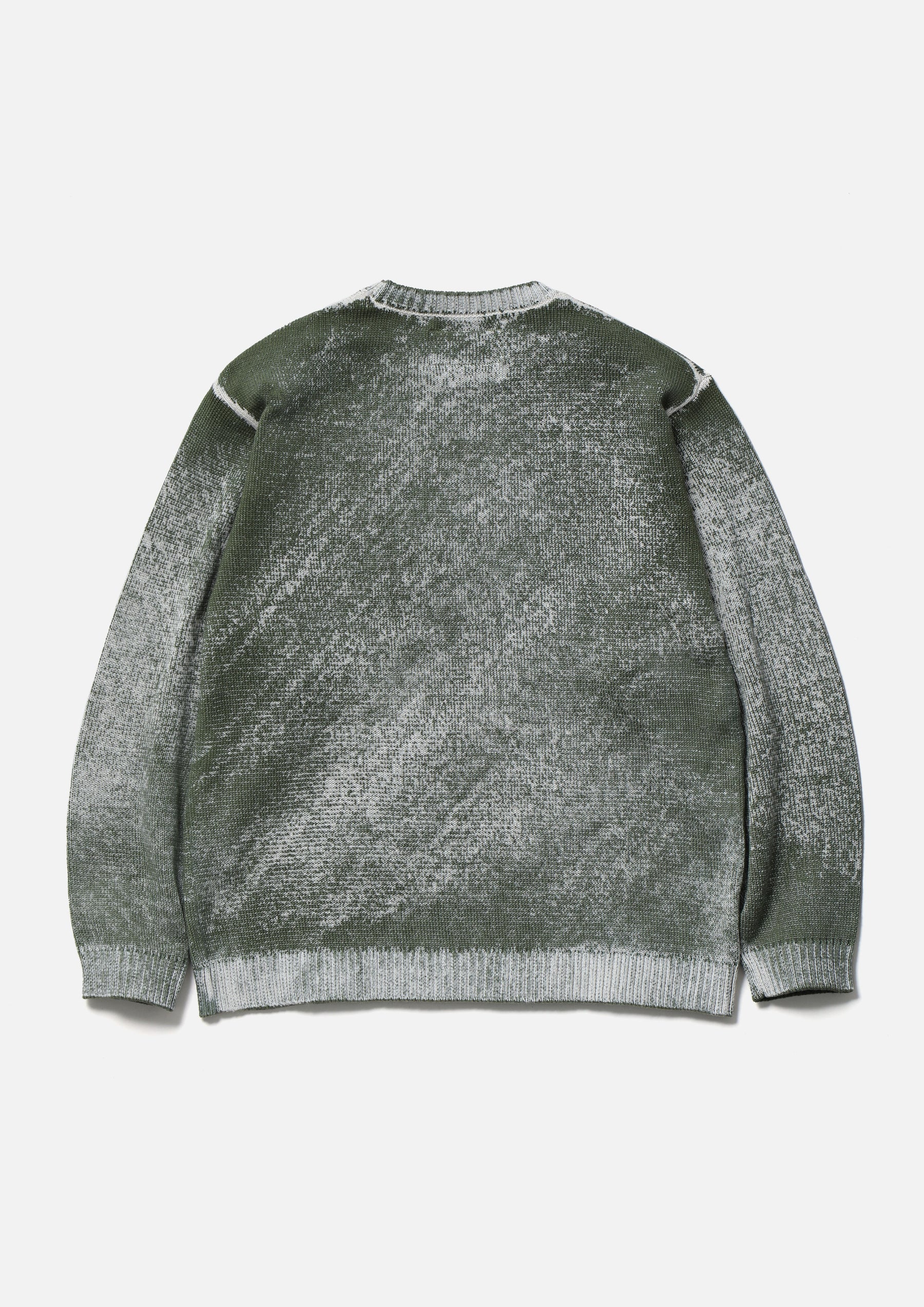 A long-sleeve crewneck knit featuring a pattern created by printing from the reverse side onto the knitted parts, allowing the ink to permeate and appear on the front.