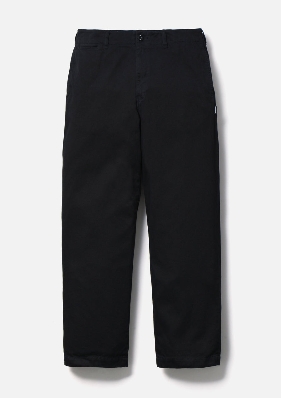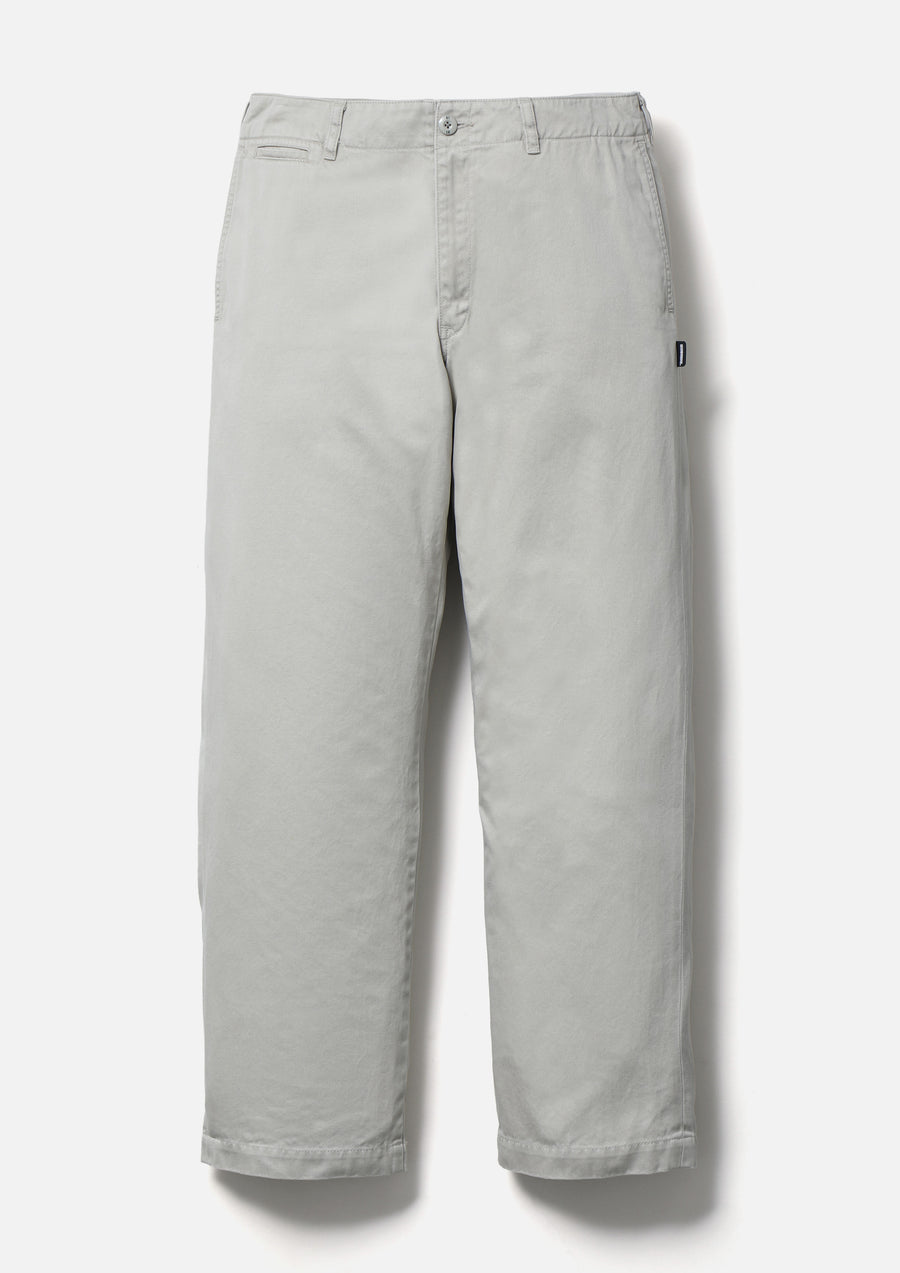 Chino pants crafted from high-density West Point fabric that balances suppleness with durability. Designed with a coin pocket, piped seam finishes, and double-welt back pockets as classic details. Finished with original buttons and zipper pulls. A brand tag is placed above the back pocket, and a woven side label is attached at the side seam. Cut in a relaxed silhouette and completed with a bio-stone wash finish.