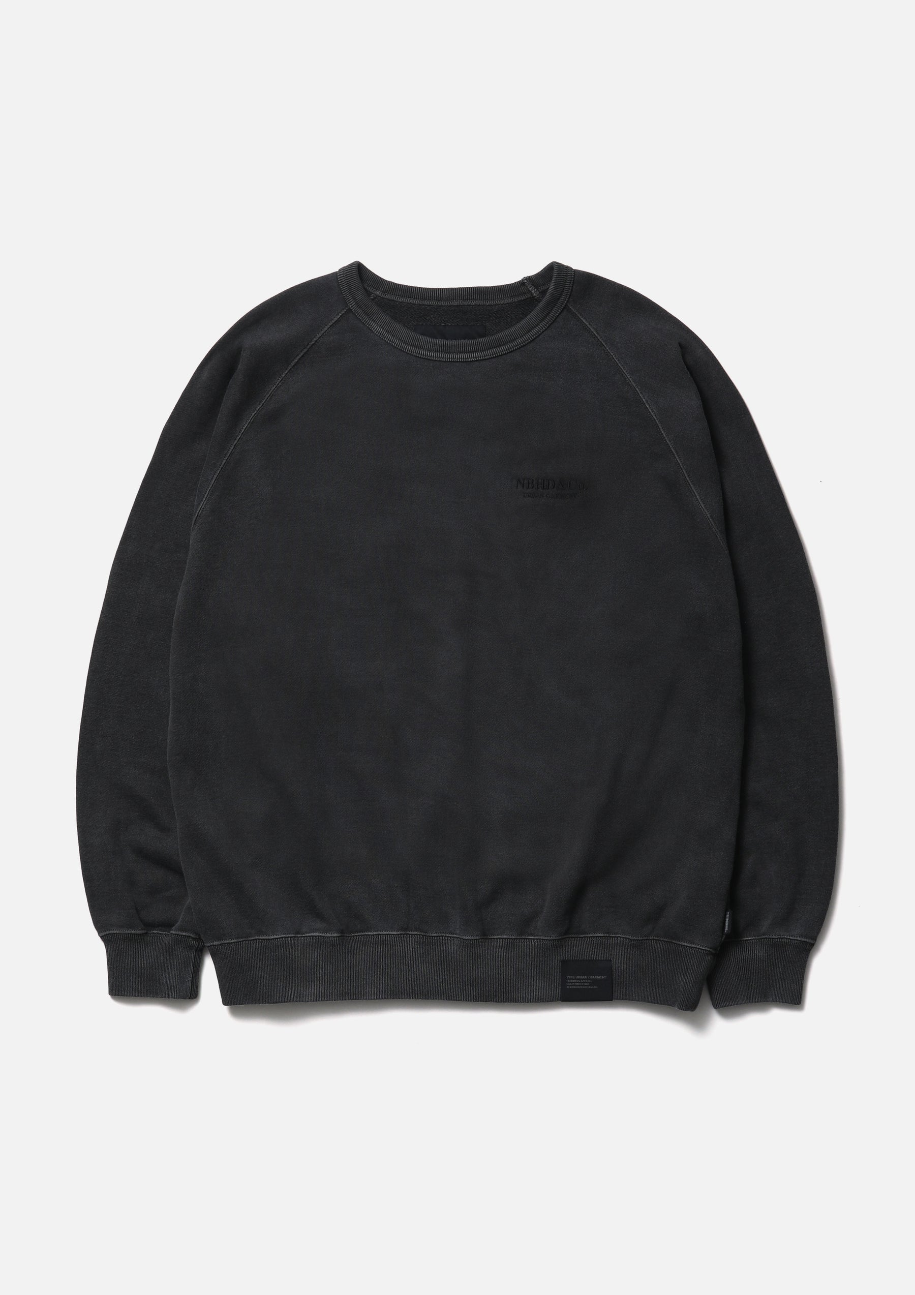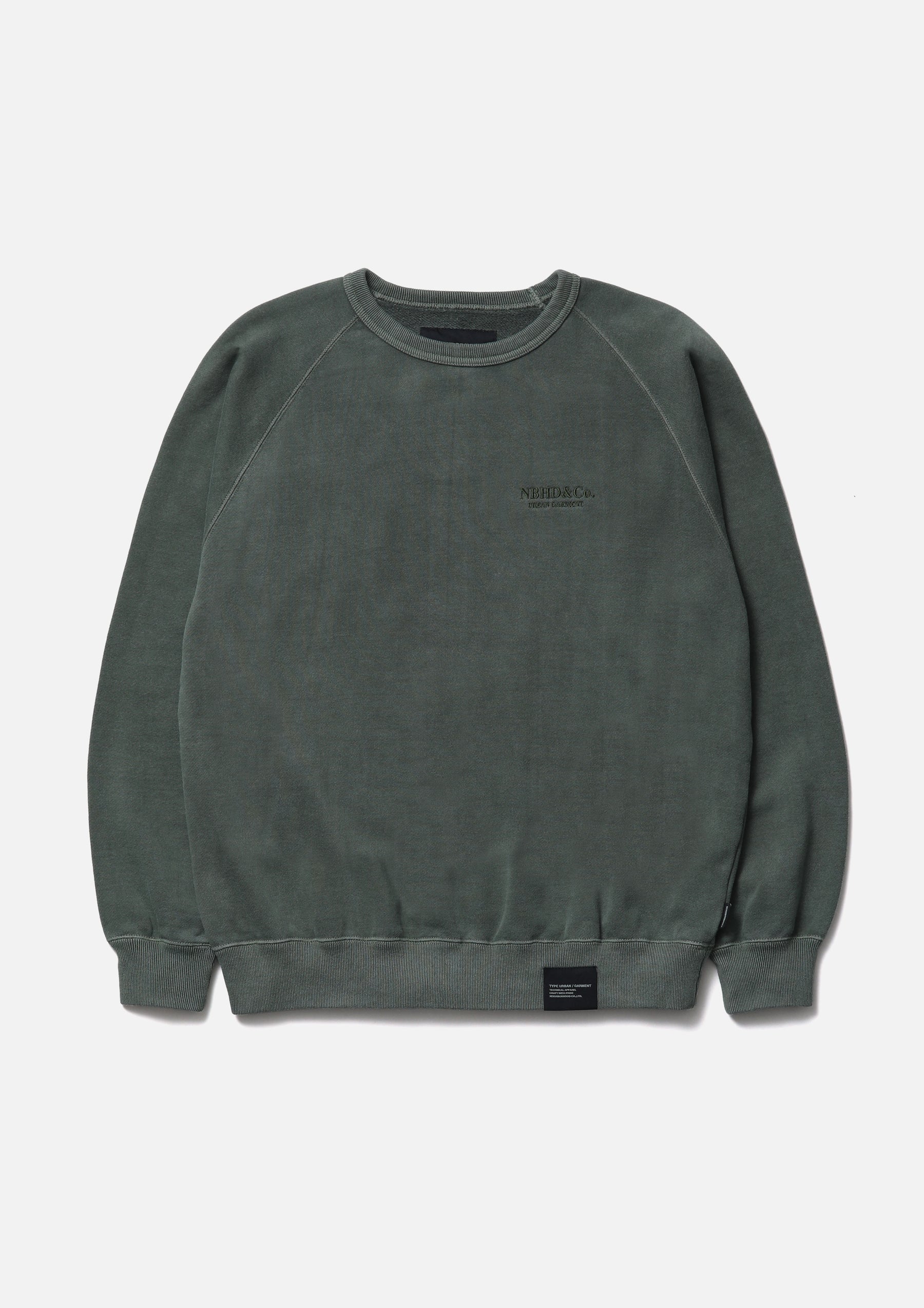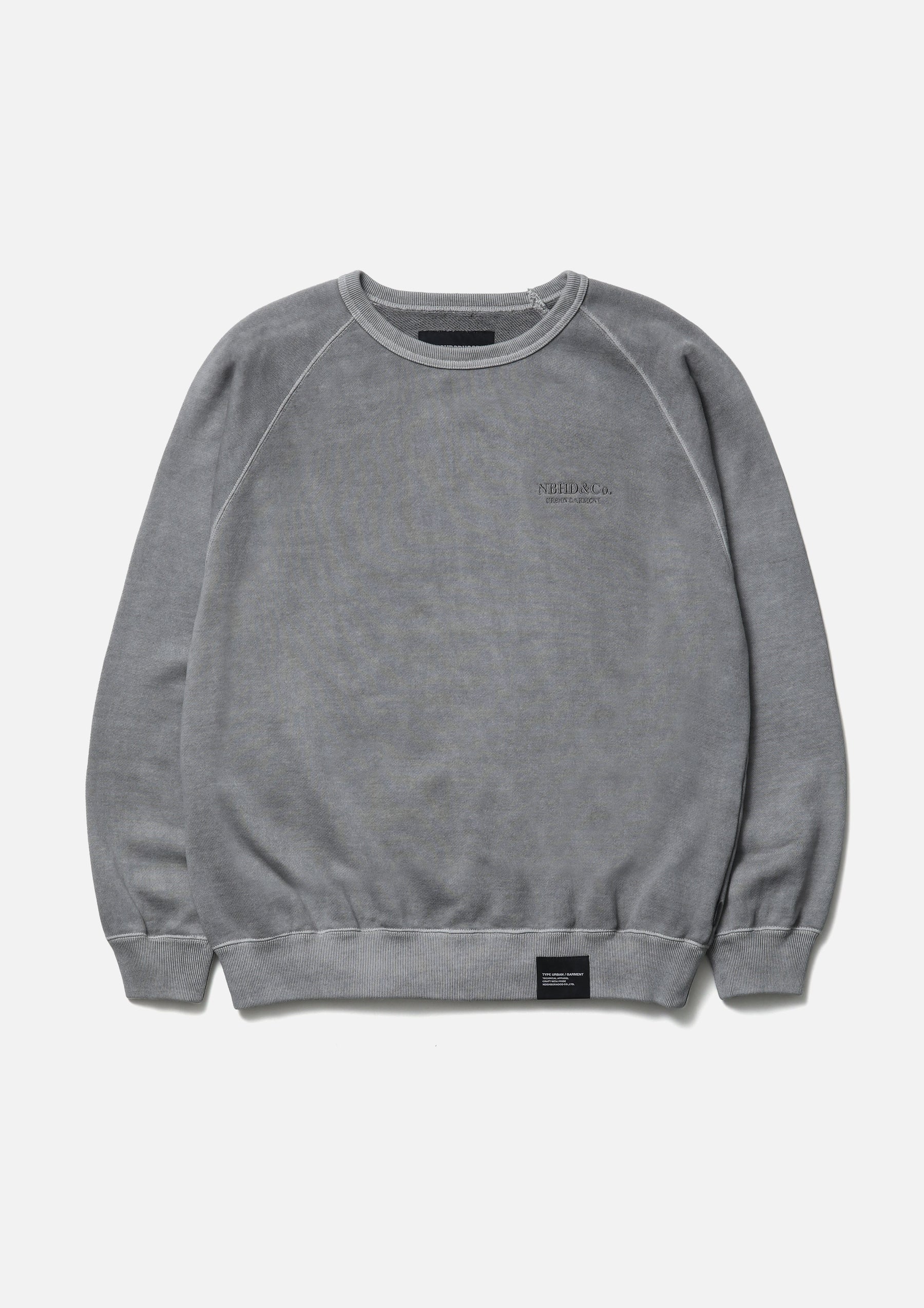 Crewneck pullover made from cotton fleece fabric, garment-dyed with a pigment finish. Designed with raglan sleeves and an embroidered logo on the left chest. A brand tag is placed at the left hem, and a woven side label is attached at the side seam.