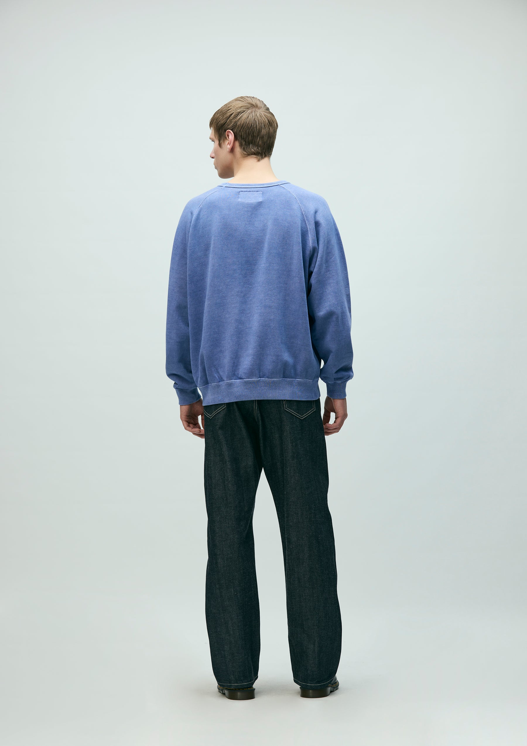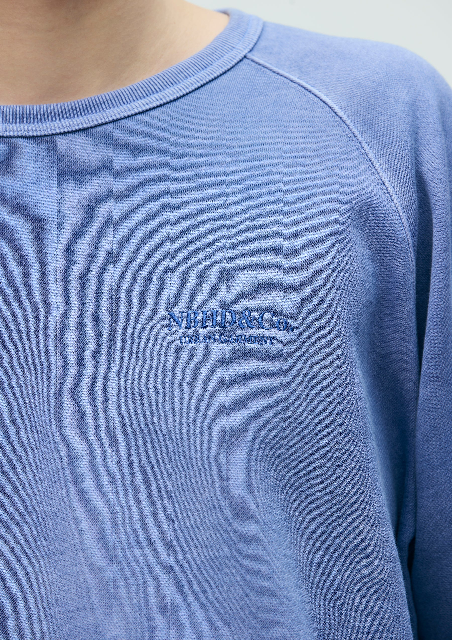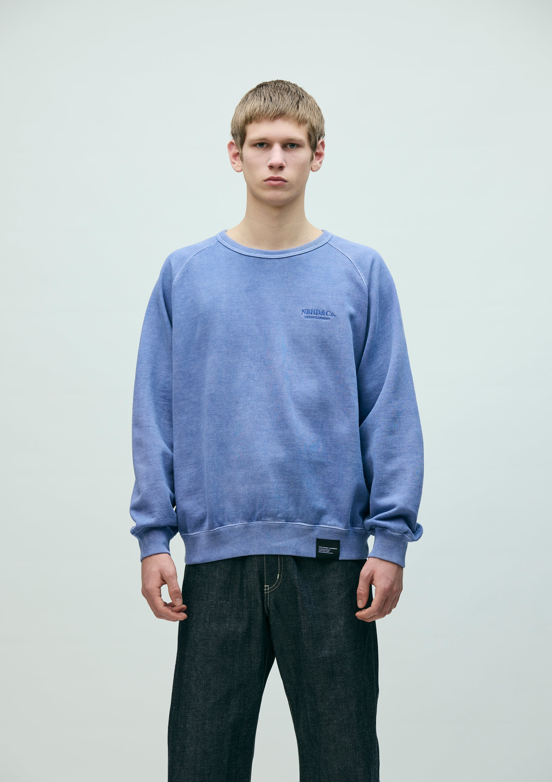 Crewneck pullover made from cotton fleece fabric, garment-dyed with a pigment finish. Designed with raglan sleeves and an embroidered logo on the left chest. A brand tag is placed at the left hem, and a woven side label is attached at the side seam.