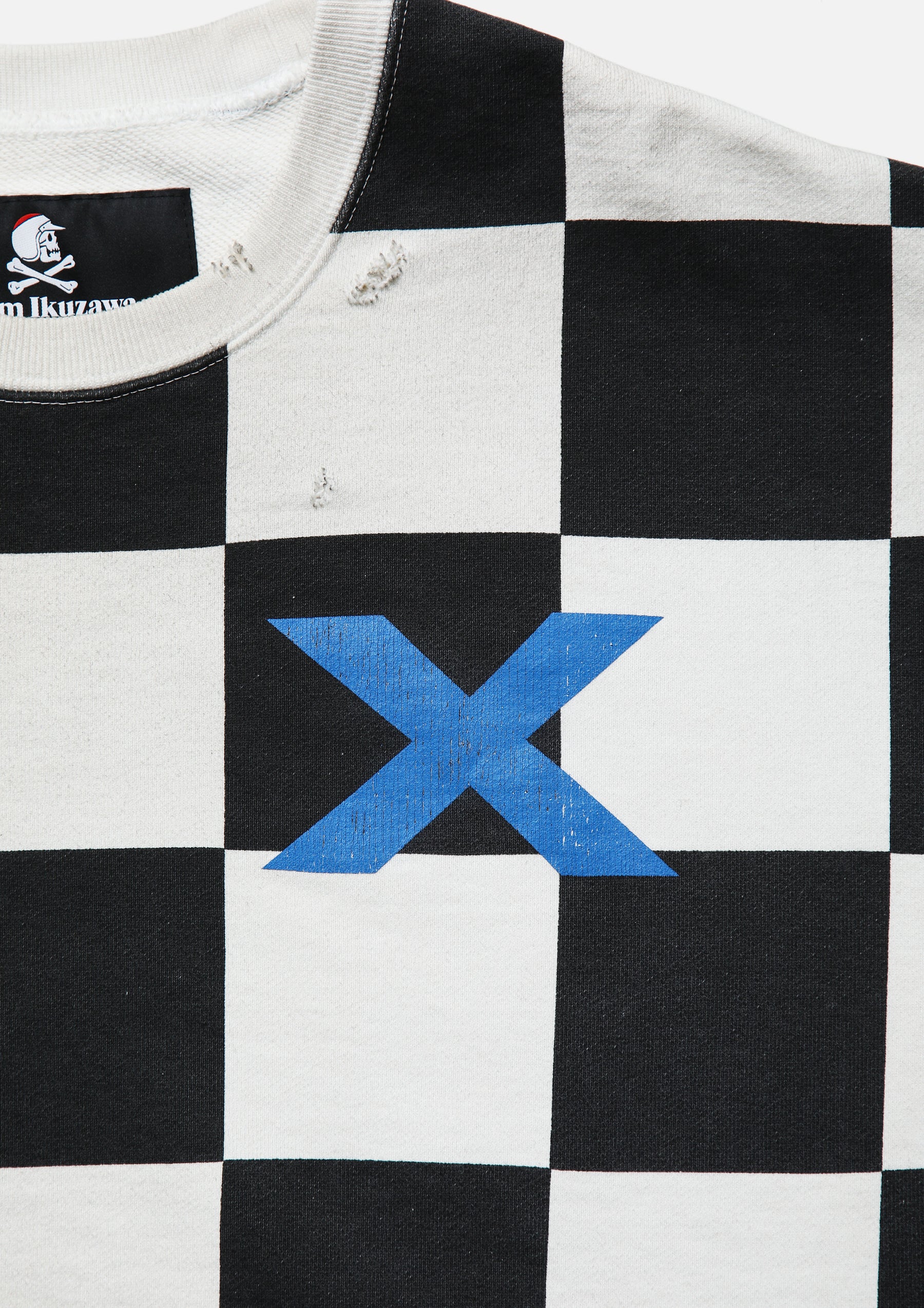 Crewneck pullover made from cotton fleece, finished with a savage treatment. Realistic aging is reproduced through a combination of garment dyeing, staining, distressed holes, and crack prints. Features printed graphics and logos. A muff pocket is placed on the front. A woven side label is attached at the side seam. Collaborative model with Team Ikuzawa.