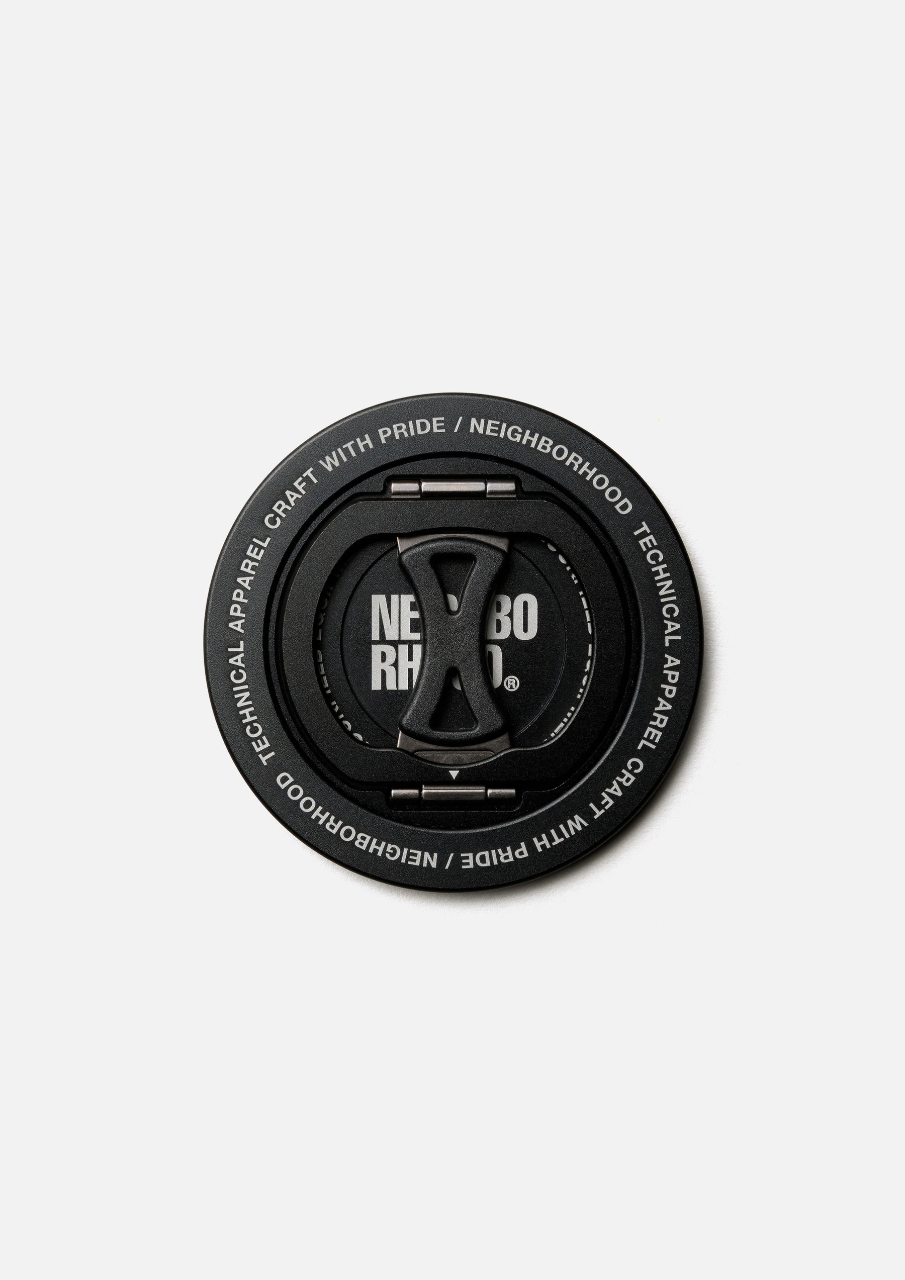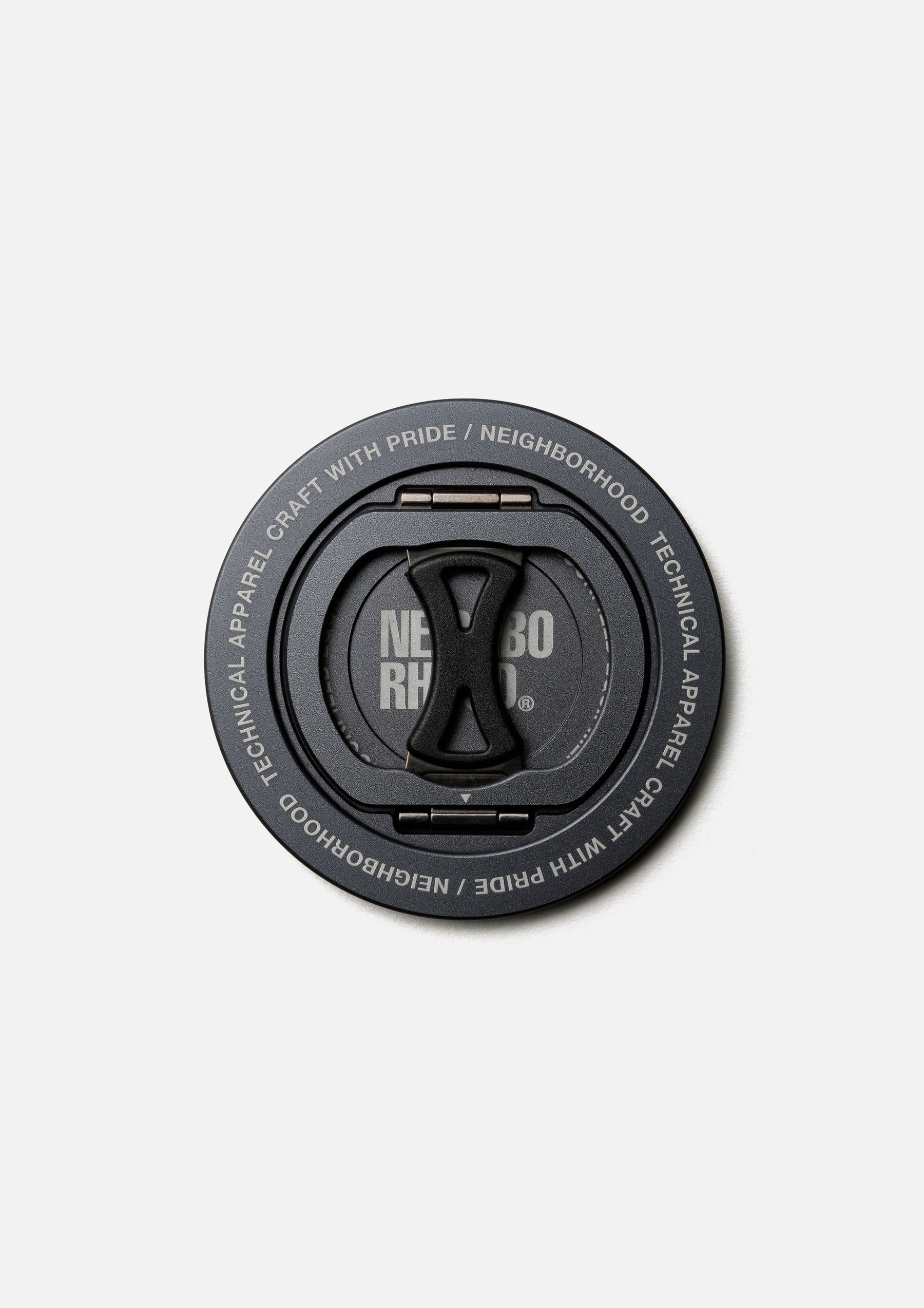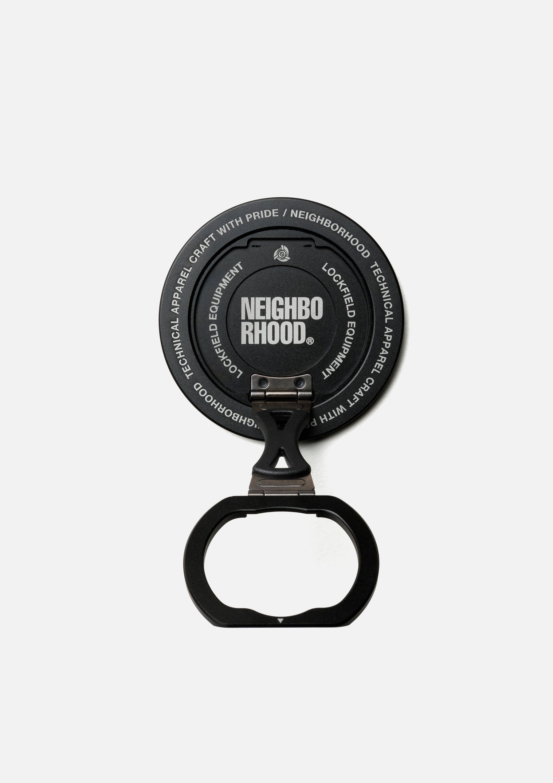 Magnetic ring compatible with iPhone’s MagSafe system. Features a 360-degree rotating ring design, allowing both vertical and horizontal orientations when used as a stand. Can also function as a finger hold ring. Printed with both brands’ logos. Slim construction with a folded thickness of approximately 4mm. Easily attachable and detachable using magnetic force. A collaboration with LOCKFIELD EQUIPMENT.