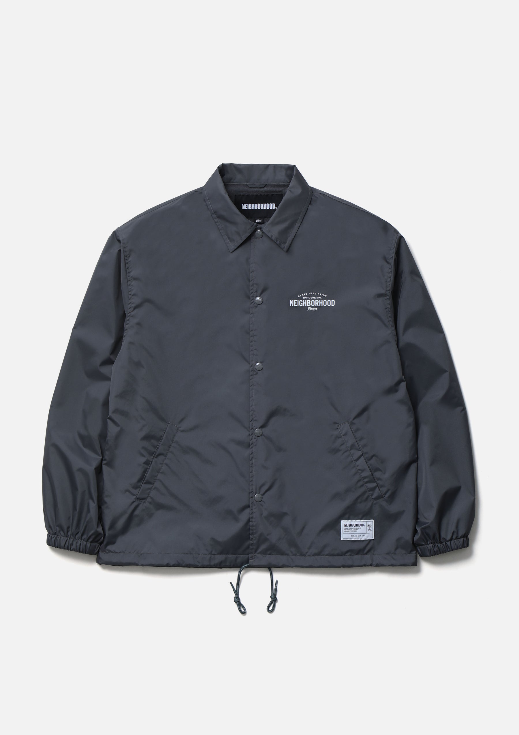 A Windbreaker jacket made from nylon taffeta material that combines lightness with durability. Equipped with an adjustable drawcord at the hem. Logos are printed on the left chest and back. Finished with original snap buttons. A brand tag is placed at the left hem, and a woven side label is attached at the side seam. Features a tricot lining with excellent moisture absorption and quick-drying properties.