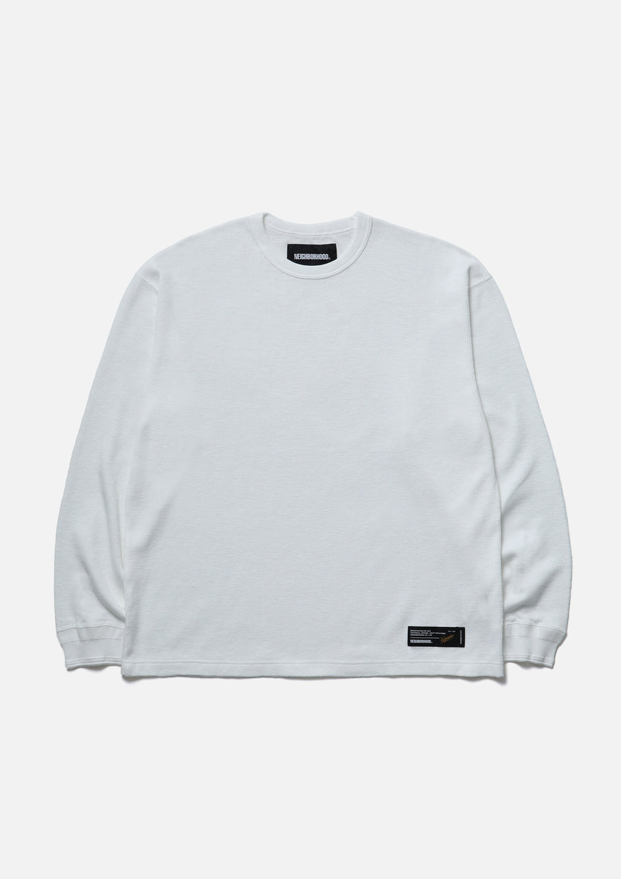 Long-sleeve crewneck cut-and-sew top made from honeycomb waffle fabric. A brand tag is placed at the left hem, and a woven side label is attached at the side seam. Completed with a one-wash finish.