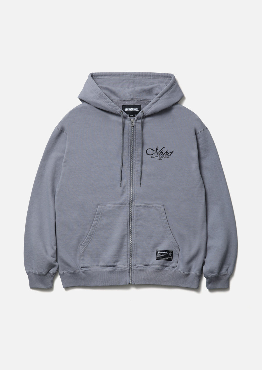 Zip-up hoodie made from medium-weight cotton fleece fabric. Features printed logos on the left chest and back. Equipped with an original adjustable drawcord at the hood and original zipper pulls. A brand tag is placed at the left hem, and a woven side label is attached at the side seam. Completed with a one-wash finish.