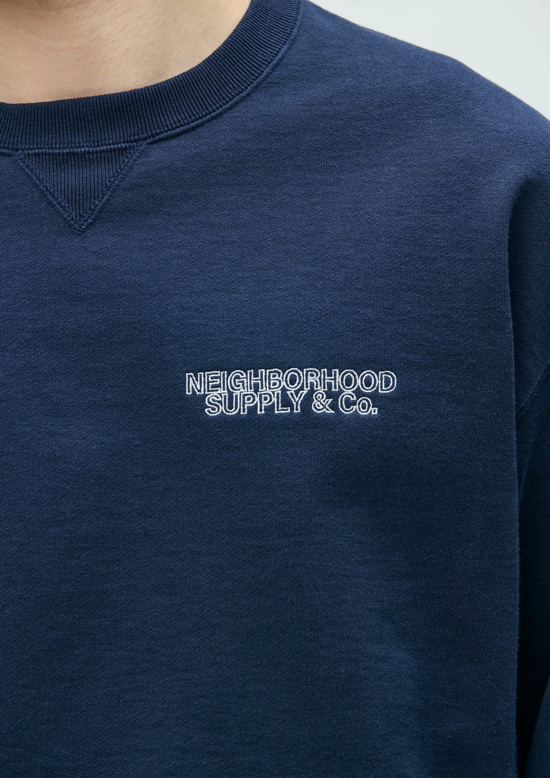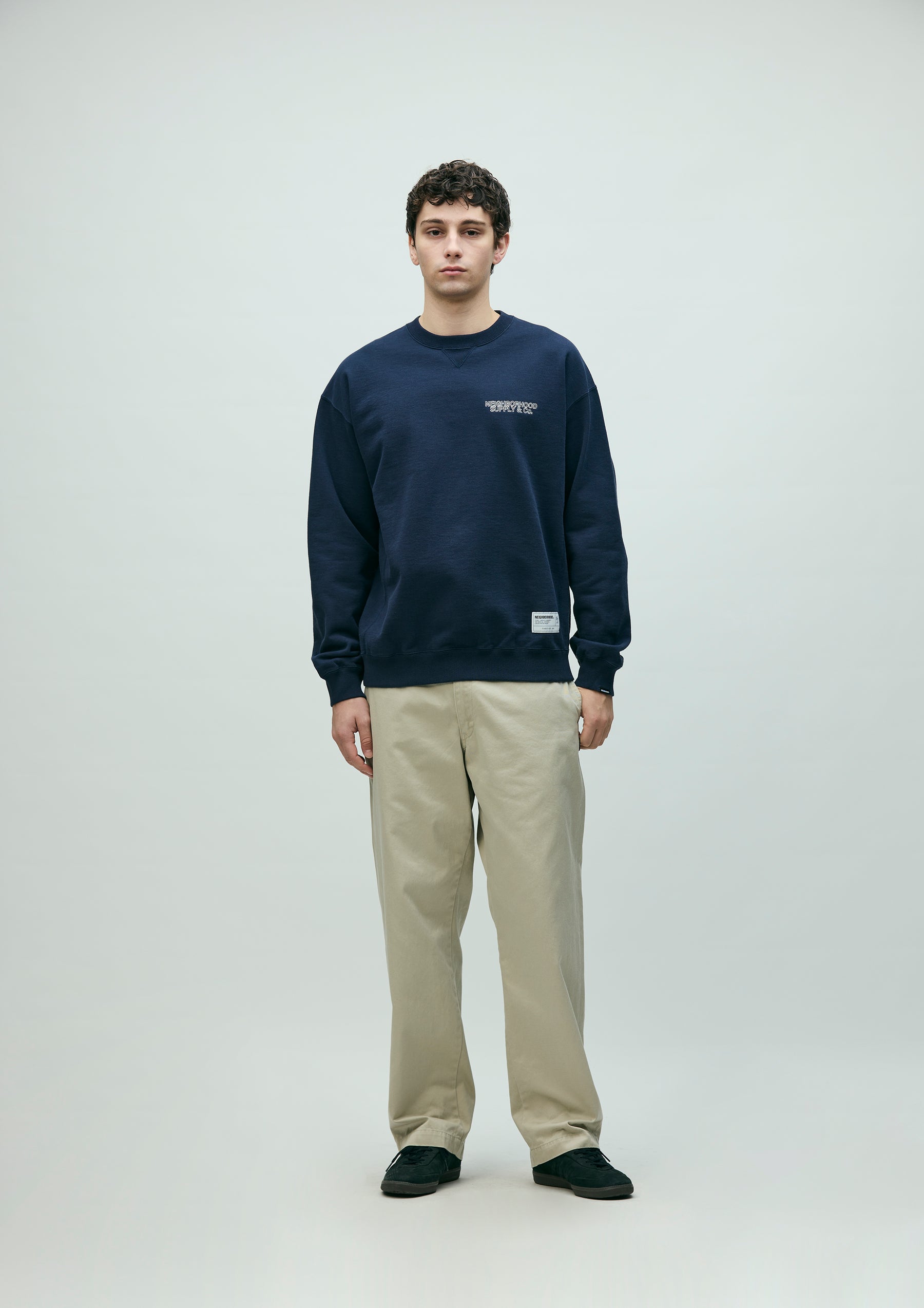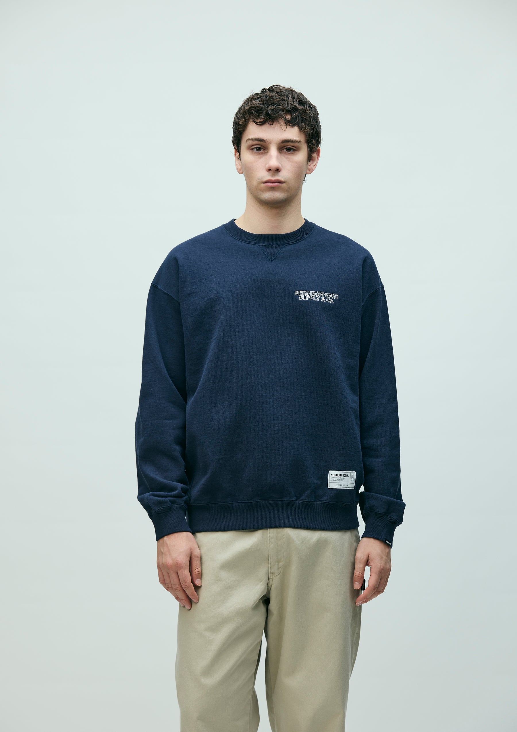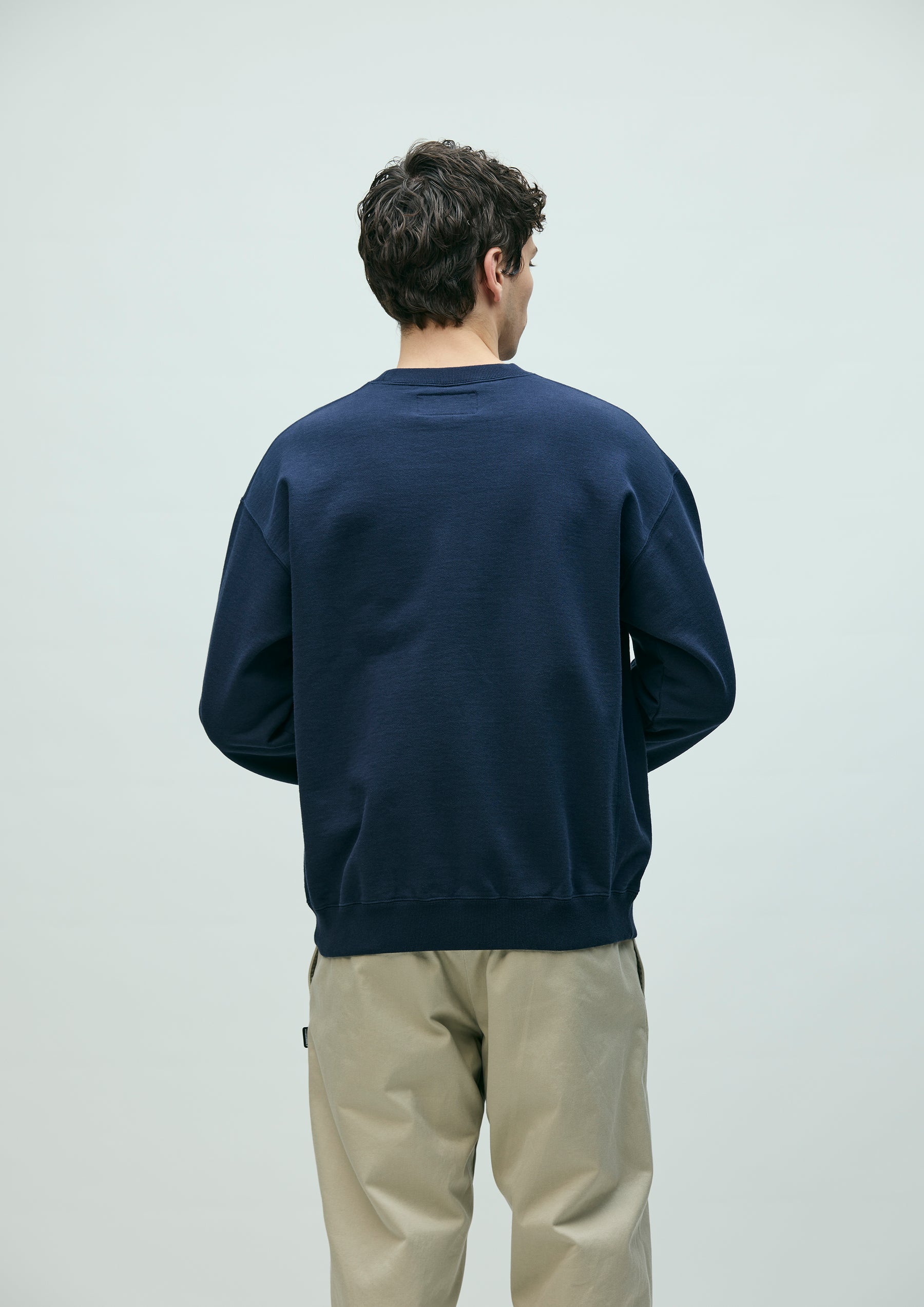 Crewneck pullover made from fleece fabric spun with organic cotton. Features an embroidered logo on the left chest. A brand tag is placed at the left hem, and a woven side label is attached at the cuff. Completed with a one-wash finish.