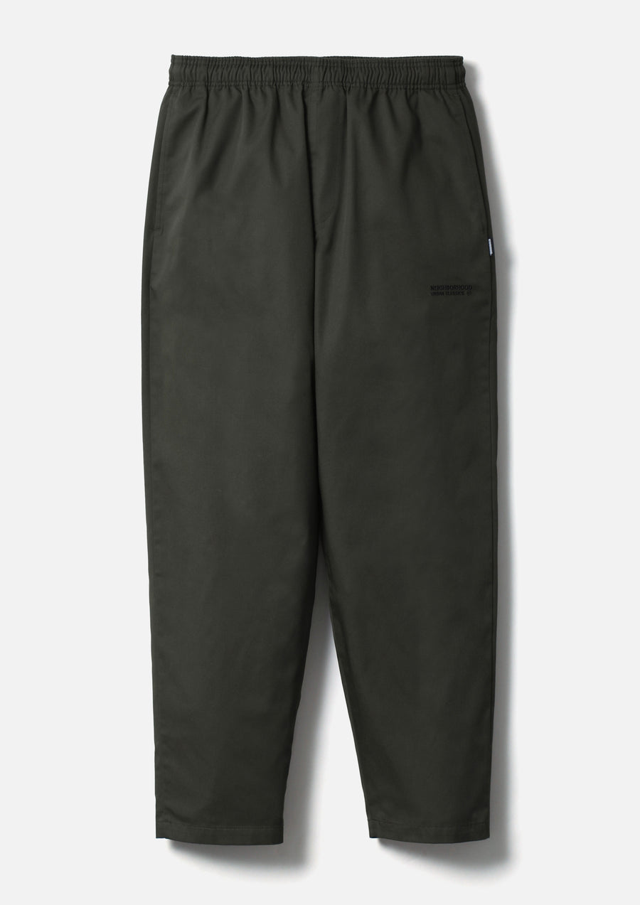 A pair of easy pants made from medium-weight twill fabric with a subtle sheen. Features an elastic waistband with an internal drawstring. Embroidered logo on the thigh. Includes a brand tag on the side seam. Relaxed silhouette.
