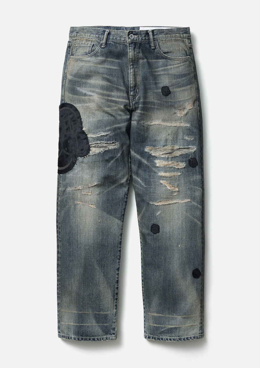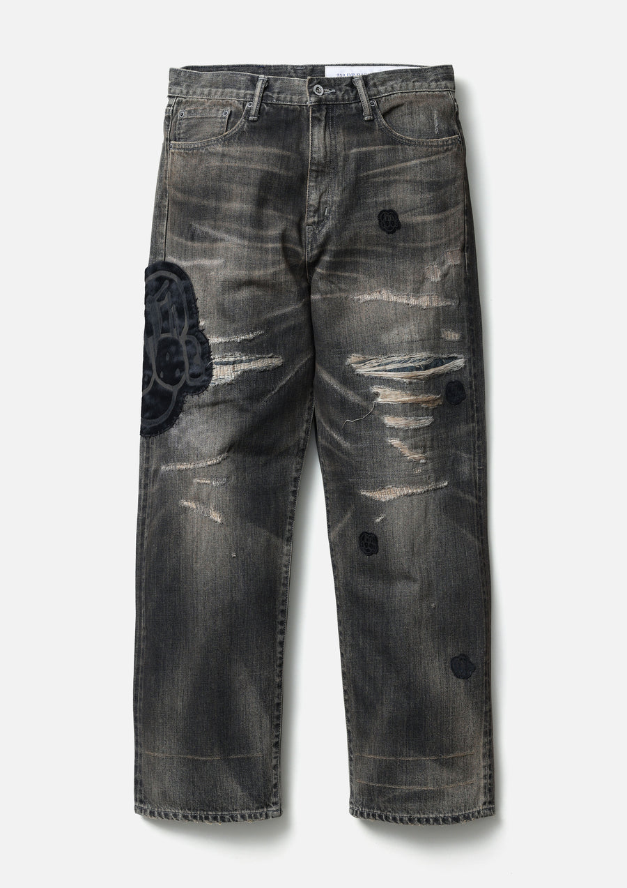 Savage denim pants featuring Finesse Pup. Crafted from original 12oz selvedge denim. Iconic motifs are expressed through cowhide patches. Distinguished by authentic aging achieved through distressing, rework processing, and heavy fading that expresses fabric deterioration. Incorporates original rivets, tack buttons, and signature tape. Classic basic silhouette with generous room through the thigh, hip, and leg opening, with subtle taper toward the hem. Collaboration with CHITO.