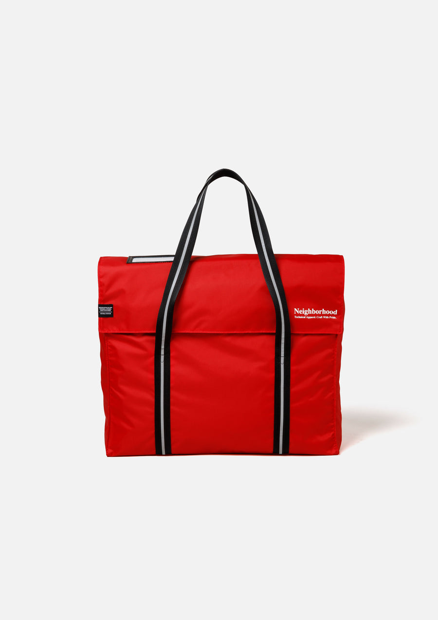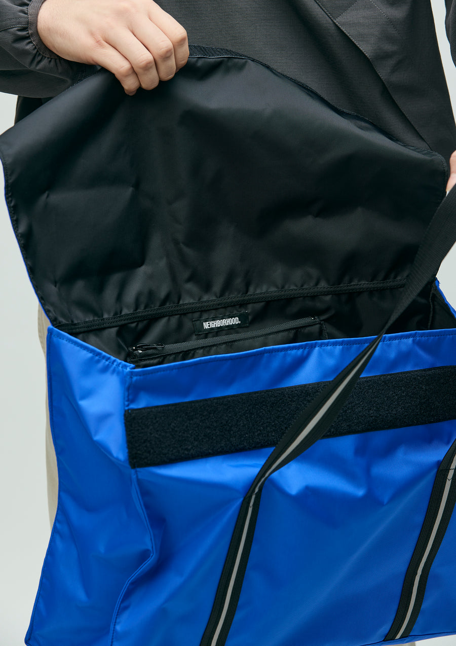 Tote bag made from nylon oxford fabric treated with Teflon for excellent durability and water repellency. Designed with a simple flap-opening structure inspired by actual postal delivery bags, allowing easy access to belongings. Features an ID card holder on the flap and an interior zip pocket for convenient storage of small items. The front is detailed with a logo print and brand tag.