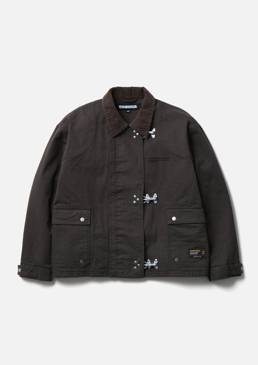 A fireman jacket made from mid-weight duck fabric with a vintage-like texture, combined with a corduroy collar. Features a front closure with a fireman buckle and snap buttons. Includes utility pockets on both sides with drainage eyelets and adjustable snap button cuffs. The left chest is embroidered with a logo, and the interior is quilted. Includes a brand tag on the pocket and side seam.