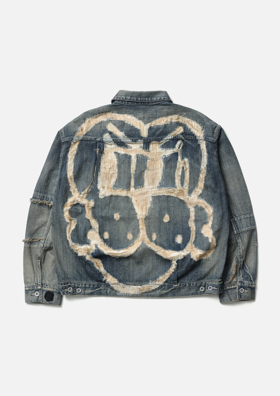 Savage denim jacket featuring Finesse Pup. Crafted from original 12oz selvedge denim. Finesse Pup are expressed through cowhide patches placed in multiple locations, and distressing with rework stitching across the entire back panel. Features diverse details including hand embroidery at the collar using reflector thread, paneled sleeves, and double-layered patch pockets. Distinguished by authentic aging achieved through distressing, rework processing, and heavy fading that expresses fabric deterioration. Incorporates original rivets and tack buttons. Includes clip tag at the side seam. Collaboration with CHITO.