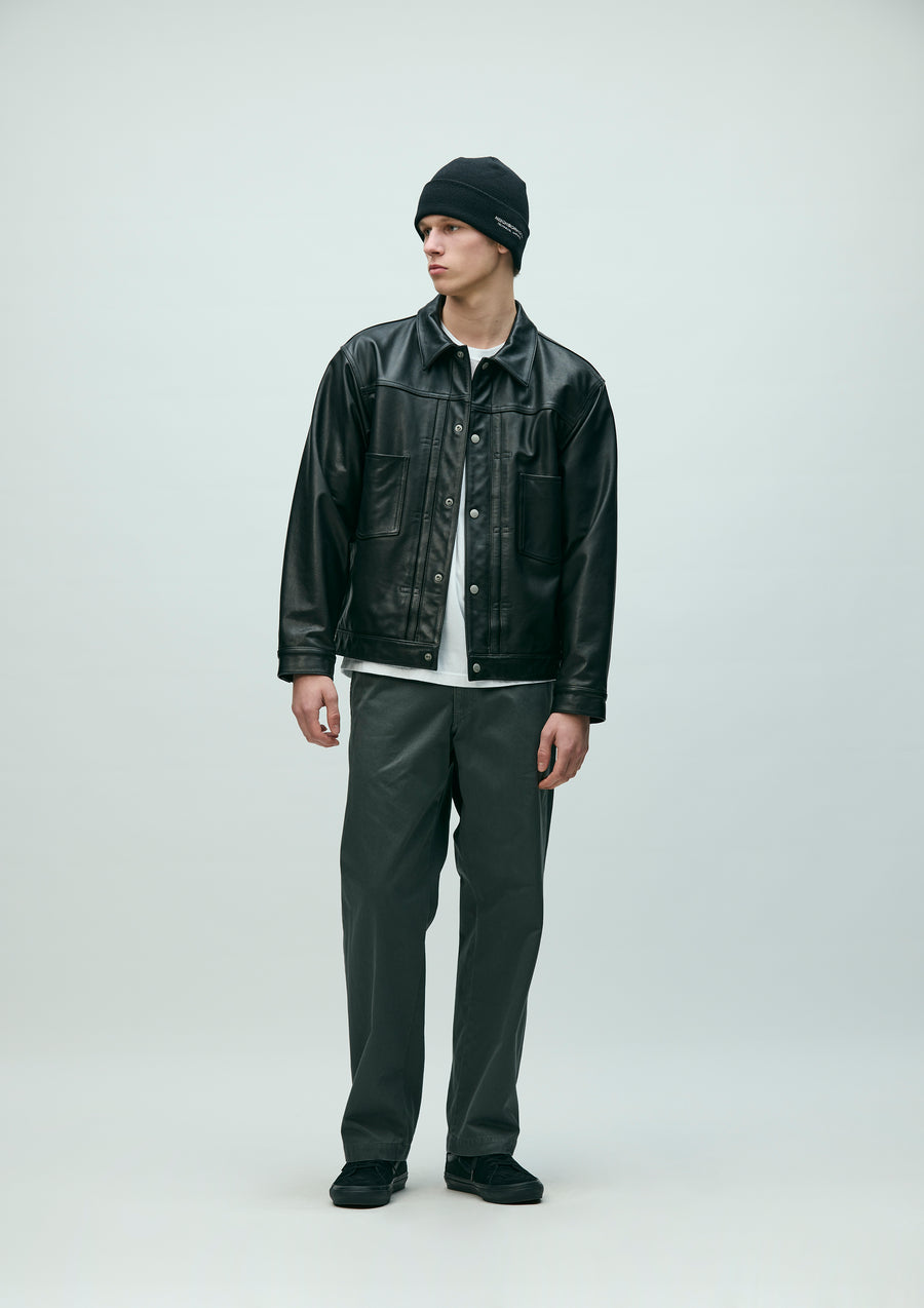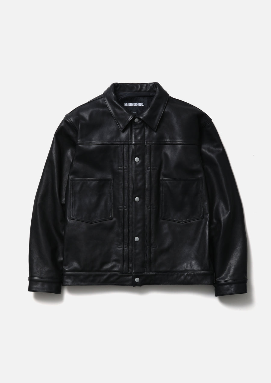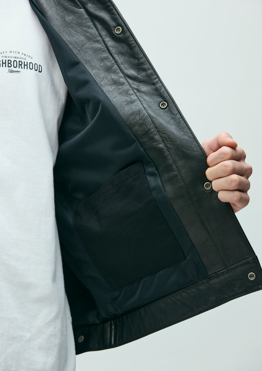2nd-type leather jacket made from cowhide. Features patch pockets on the chest, adjustable tabs on the back waistband, and an inner pocket lined with cotton fabric. Finished with original snap buttons. A woven side label is placed at the side seam. Equipped with a breathable mesh lining.