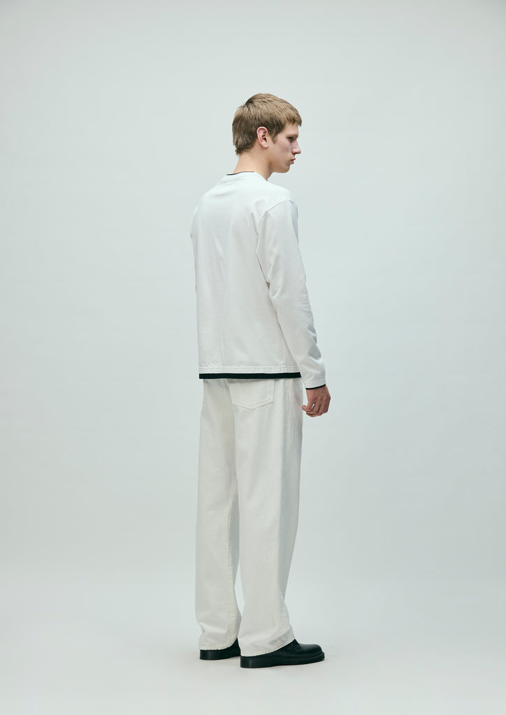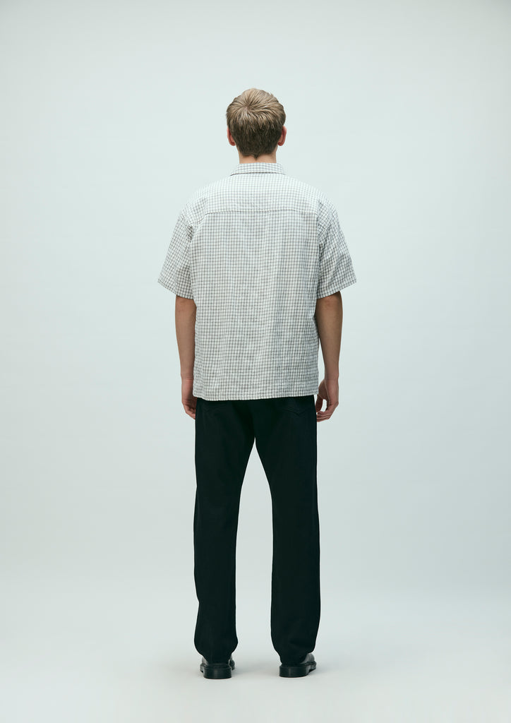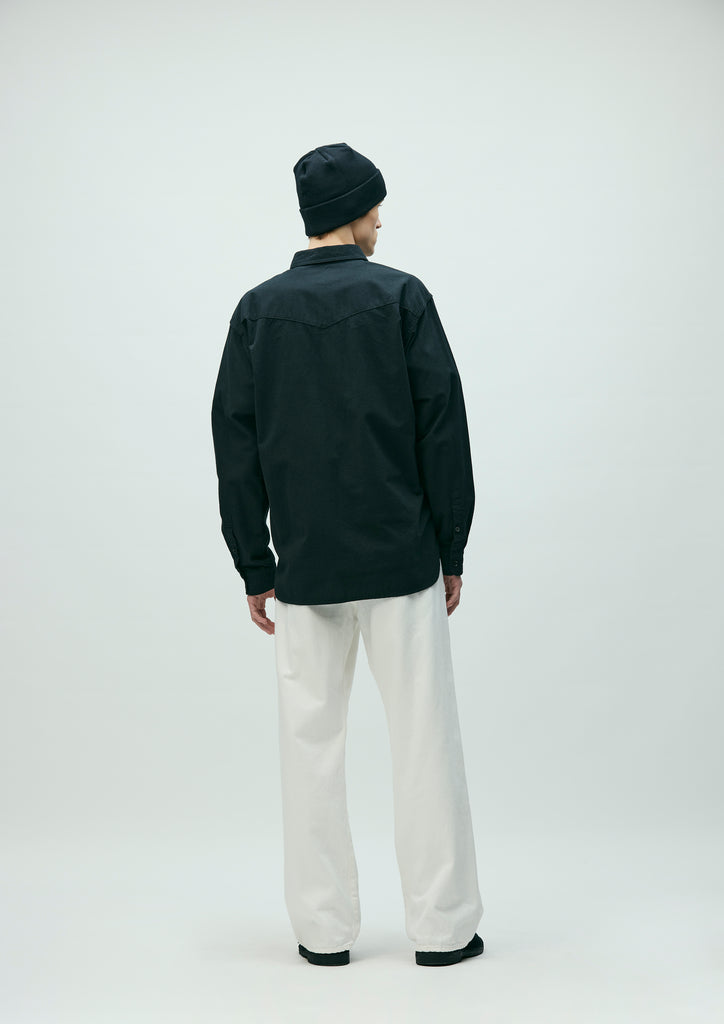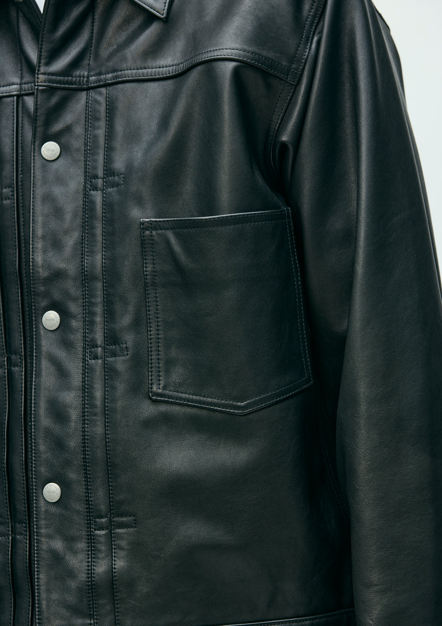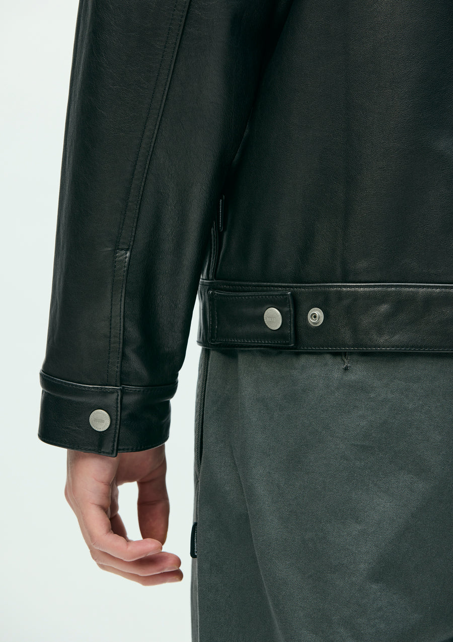 2nd-type leather jacket made from cowhide. Features patch pockets on the chest, adjustable tabs on the back waistband, and an inner pocket lined with cotton fabric. Finished with original snap buttons. A woven side label is placed at the side seam. Equipped with a breathable mesh lining.
