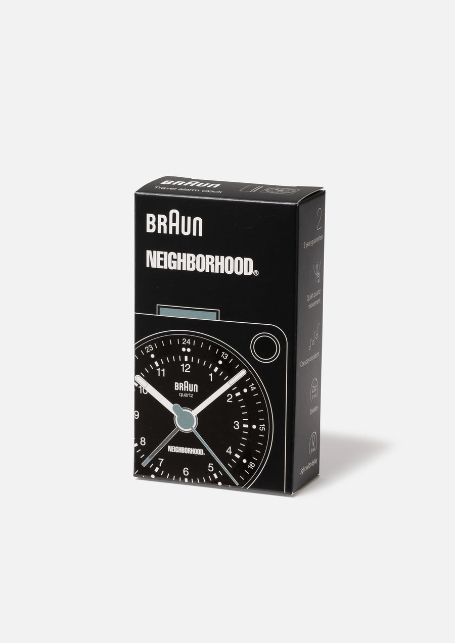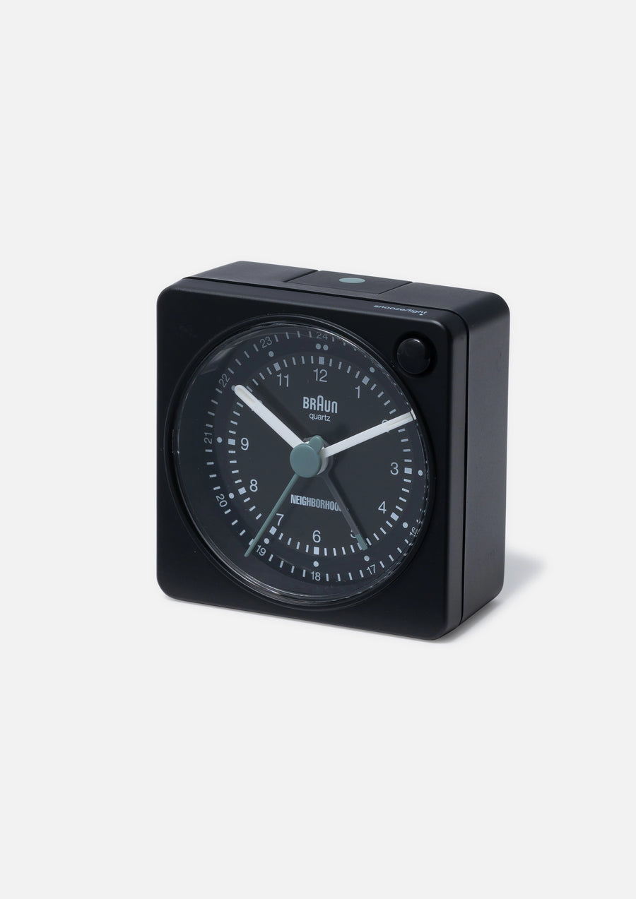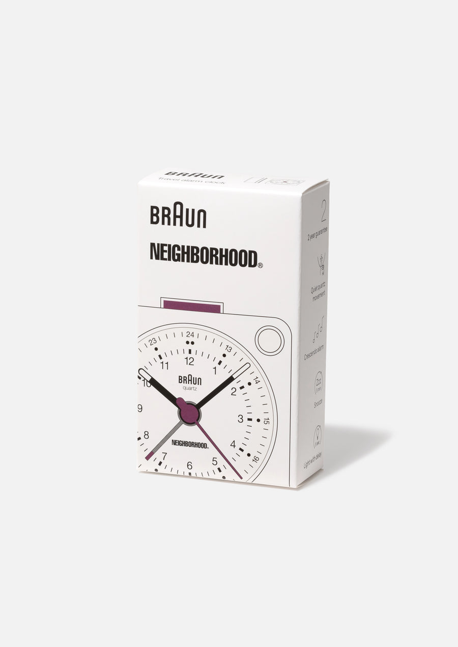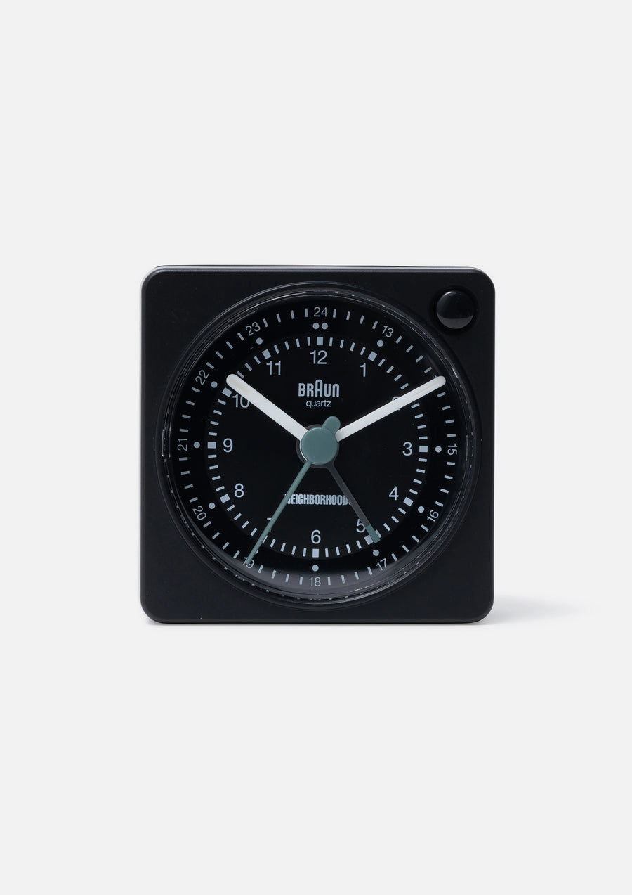 Joint work item featuring an original dial on an analog alarm clock by BRAUN, a German-based manufacturer of small electrical appliances founded in 1921. “BC02” alarm clock is a reproduction based on the “AB1 (1987),” which was selected for the permanent collection of MoMA (Museum of Modern Art, New York), and features a practical light and snooze function. Original dial with 24-hour Arabic indexes reminiscent of military watches, in addition to 12-hour notation, and the same color scheme is used in both matte and gloss for a design with depth. Quartz movement. Compact size with silent design.