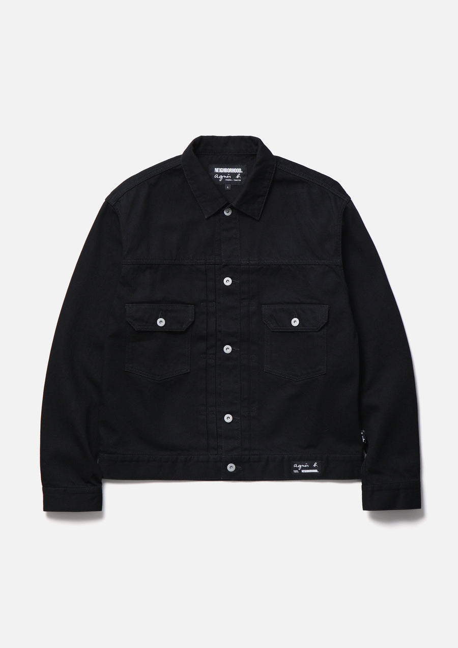 Type-2 work jacket made from durable cotton. Retains classic workwear details such as functional pockets and cuff design. Printed with both brands’ hand-written logos by Agnès Troublé. Finished with custom tack buttons. Brand tags at the left hem and side seam. Relaxed silhouette. Collaboration with agnès b.