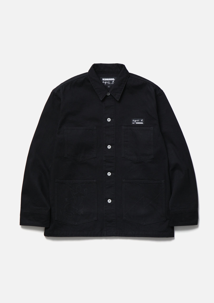 Work coverall jacket in sturdy cotton. The “Harajuku × Les Halles” themed collage combines both brands’ roots and history through photographs and graphics. Iconic “N” and lézard (lizard) motif design-stitching on the front pocket. Custom tack buttons. Brand tags at the left chest and side seam. Collaboration with agnès b.