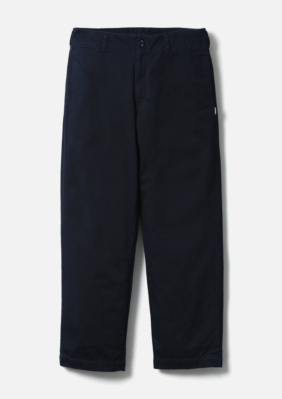 A pair of chino pants made from high-density West Point fabric, a type of chino cloth, with a bio-stone wash finish. Unlike standard chinos, it is woven with two threads for added durability and a lustrous finish. Features original four-hole buttons and a front zipper. Includes a brand tag above the hip pocket and side seam. Relaxed straight silhouette.