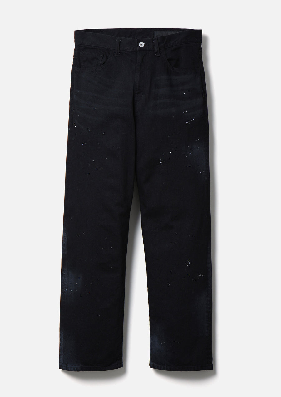 A pair of five-pocket pants made from 12oz denim fabric with distress processing for a naturally aged look. The hip pockets feature "N"-shaped design stitching. Equipped with original tack buttons. Includes a special name tag exclusive to the "BLACK & WHITE" uniform-inspired series. Brand tags and size labels are color-matched to the main body. Classic tapered silhouette with a relaxed fit through the thighs, hips, and hem.
