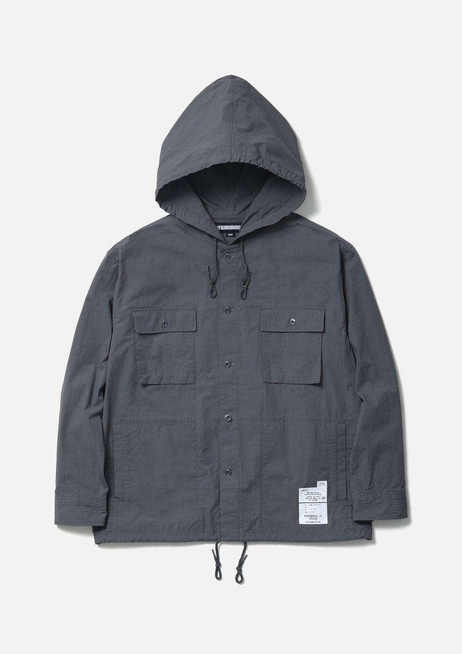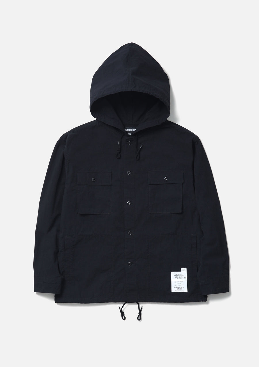A hooded shirt made from a high-density cotton/nylon blend fabric with a distinctive textured surface. The hem includes a spindle for size adjustment. Embroidered logo on the back yoke. Equipped with original four-hole buttons, a dedicated name tag on the left hem, and a brand tag on the side seam. One-wash finish.