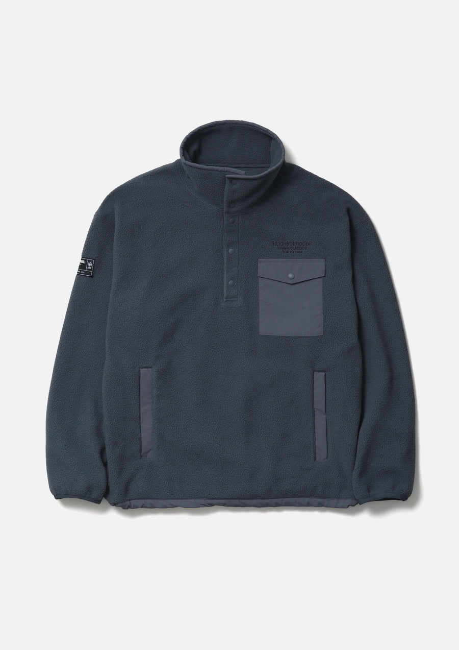 A stand collar pullover made of lightweight boa fabric with excellent heat retention, using POLARTEC Thermal Pro® (100% recycled polyester). Features a patch pocket on the left chest and zippered pockets on both sides. An adjustable elastic spindle is built into the hem. Includes an embroidered logo on the left chest and a brand tag on the side seam.