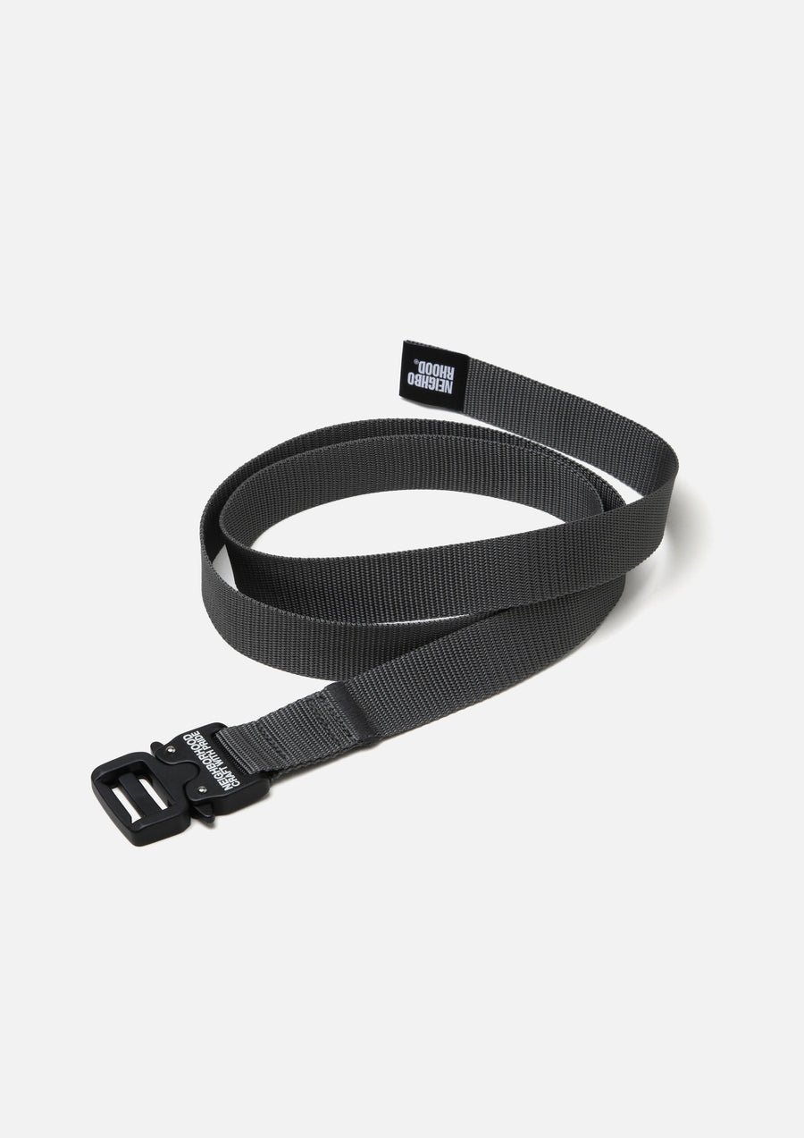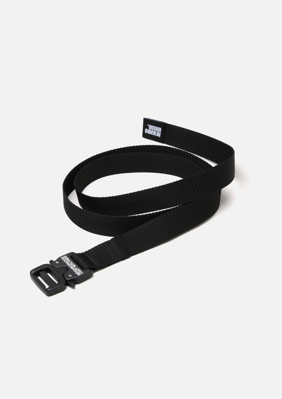A tape belt featuring an original aluminum buckle with a quick-release mechanism. The buckle is laser-engraved with a logo. A name tag is placed at the belt tip. Total length: 1250mm.