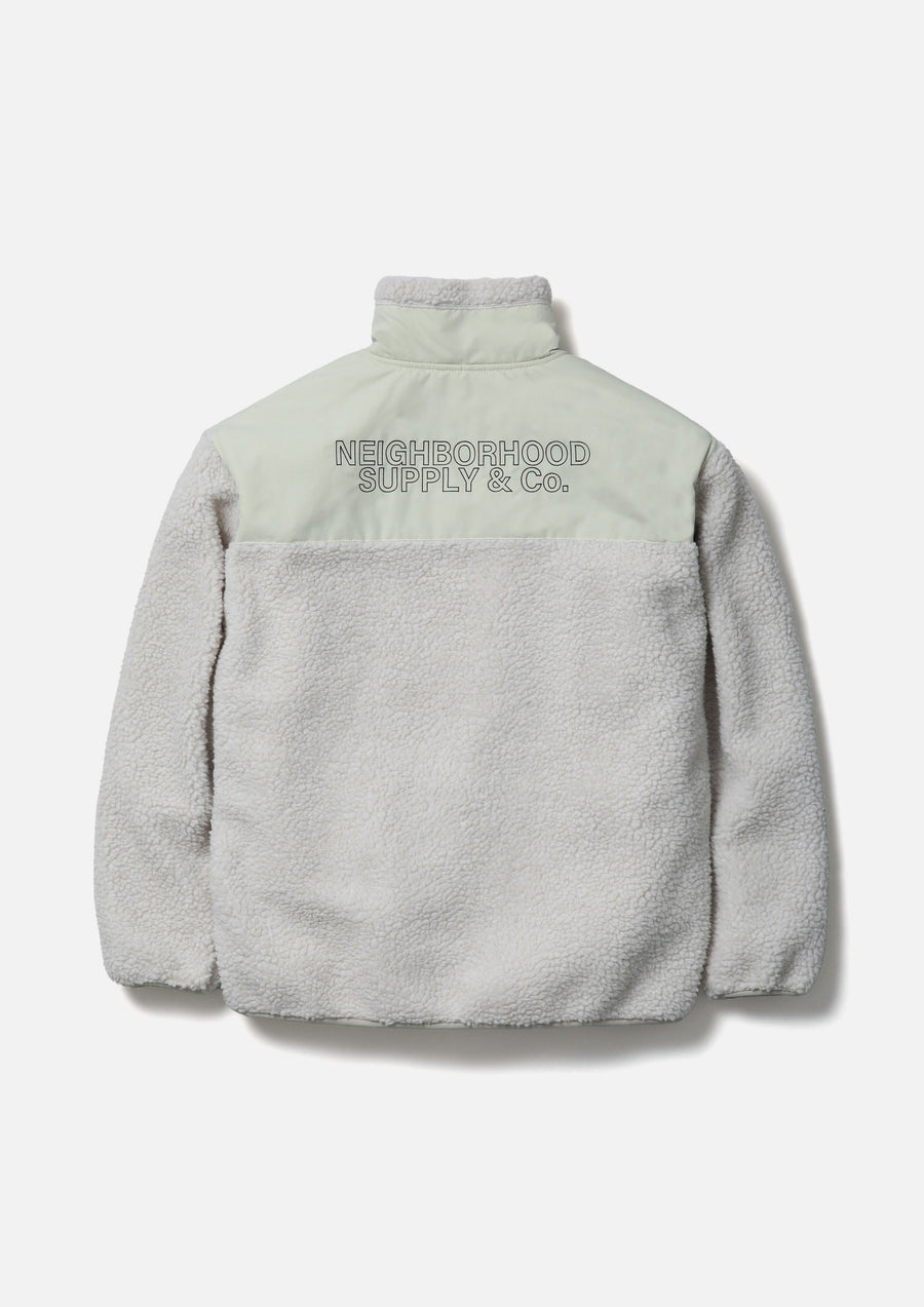 A fleece jacket made with voluminous boa fleece fabric combined with dry-touch nylon taffeta. Embroidered logo on the left chest and back. The lining features polyester mesh fabric. A brand tag on the left hem and near the pocket opening.