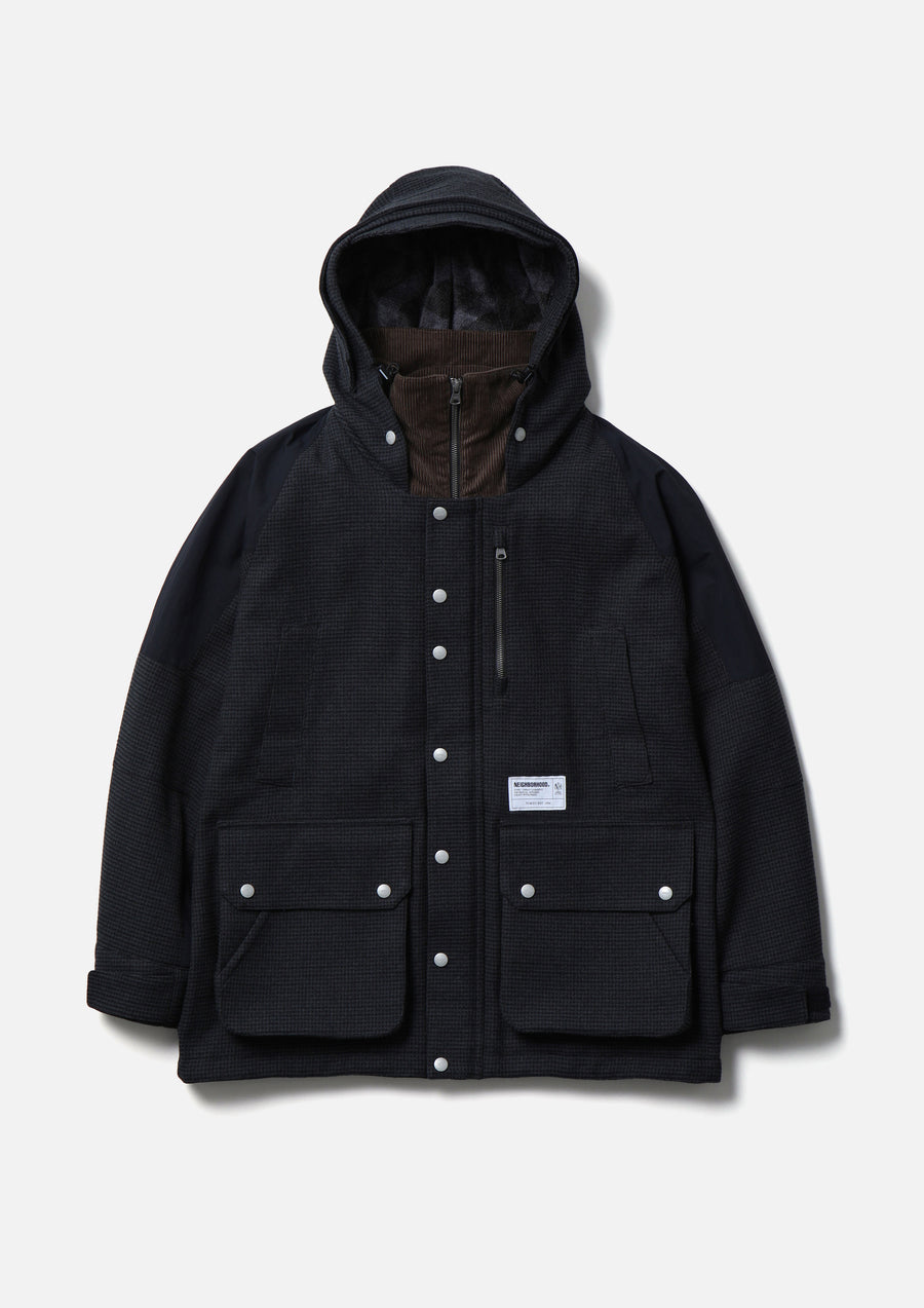 A mountain parka jacket made from an original wool-like houndstooth check fabric blended with SOLOTEX® yarn. The front has a double zipper and snap button closure. The raglan sleeves feature 3D darts. Equipped with gusseted pockets with drainage eyelets and a large flap pocket on the back. The hem includes an adjustable elastic spindle. A brand tag is attached.