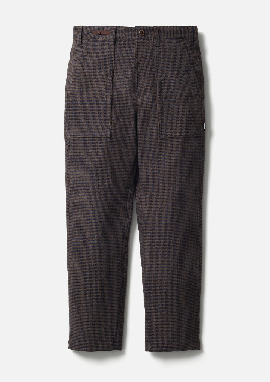 A pair of baker pants made from SOLOTEX® blended glen check fabric. Functional details include zippered side pockets, flap back pockets, and adjustable parachute buttons. Equipped with an original front zipper and a brand tag on the side seam. Features a gusseted crotch for a clean silhouette.