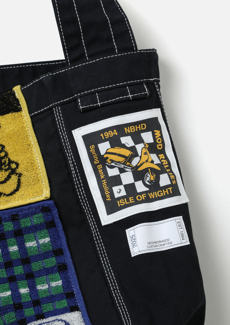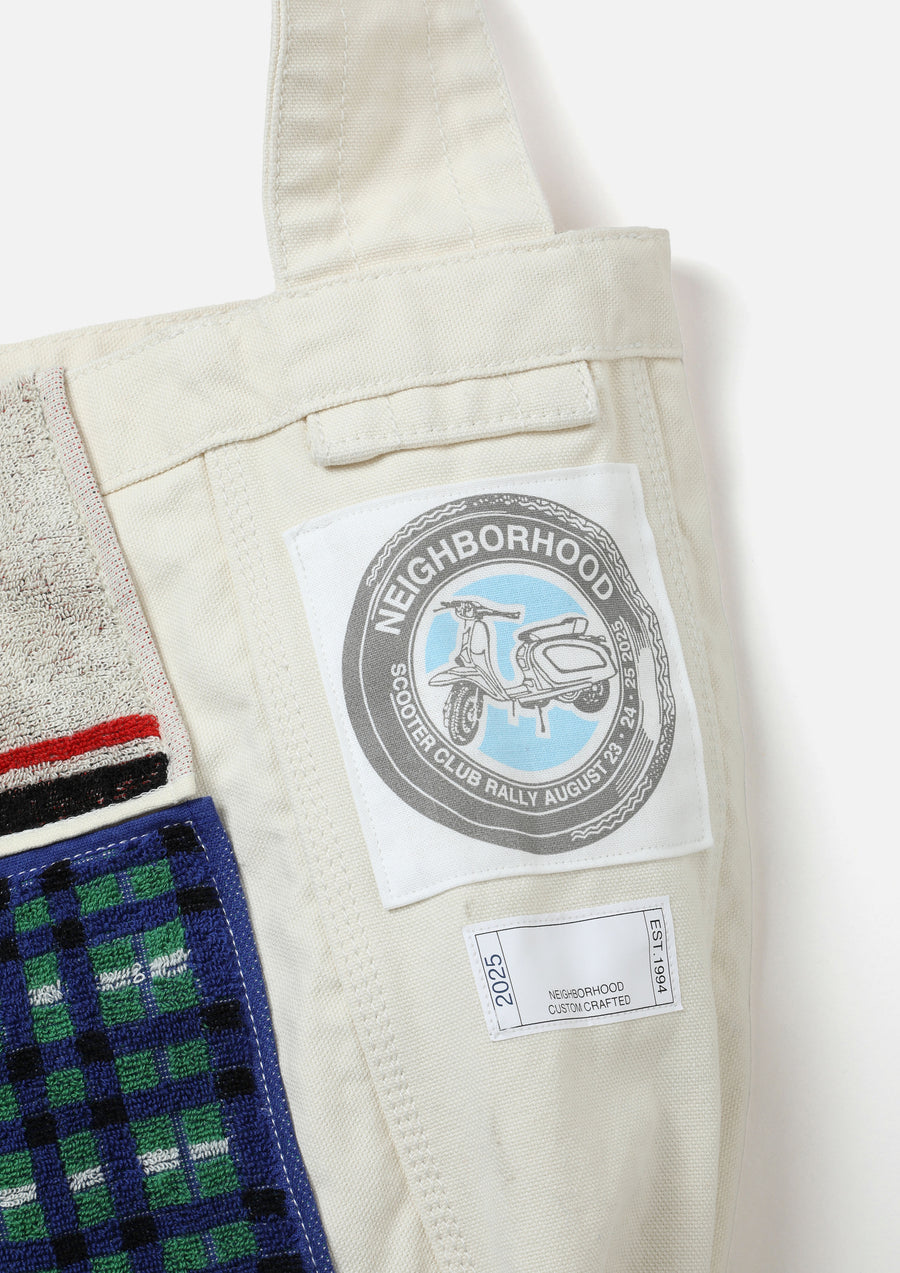 A newspaper bag made from No. 8 canvas with high durability, treated with bio-stone wash processing. One side is decorated with an original pub towel, and a scooter motif patch is placed on the side. Comes with a dedicated name tag for custom-crafted items.