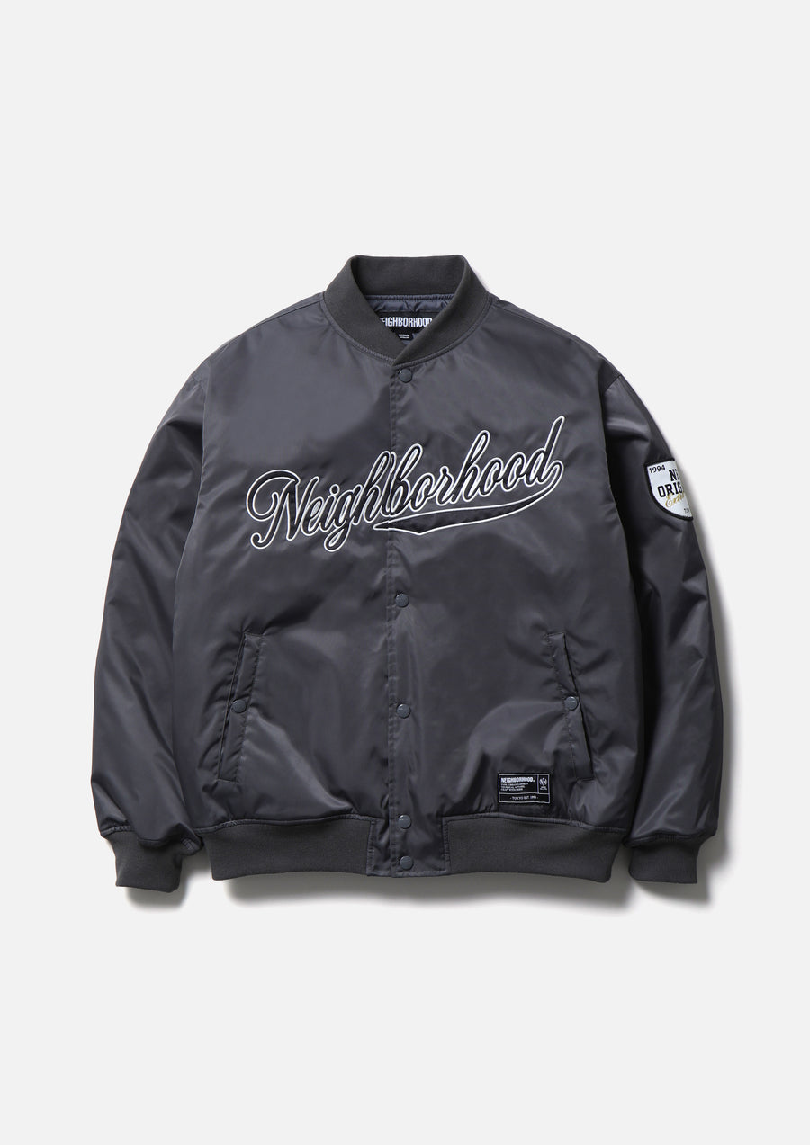 A baseball jacket made from tough nylon twill fabric with moderate thickness and firmness. Features a large embroidered satin patch logo across the front and a combination of printed and embroidered patches on the left sleeve. Equipped with original snap buttons. A brand tag on the left hem and on the side seam.