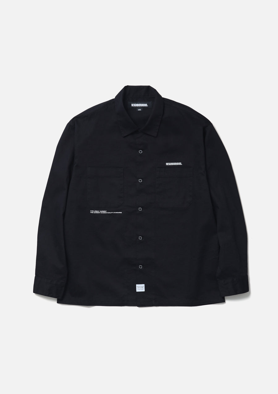 A work shirt made from mid-weight katsuragi fabric with a natural touch. Maintains a classic work shirt design with standard patch pockets. The left pocket includes a pen holder. Embroidered logo on the left chest and printed text below the right pocket. Equipped with original four-hole buttons, a brand tag on the placket and side seam. One-wash finish.