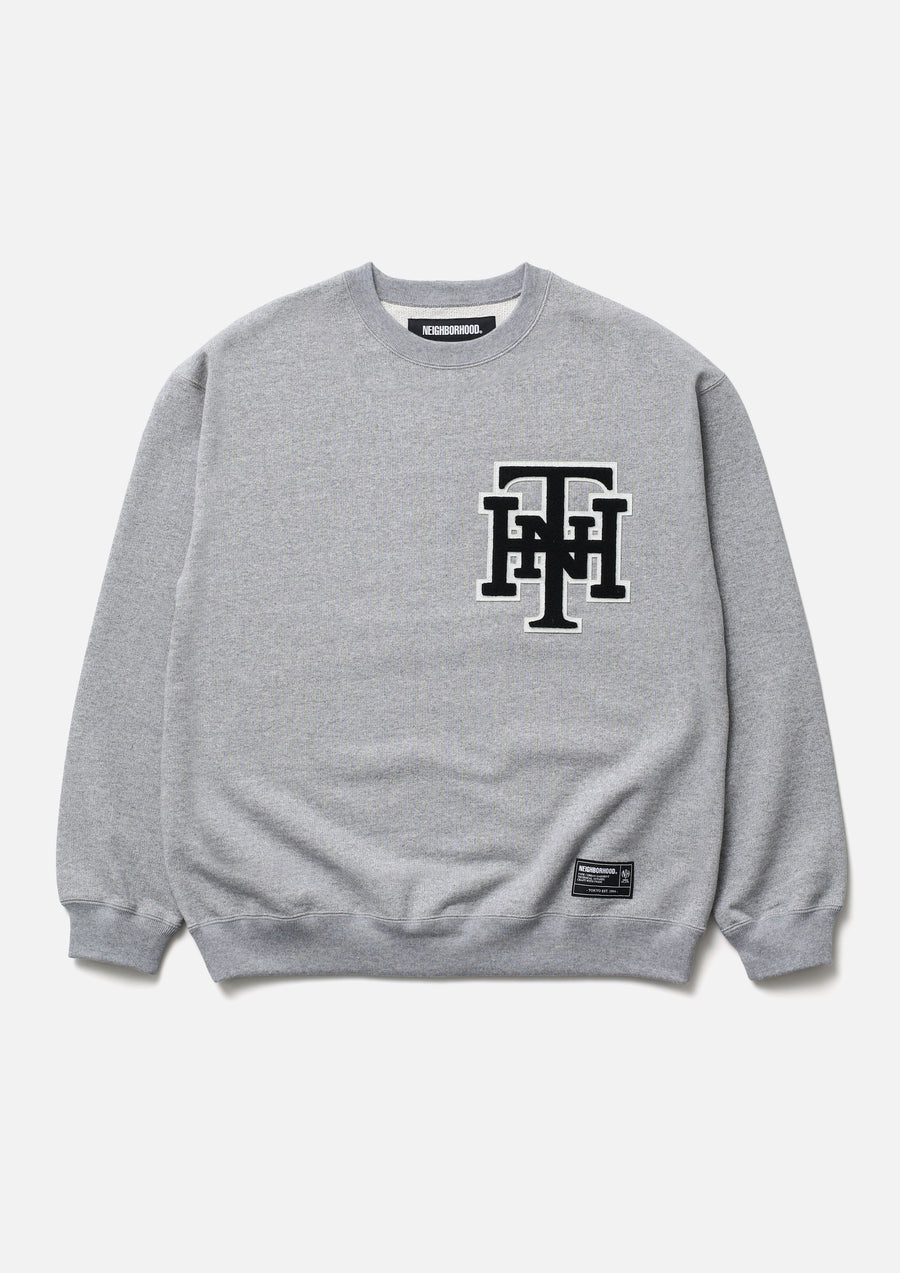 Crewneck pullover in heavy fleece-back material using open-end American cotton yarn for the face thread. Features logo and motifs placed via patches and print. Includes brand tag at the left hem and clip tag at the side seam. One-wash finish.