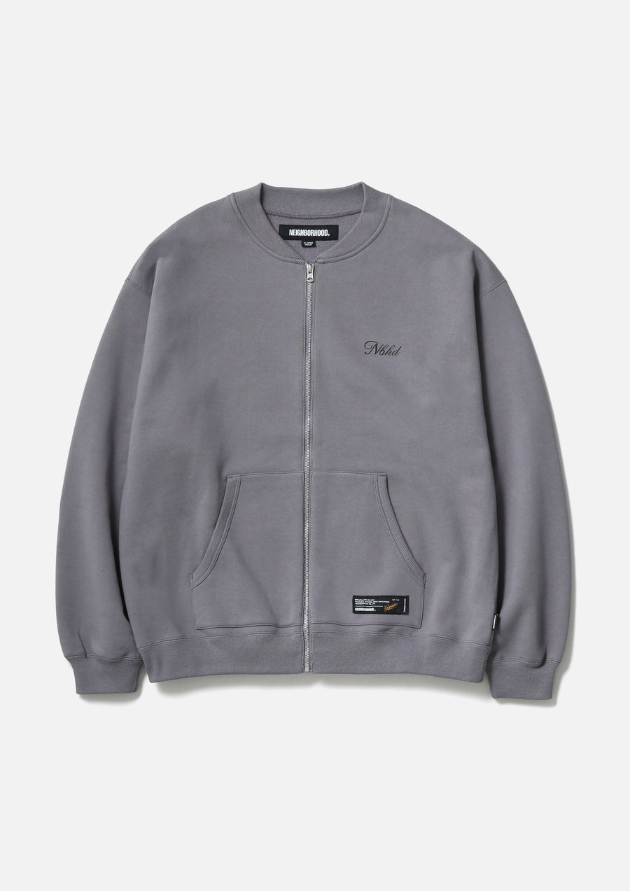 A blouson made of fleece-backed fabric, brushed before dyeing to minimize lint shedding. Printed logos on the left chest and back. Features an original zipper pull and a brand tag on the side seam.