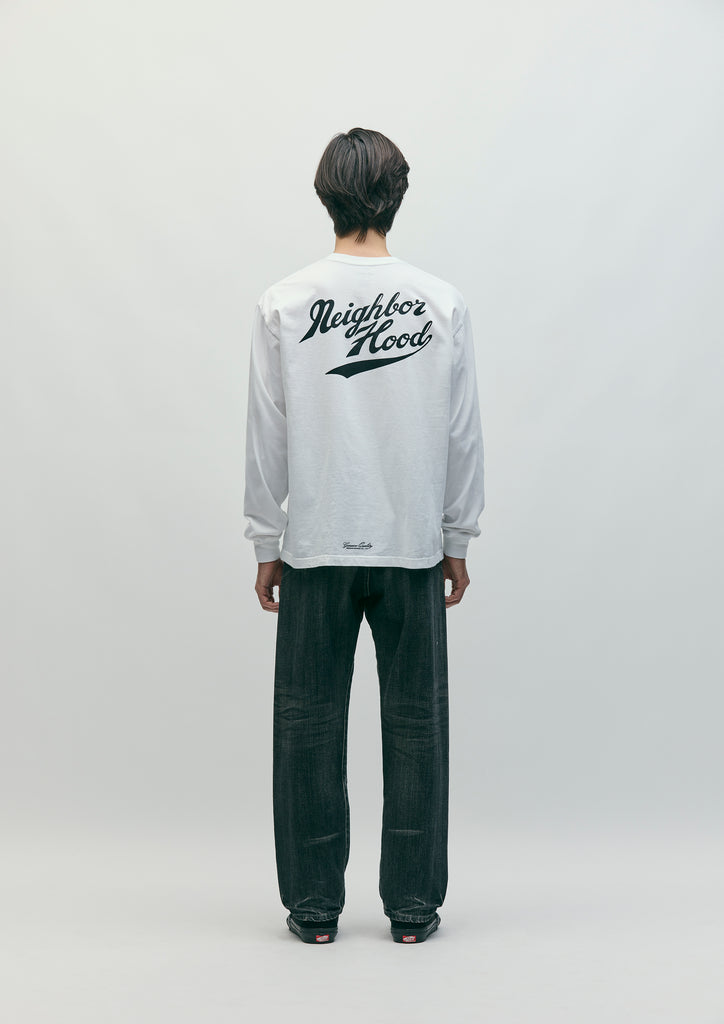 A crew neck cut-and-sew made of jersey fabric with a unique melange texture. Features a patch pocket on the left chest and a printed logo on the right sleeve. Includes a brand tag on the side seam.