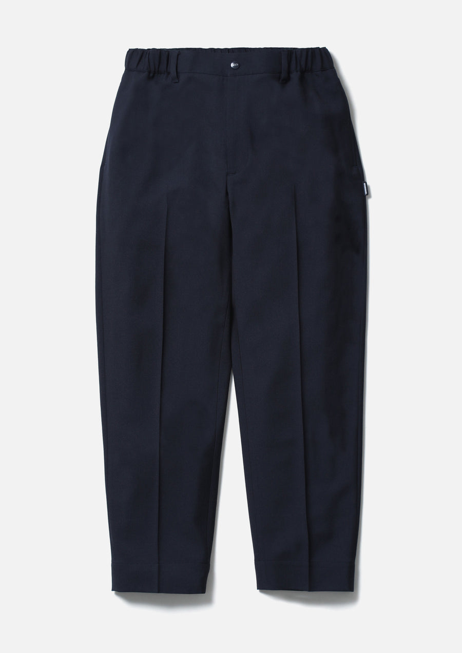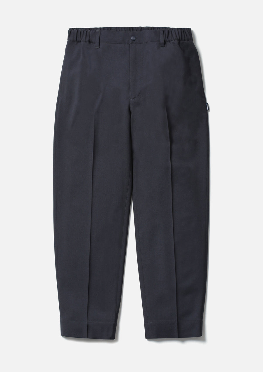 A pair of tapered pants made from a wool blend fabric using non mulesing wool and recycled polyester for a soft feel. Features flap hip pockets. Equipped with original snap buttons and a front zipper. Includes brand tags on the pockets and on the side seam. Tapered silhouette with center creases.