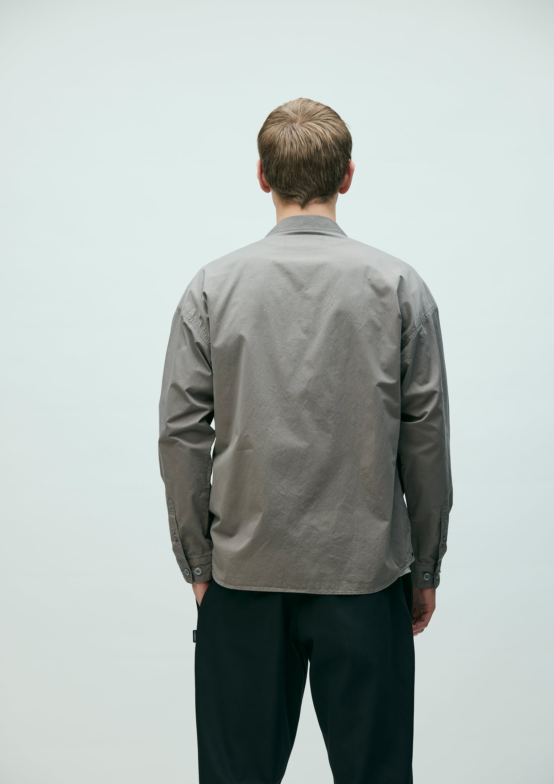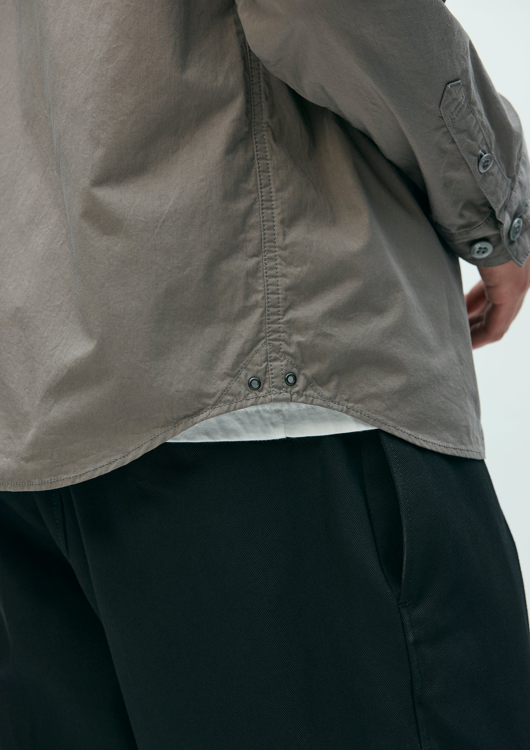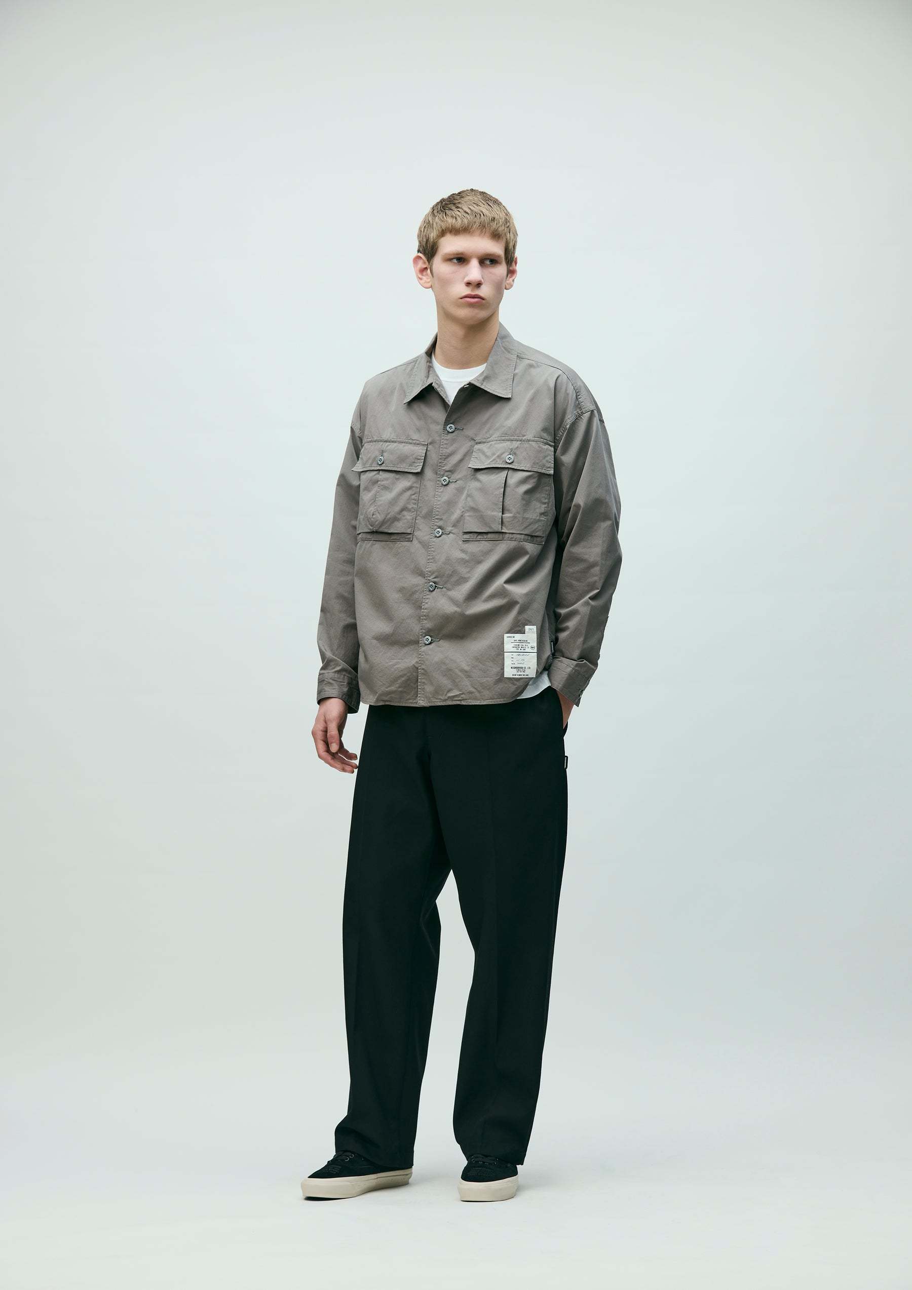 Utility shirt crafted from high-density satin material woven with fine-count yarns. Lightweight with a balance of softness and structure for comfortable wear. Features gusseted chest pockets with ample storage. A brand tag is placed at the left hem and inside the front placket, with a woven side label at the side seam. Finished with original buttons and a one-wash process.