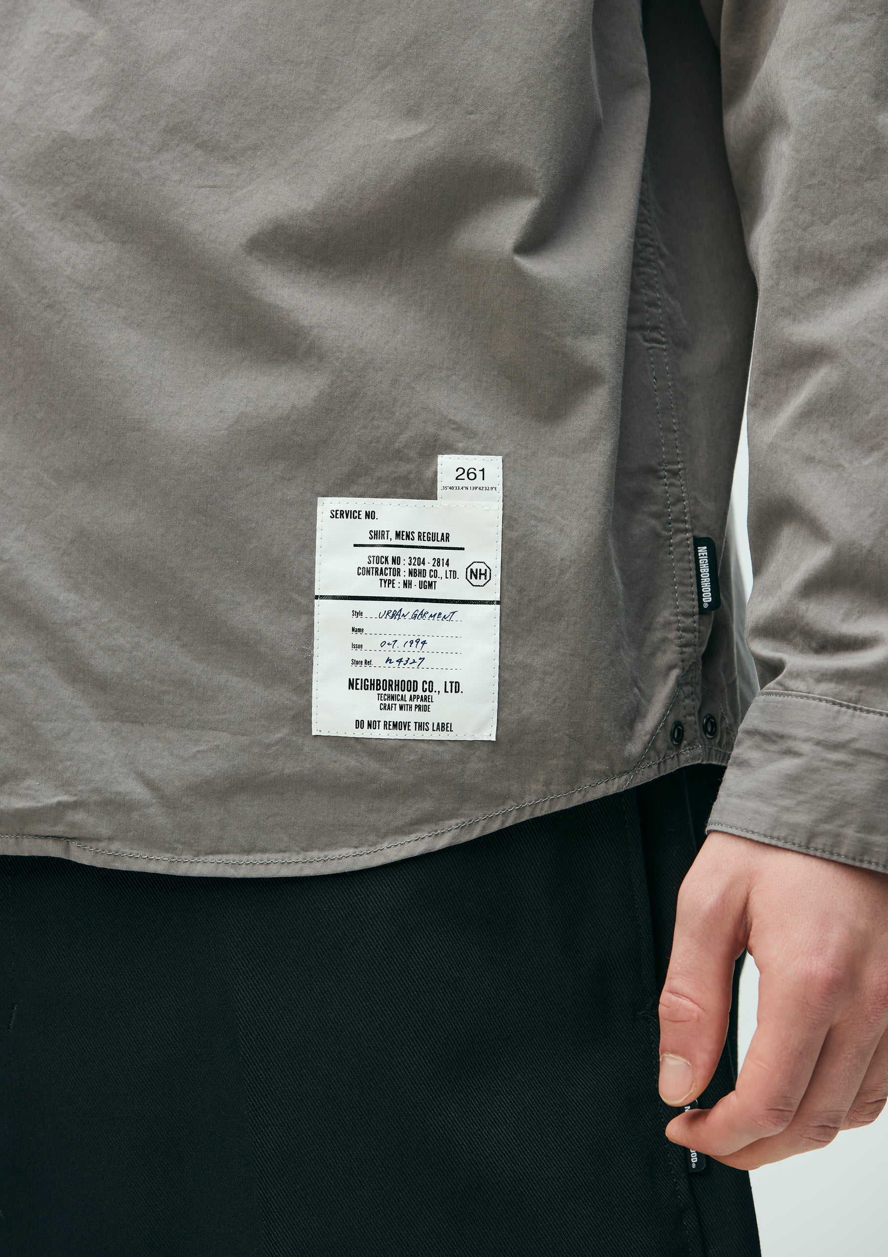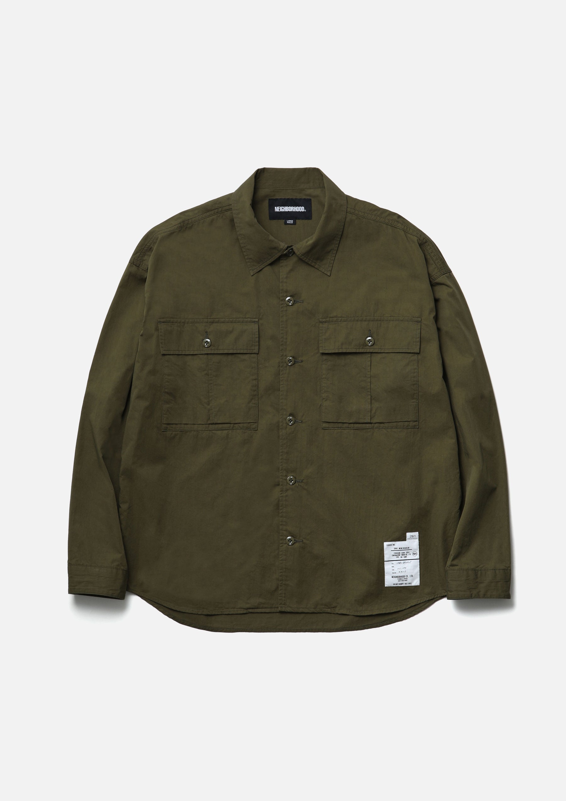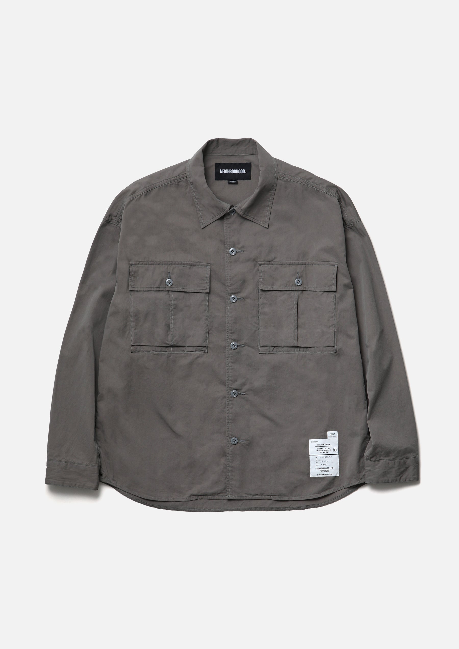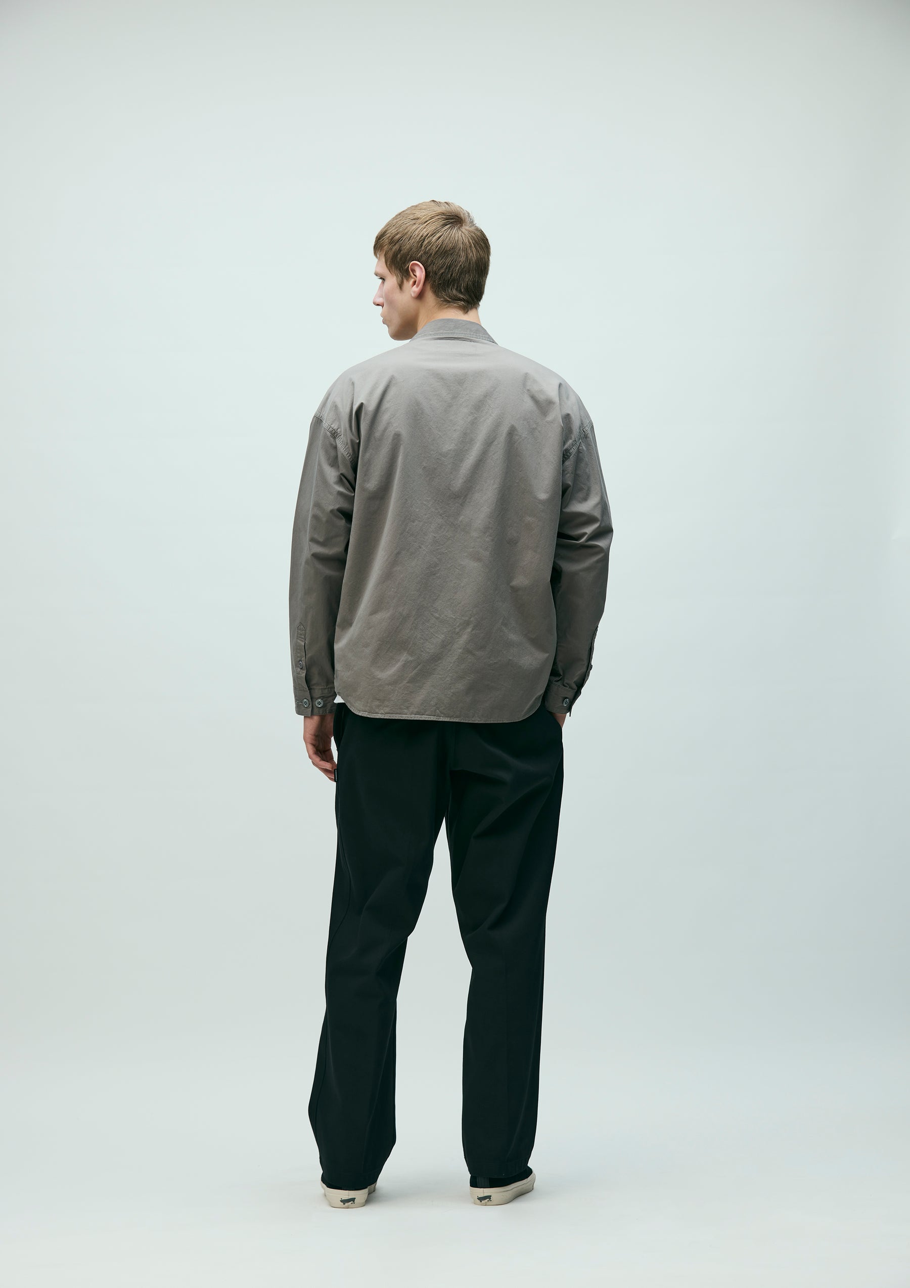 Utility shirt crafted from high-density satin material woven with fine-count yarns. Lightweight with a balance of softness and structure for comfortable wear. Features gusseted chest pockets with ample storage. A brand tag is placed at the left hem and inside the front placket, with a woven side label at the side seam. Finished with original buttons and a one-wash process.