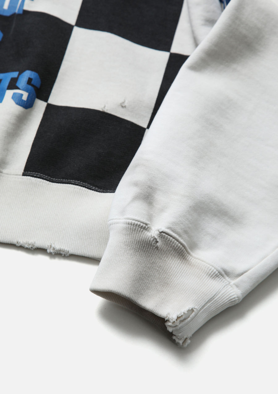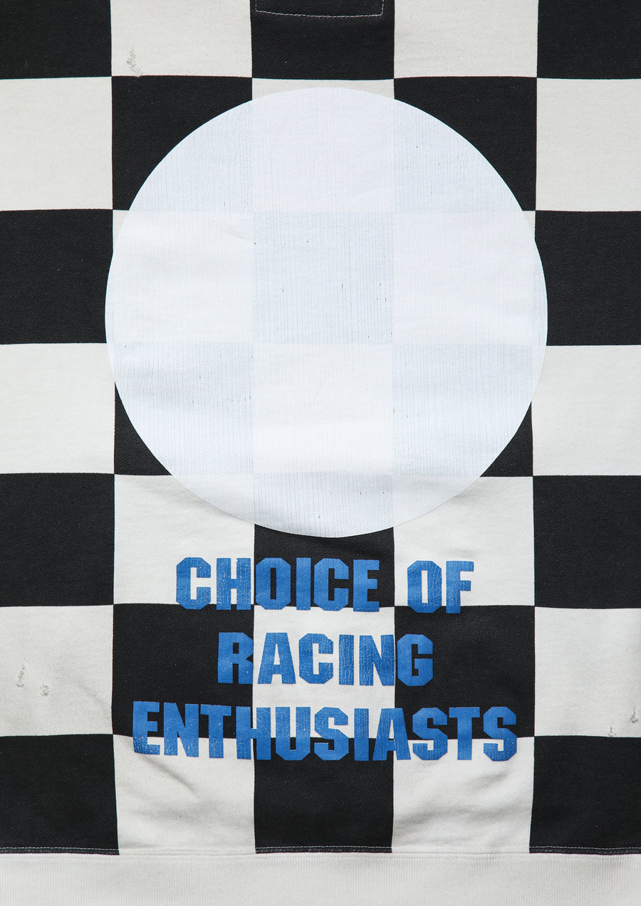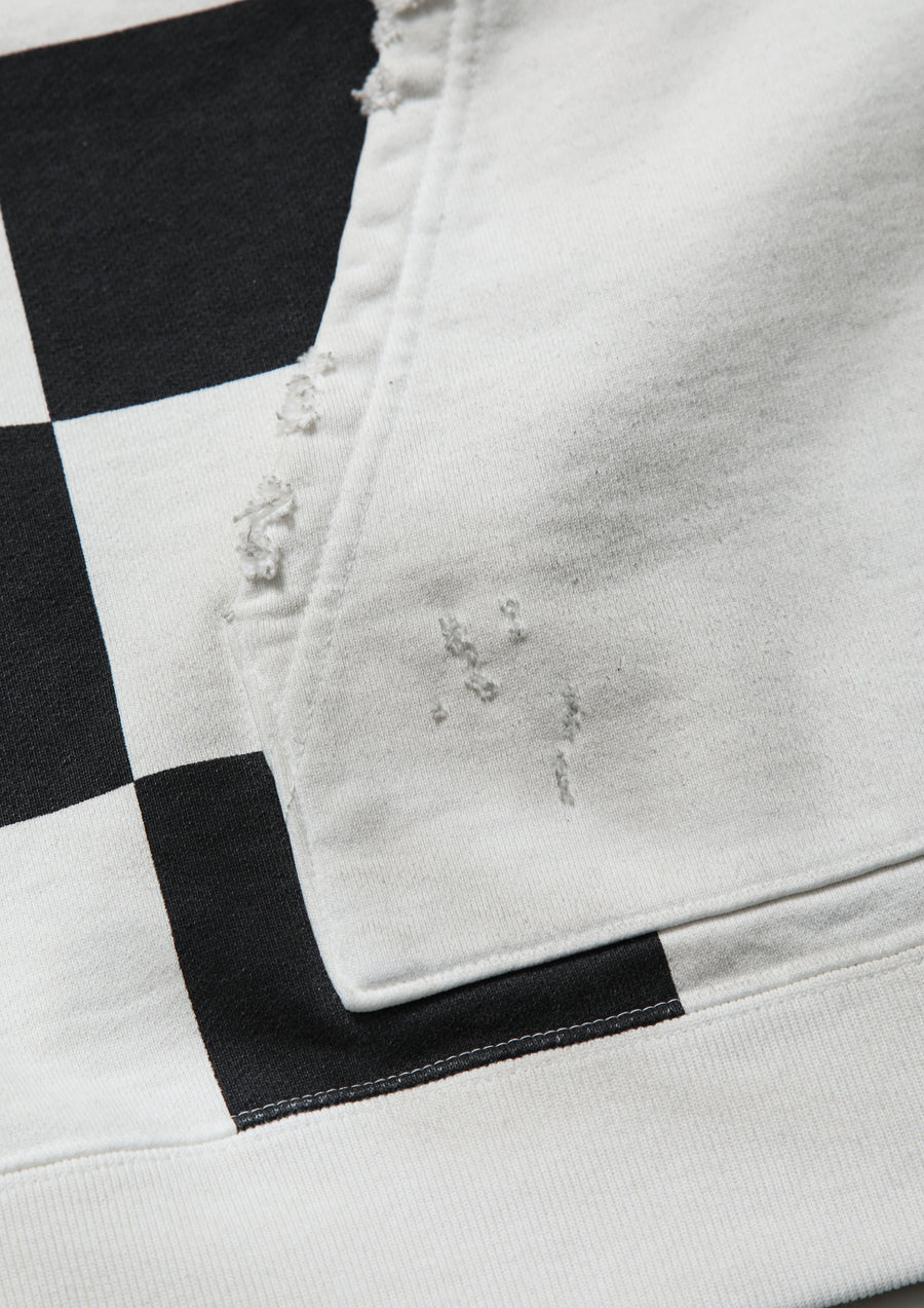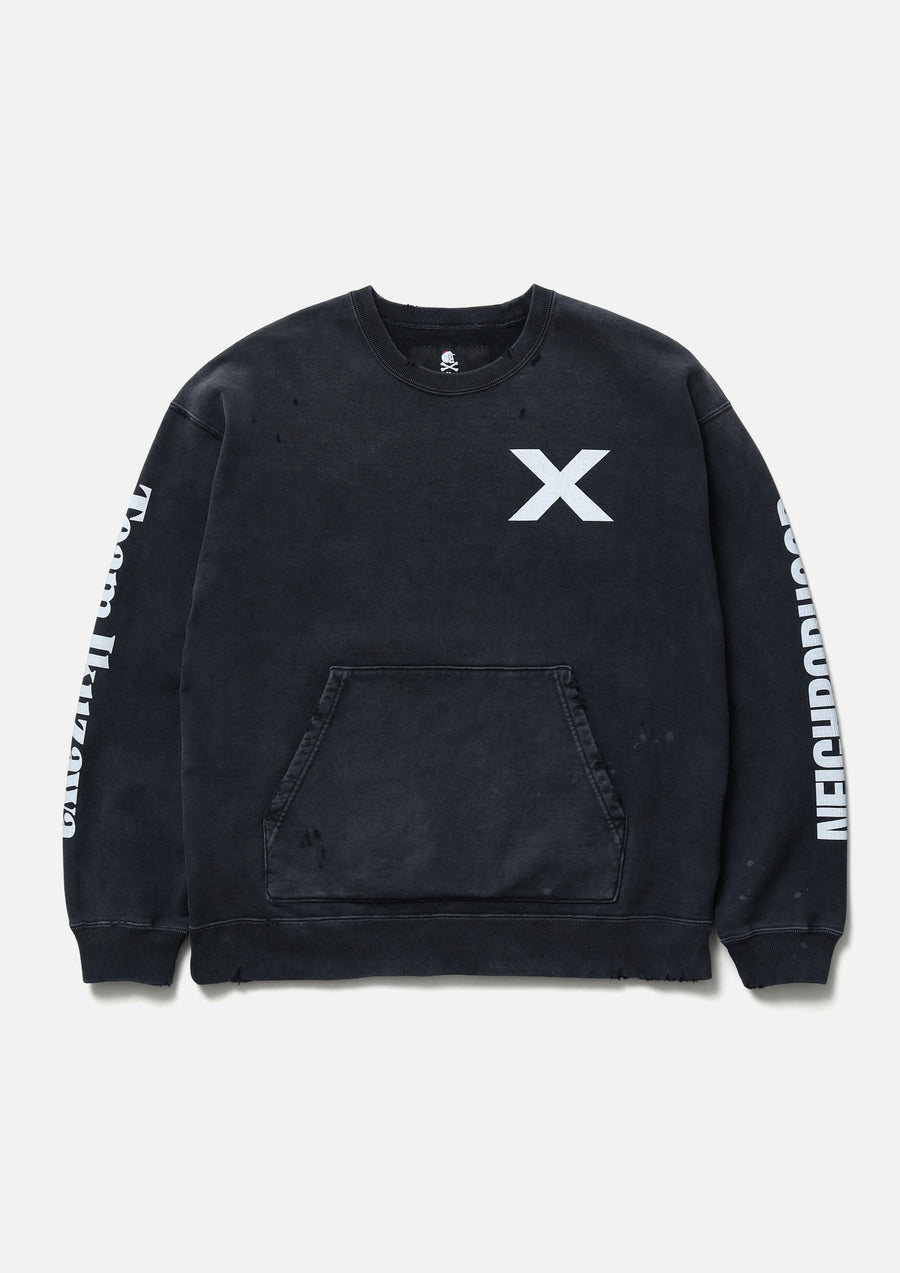 Crewneck pullover made from cotton fleece, finished with a savage treatment. Realistic aging is reproduced through a combination of garment dyeing, staining, distressed holes, and crack prints. Features printed graphics and logos. A muff pocket is placed on the front. A woven side label is attached at the side seam. Collaborative model with Team Ikuzawa.