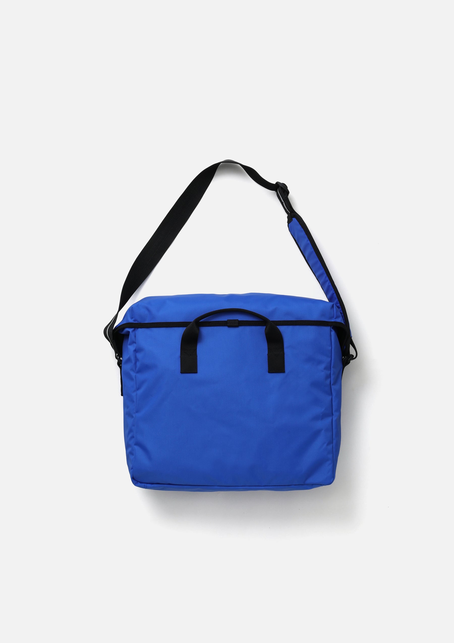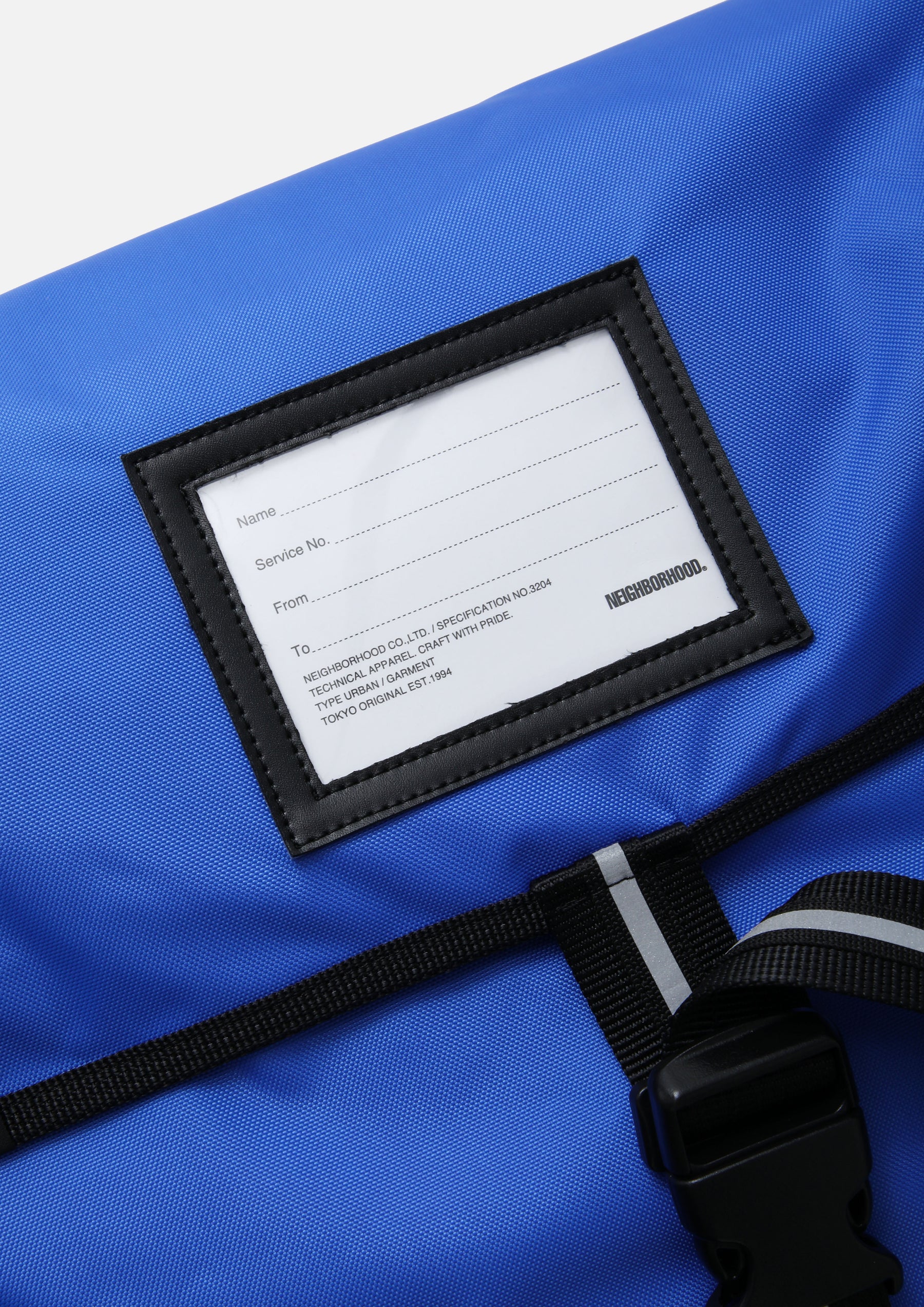 Messenger bag made from nylon oxford fabric treated with Teflon for excellent durability and water repellency. Inspired by actual postal delivery bags, it features a front ID card holder and a thickly padded shoulder strap to reduce strain. The reflective tape, which maintains visibility even when wet, is printed with the logo. Combining ample storage capacity with durability, this design is suitable for a wide range of uses, from cycling to everyday wear.