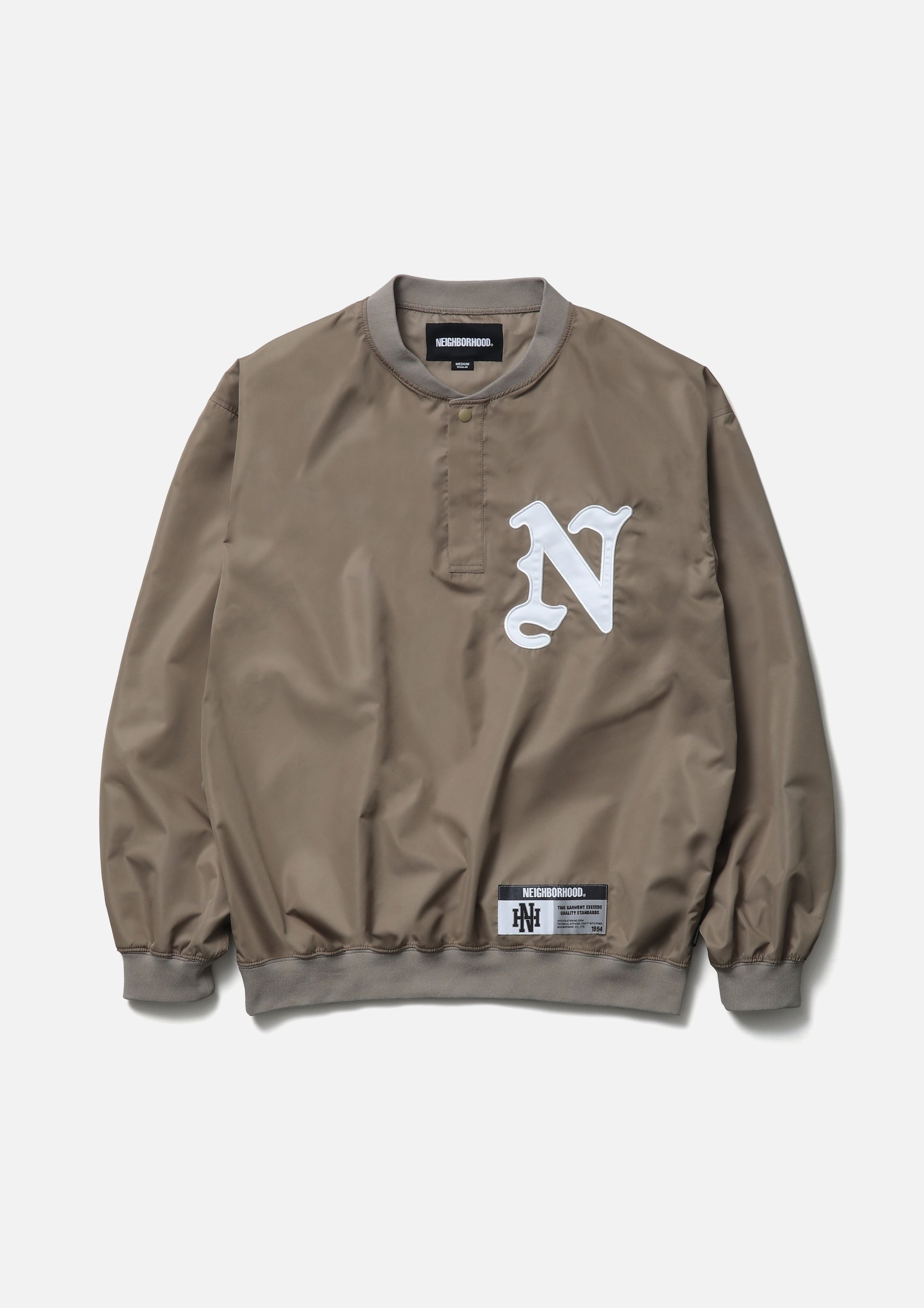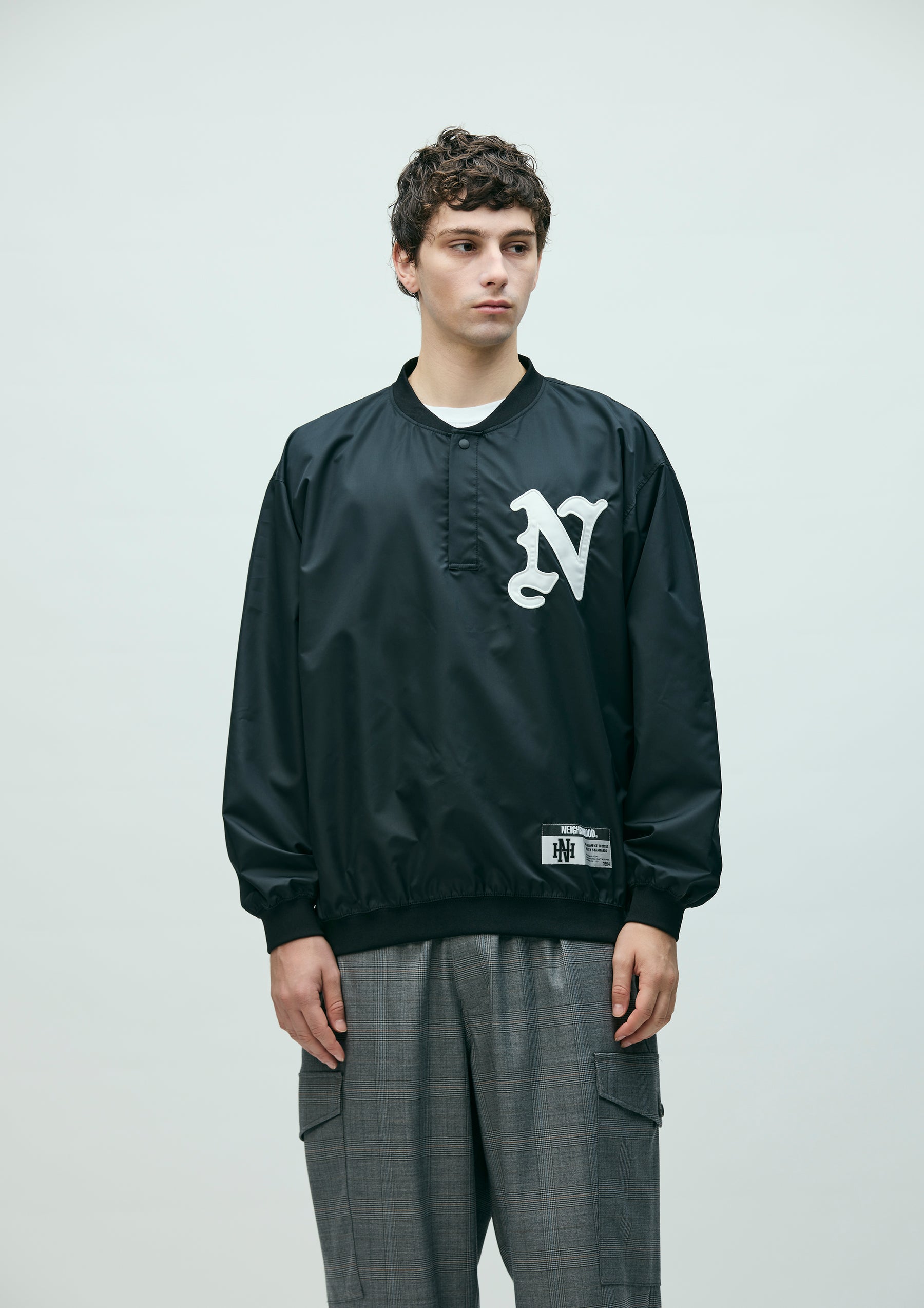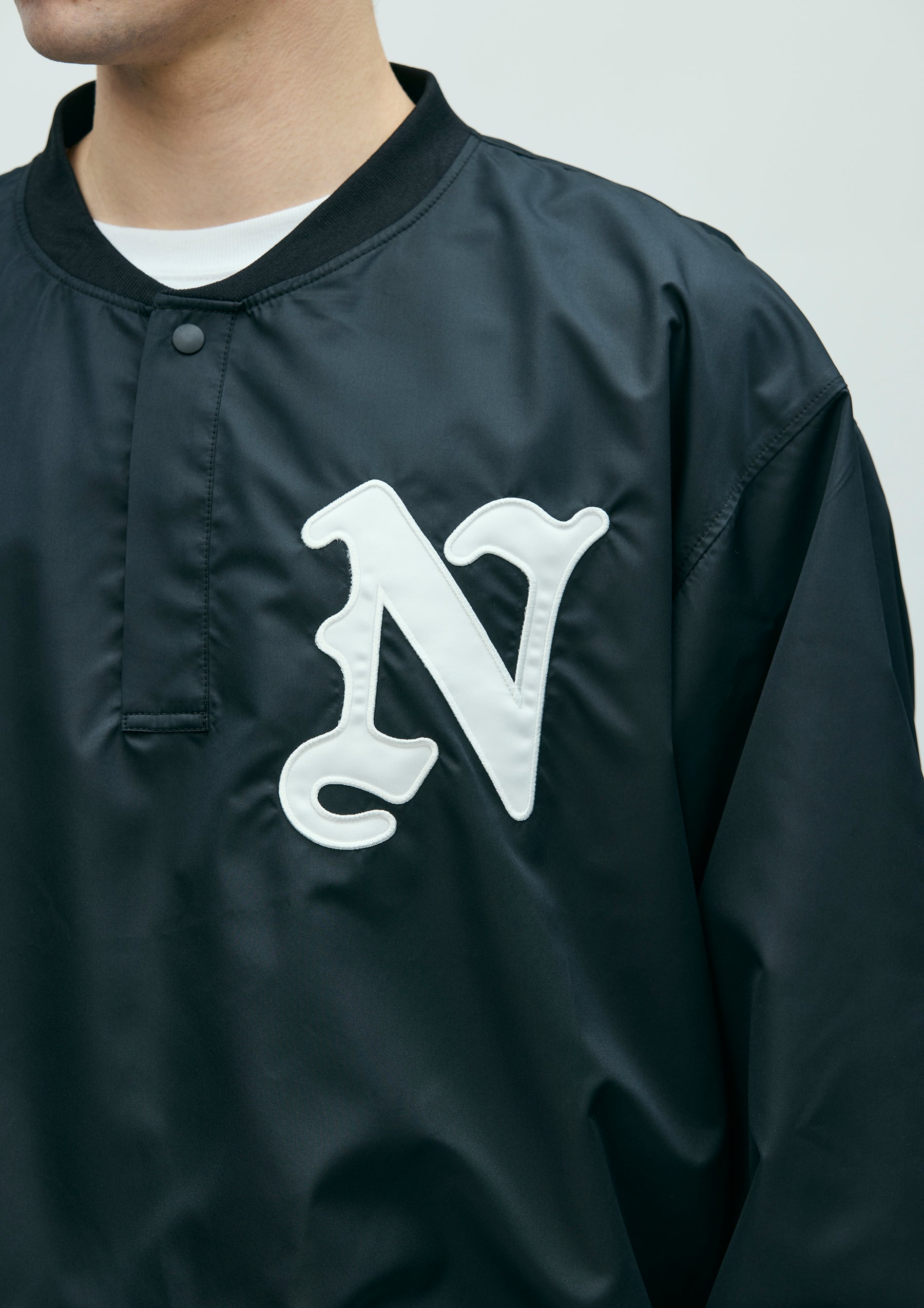 Pullover shirt made from high-performance taffeta fabric with excellent durable water repellency and breathability. Featuring the natural texture of a non-coated finish with a clear, high-density look, it is slightly lightweight with a soft hand feel. Designed with a henley neckline and ribbed collar, hem, and cuffs. Detailed with an embroidered patch on the left chest. A brand tag is placed at the left hem, and a woven side label is attached at the side seam.