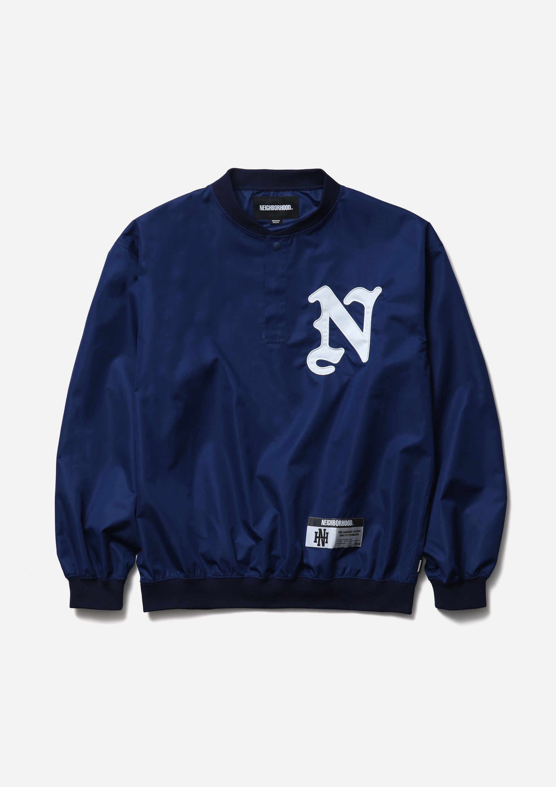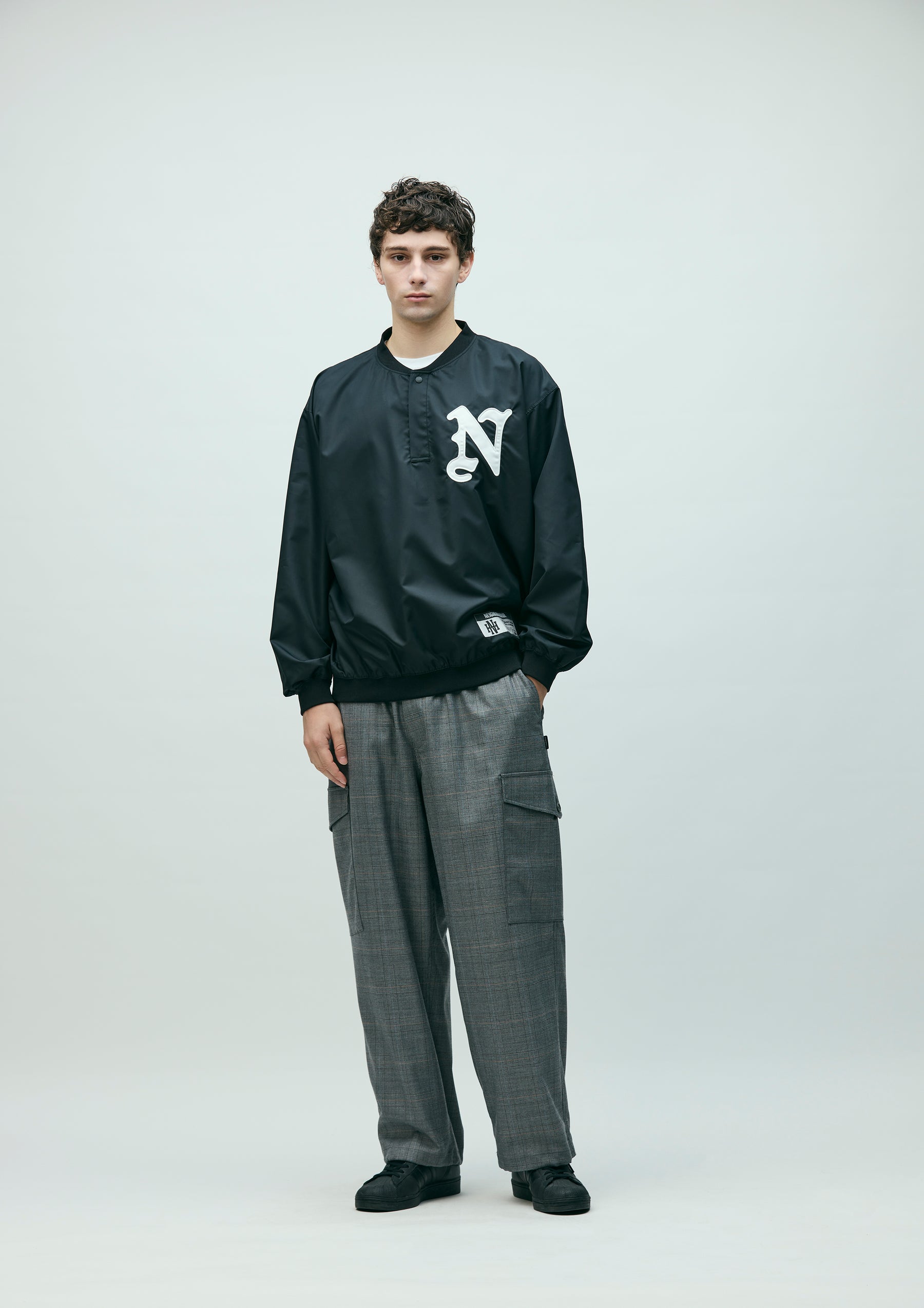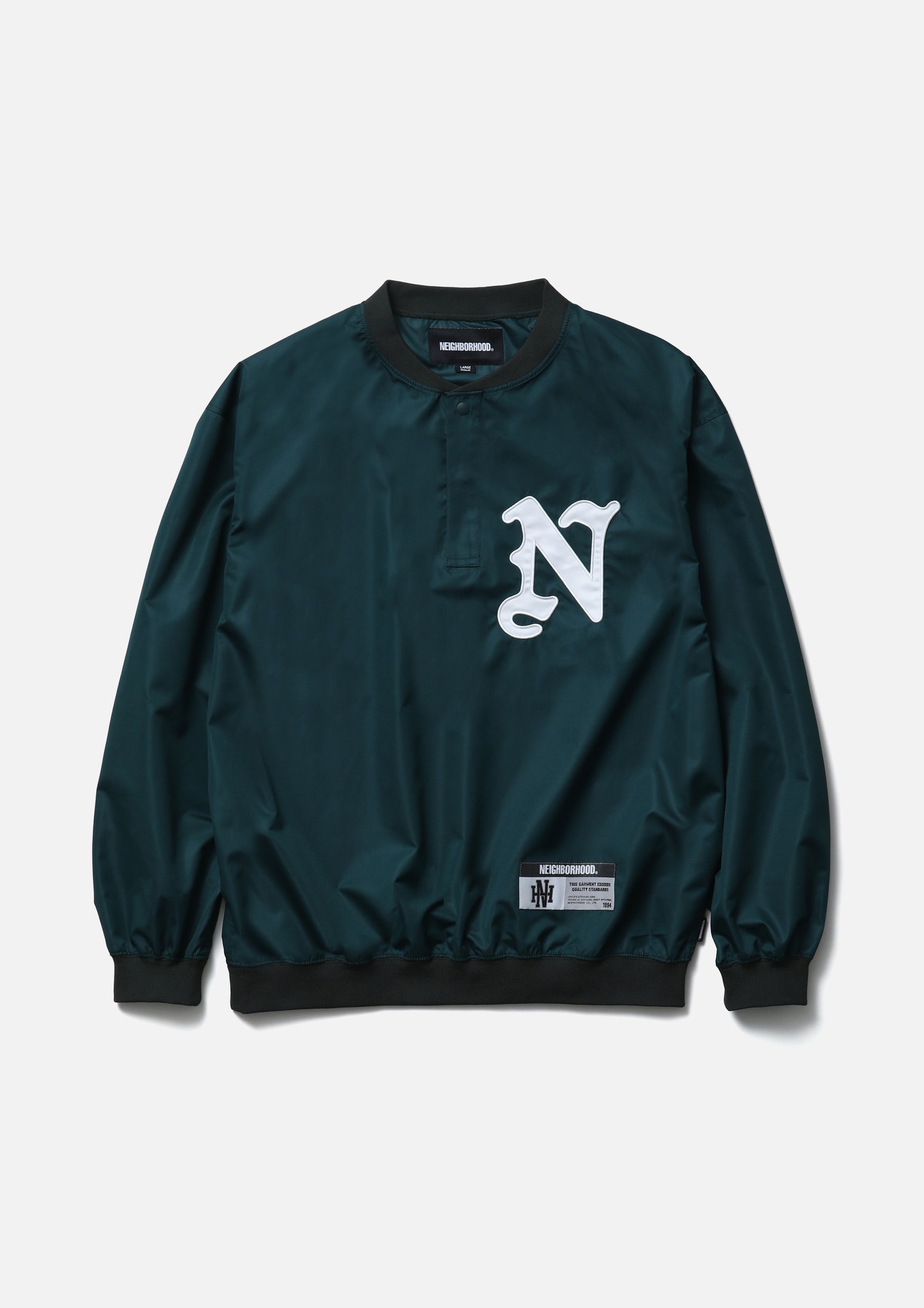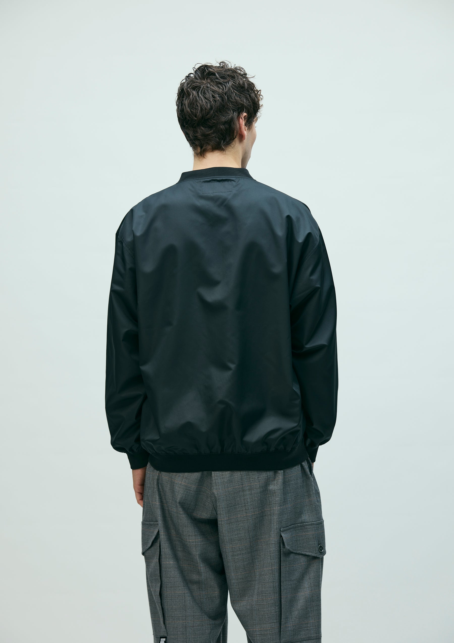 Pullover shirt made from high-performance taffeta fabric with excellent durable water repellency and breathability. Featuring the natural texture of a non-coated finish with a clear, high-density look, it is slightly lightweight with a soft hand feel. Designed with a henley neckline and ribbed collar, hem, and cuffs. Detailed with an embroidered patch on the left chest. A brand tag is placed at the left hem, and a woven side label is attached at the side seam.
