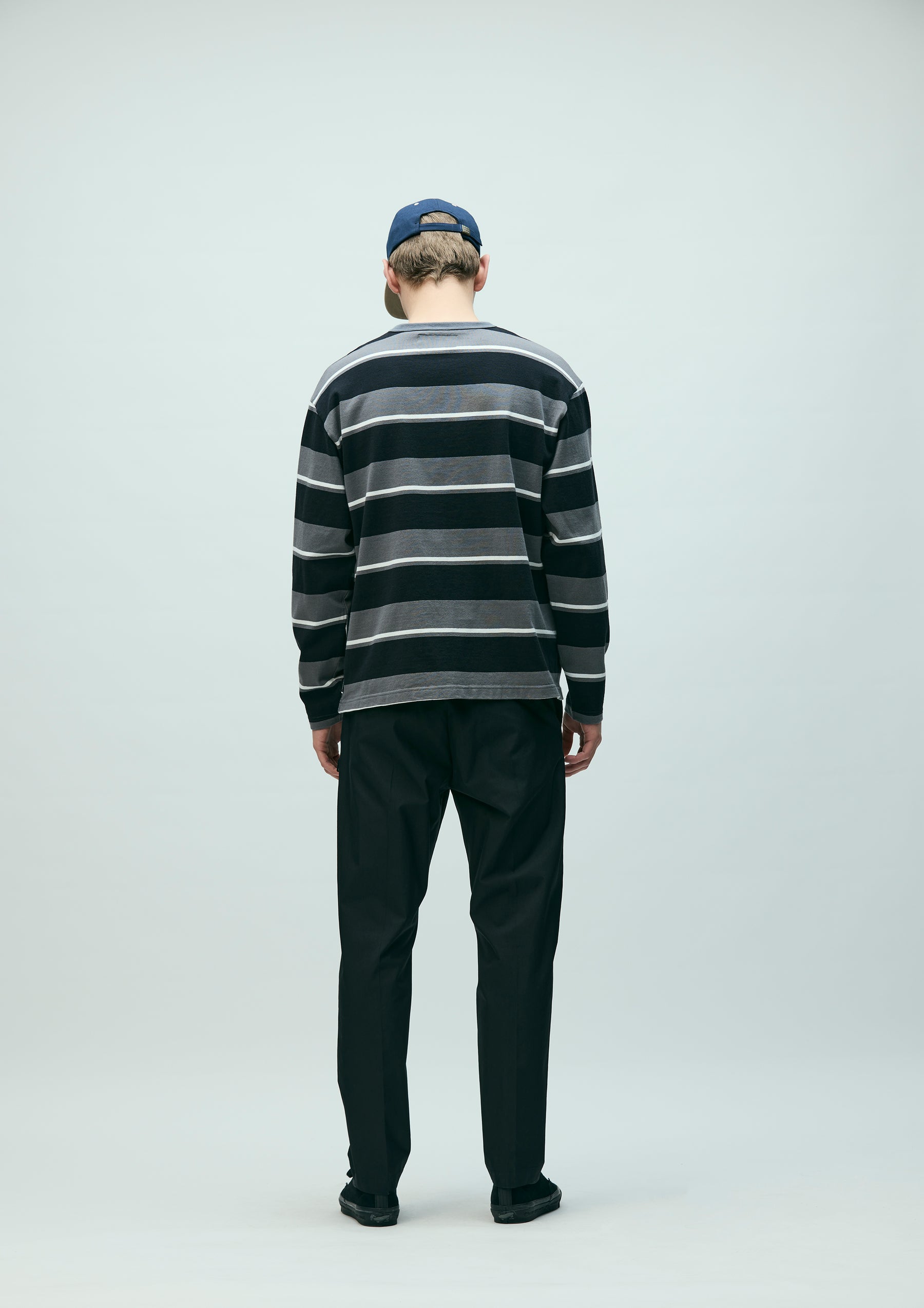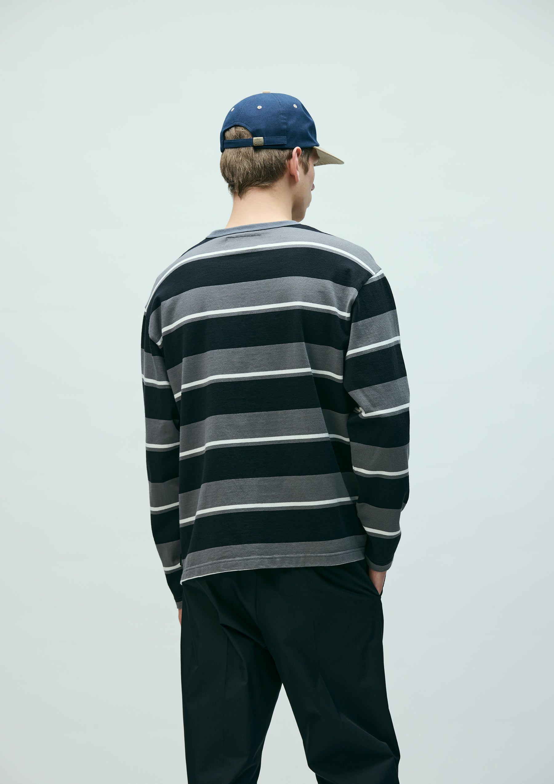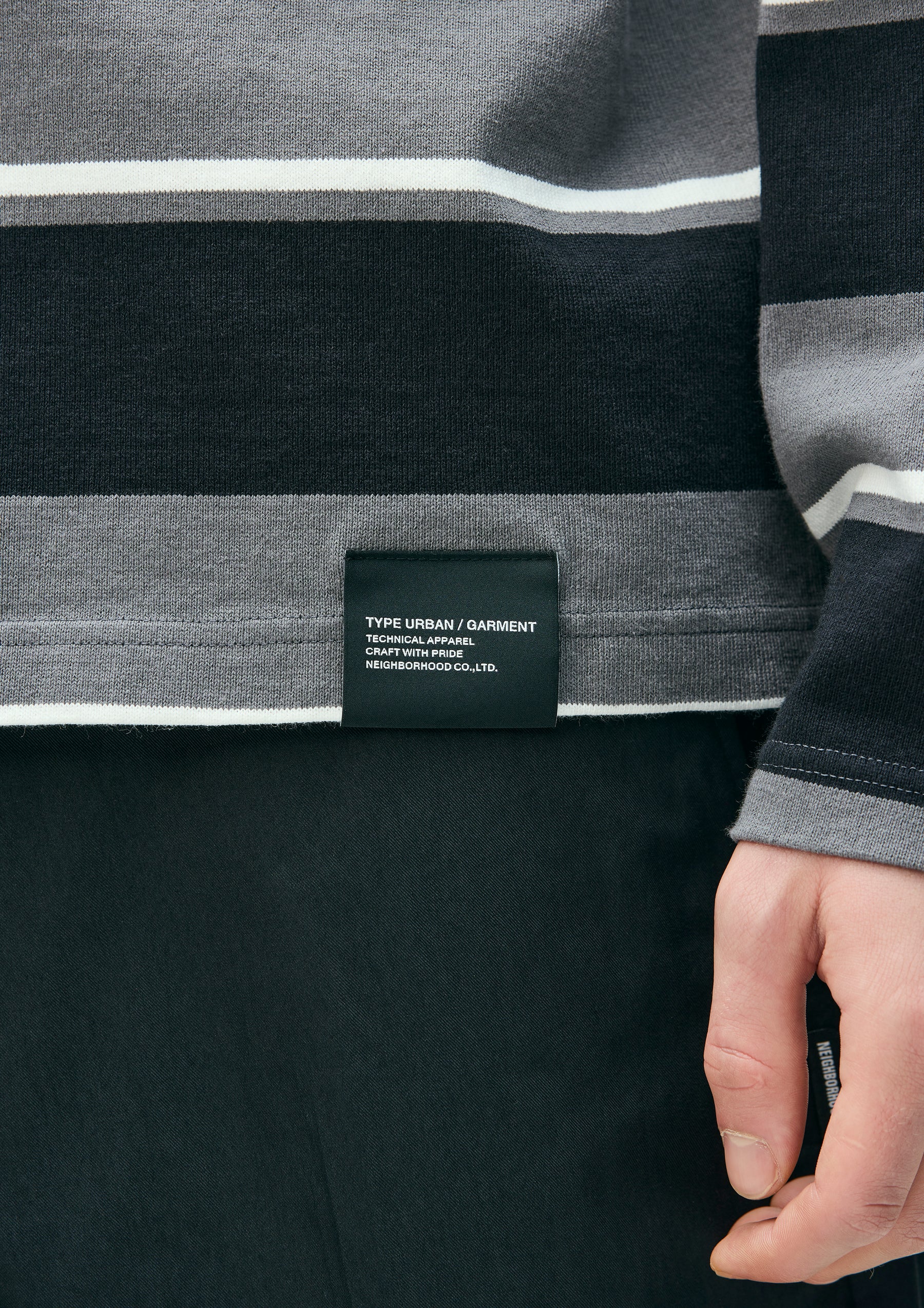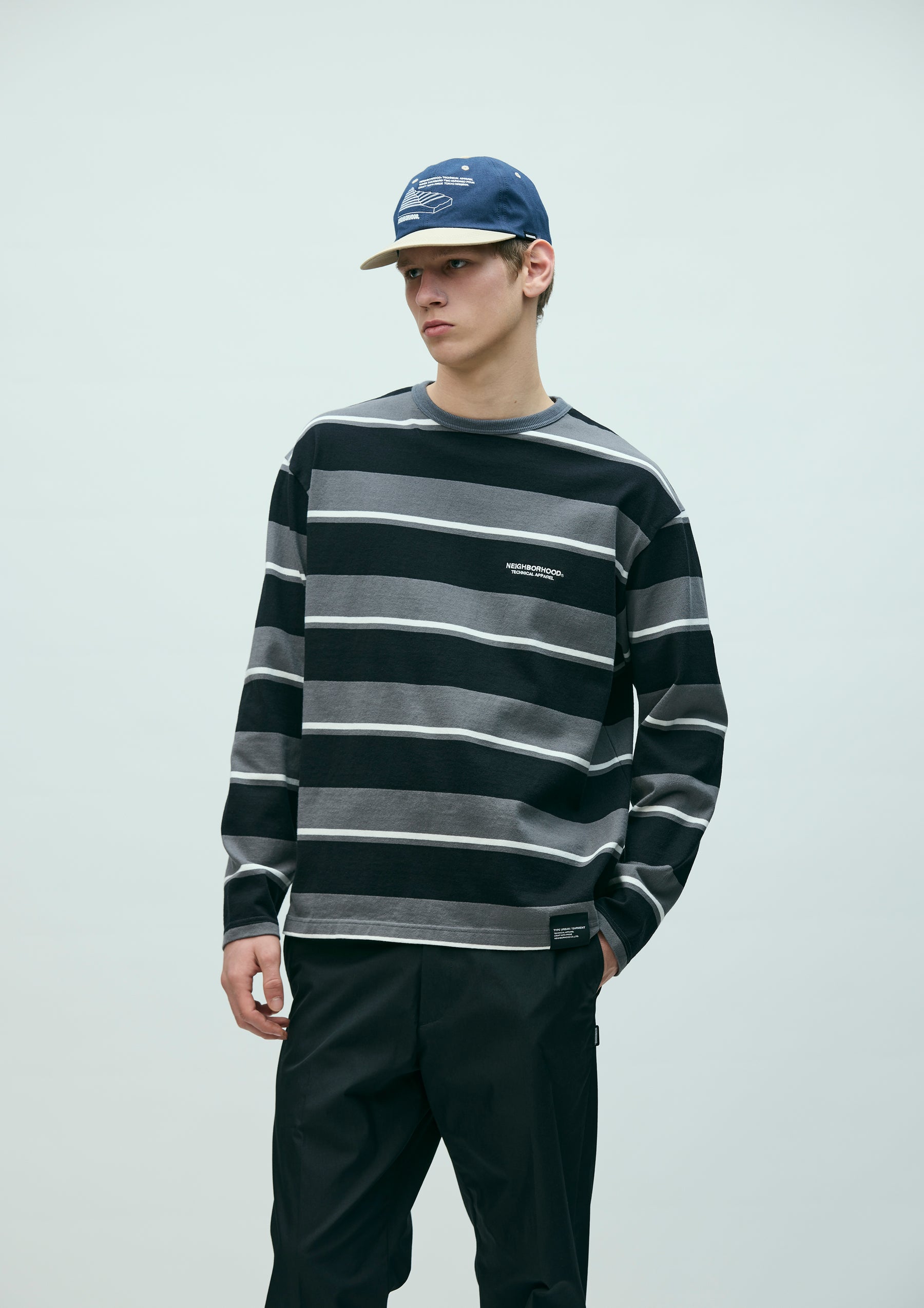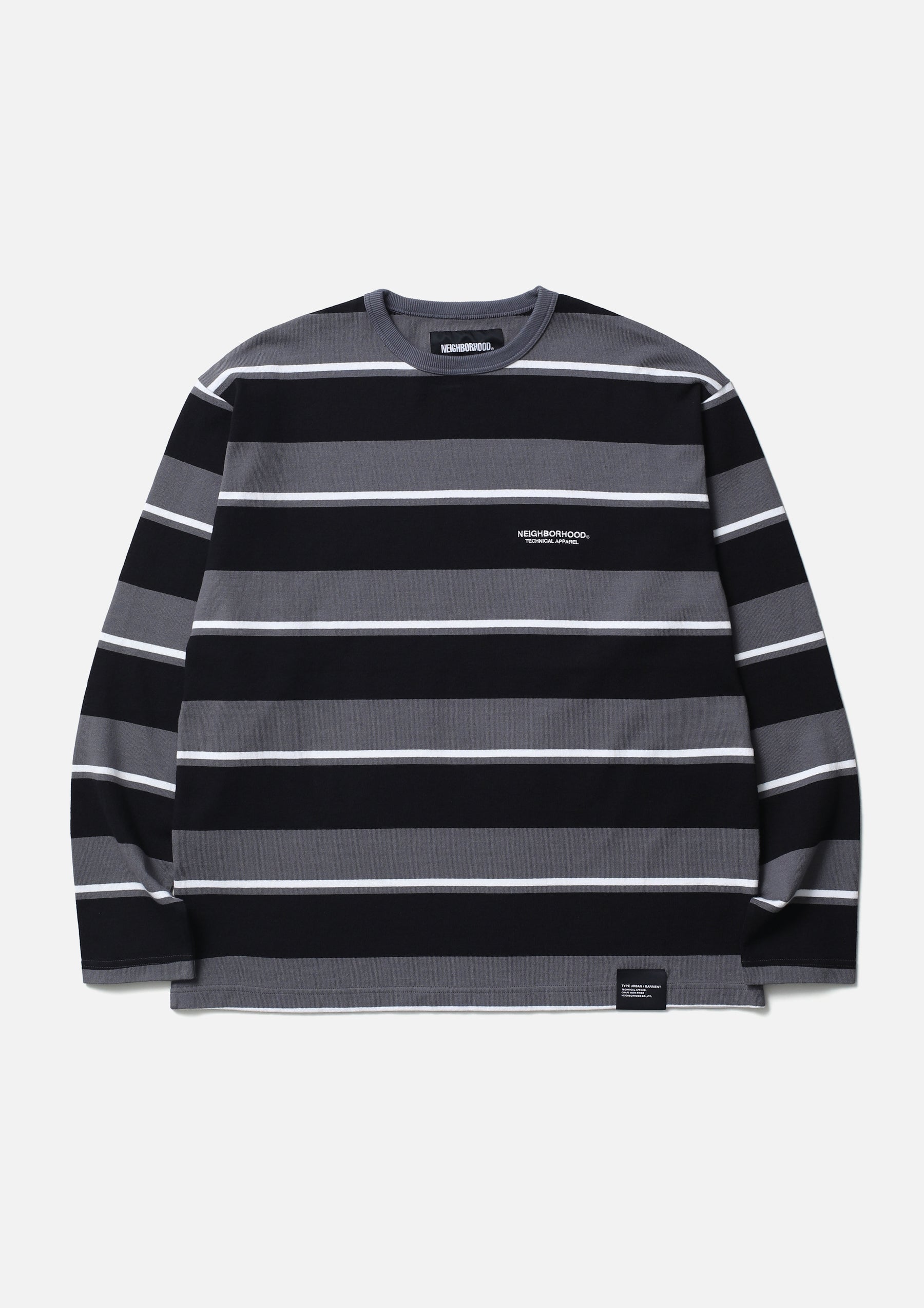 Long-sleeve crewneck cut-and-sew top made from jersey fabric knitted with an original border pattern. Features a printed logo on the left chest. A brand tag is placed at the left hem, and a woven side label is attached at the side seam. Completed with a one-wash finish.