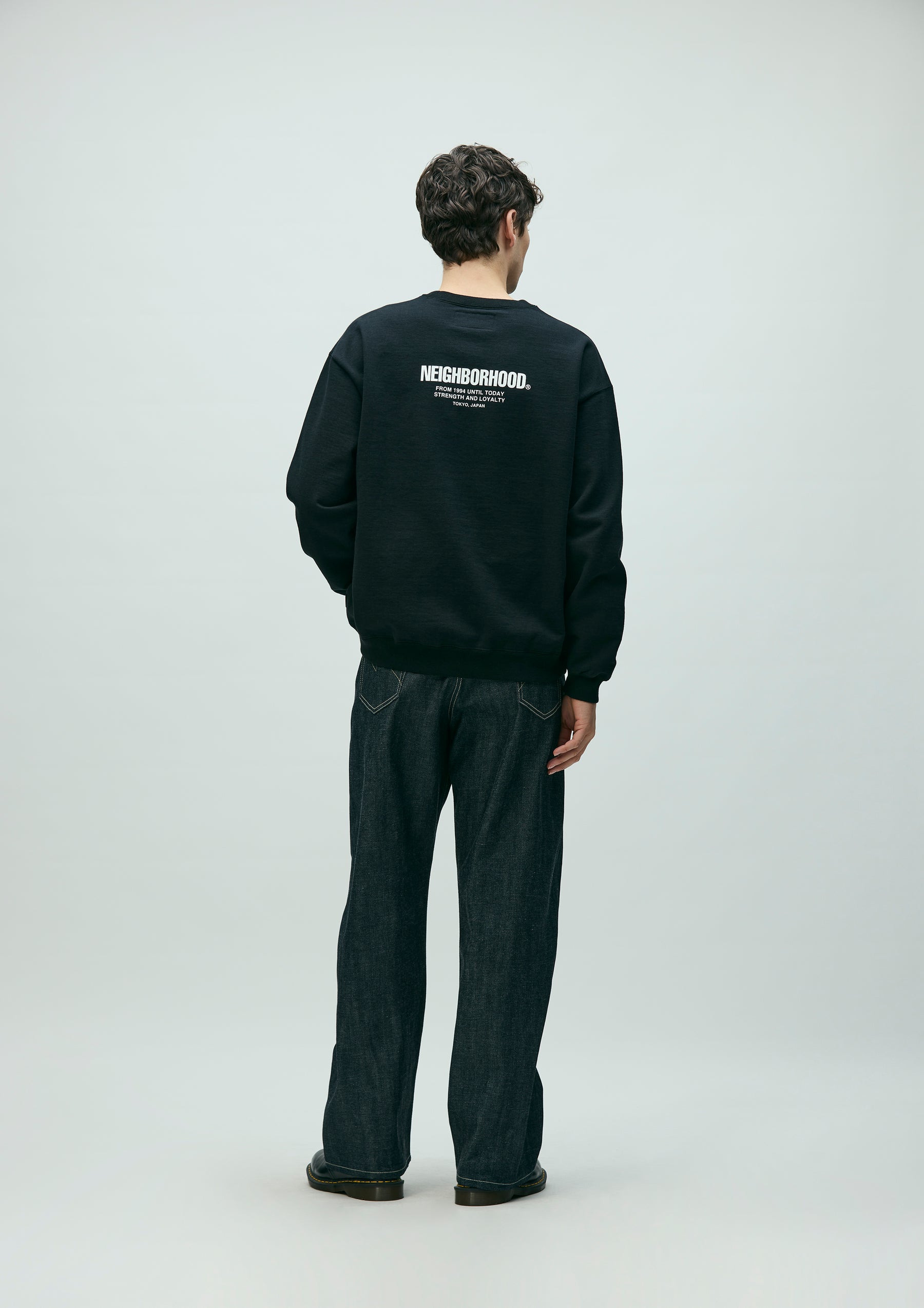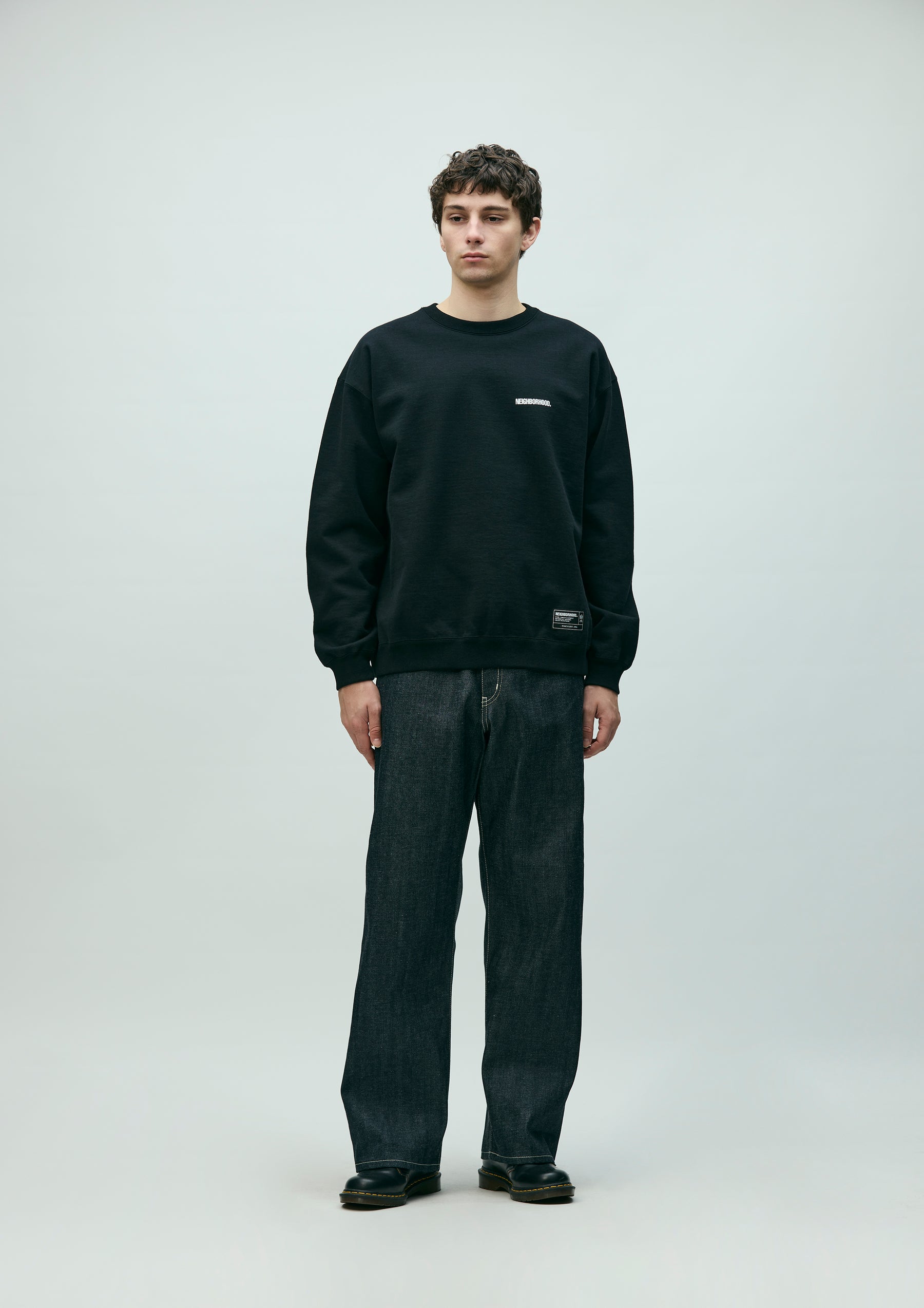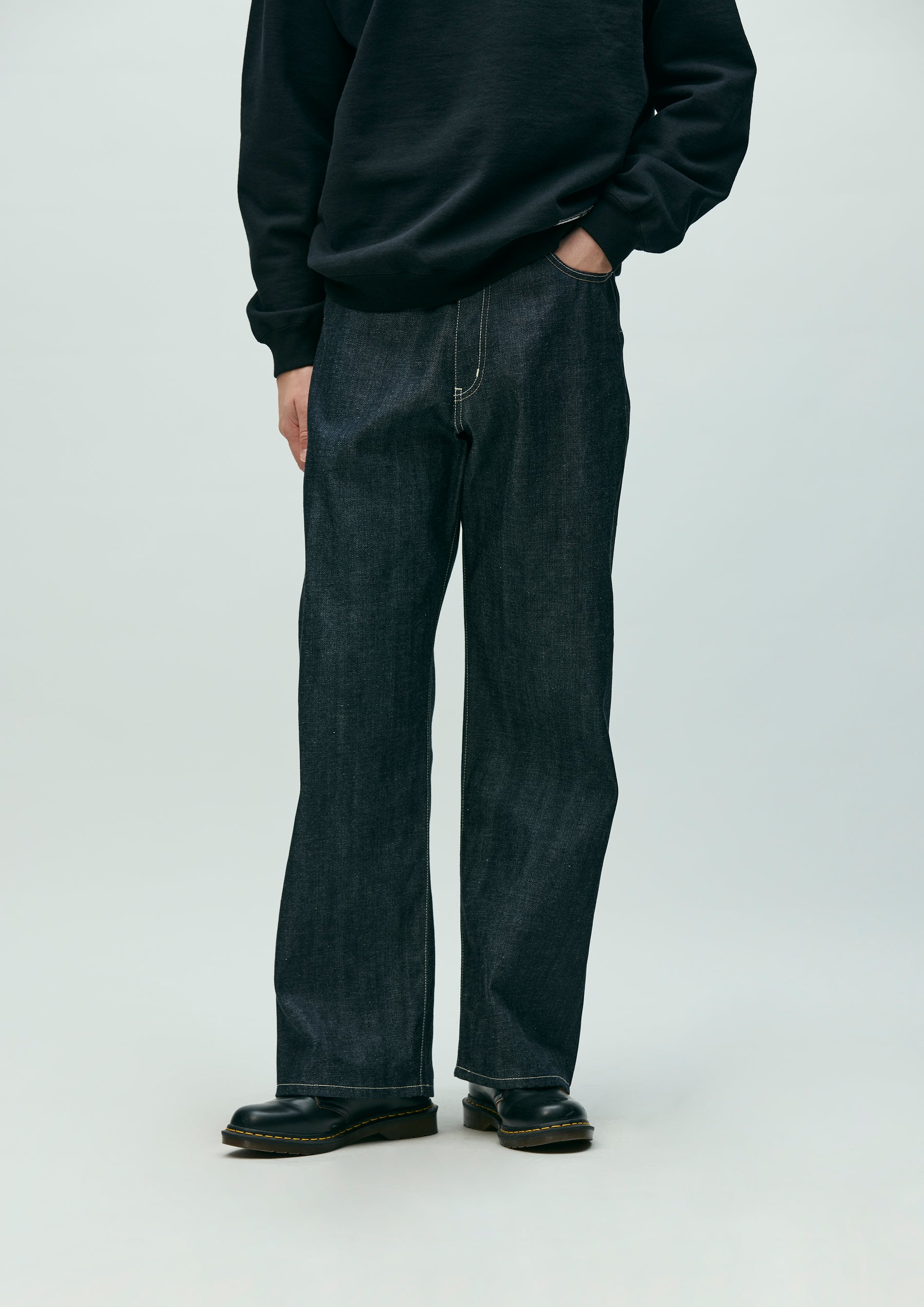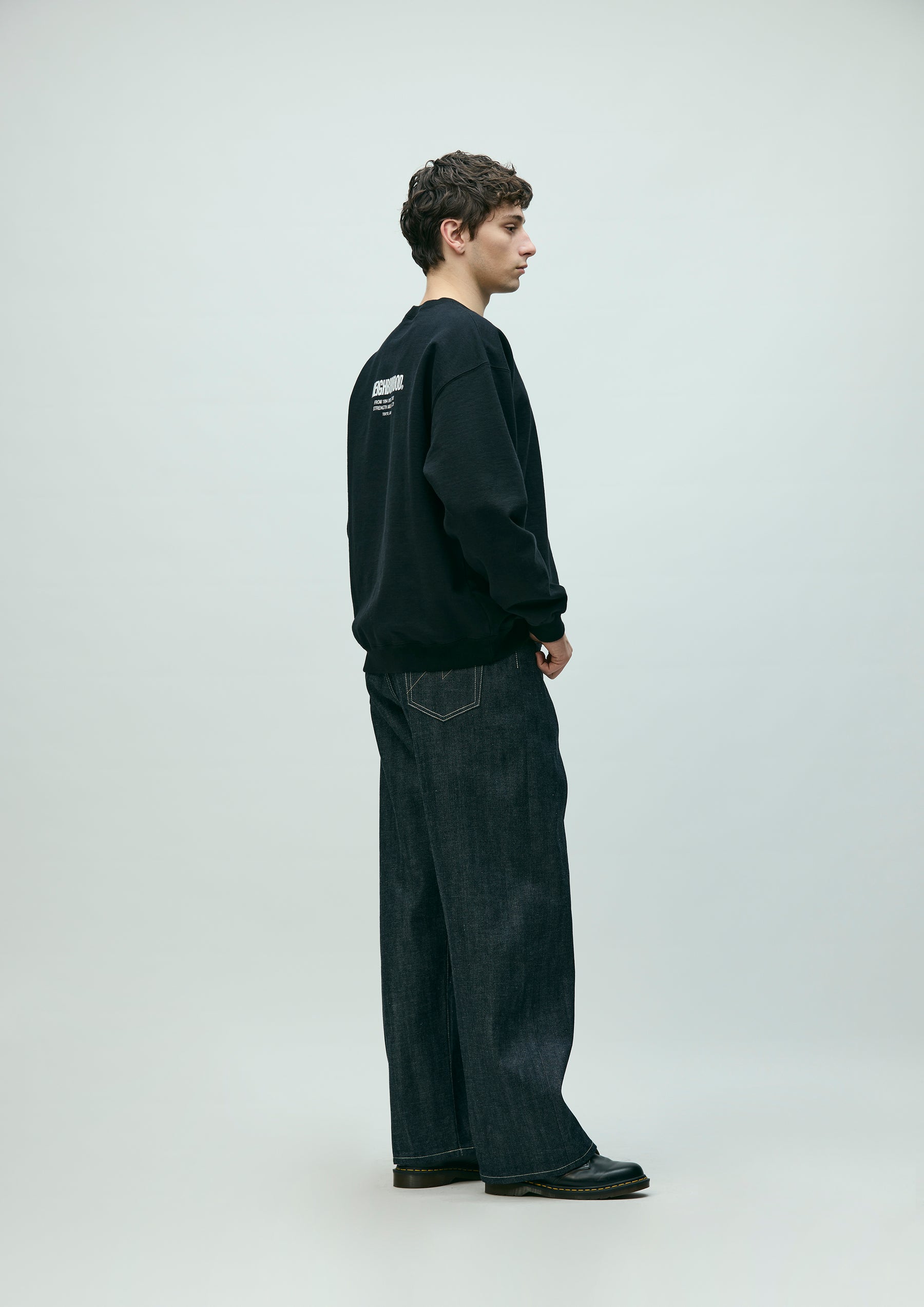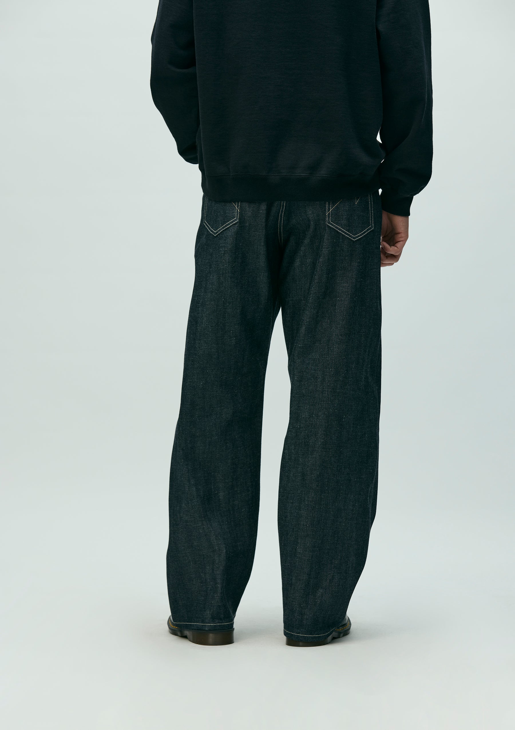 12 oz. denim pants made entirely from our original selvedge denim fabric, buttons, rivets, and other parts. Details such as signature tape on the front zipper fly, "N" stitching on the hip pockets, and leather patches. New wide-slate silhouette with a fairly loose fit in the waist, hips, and hems.