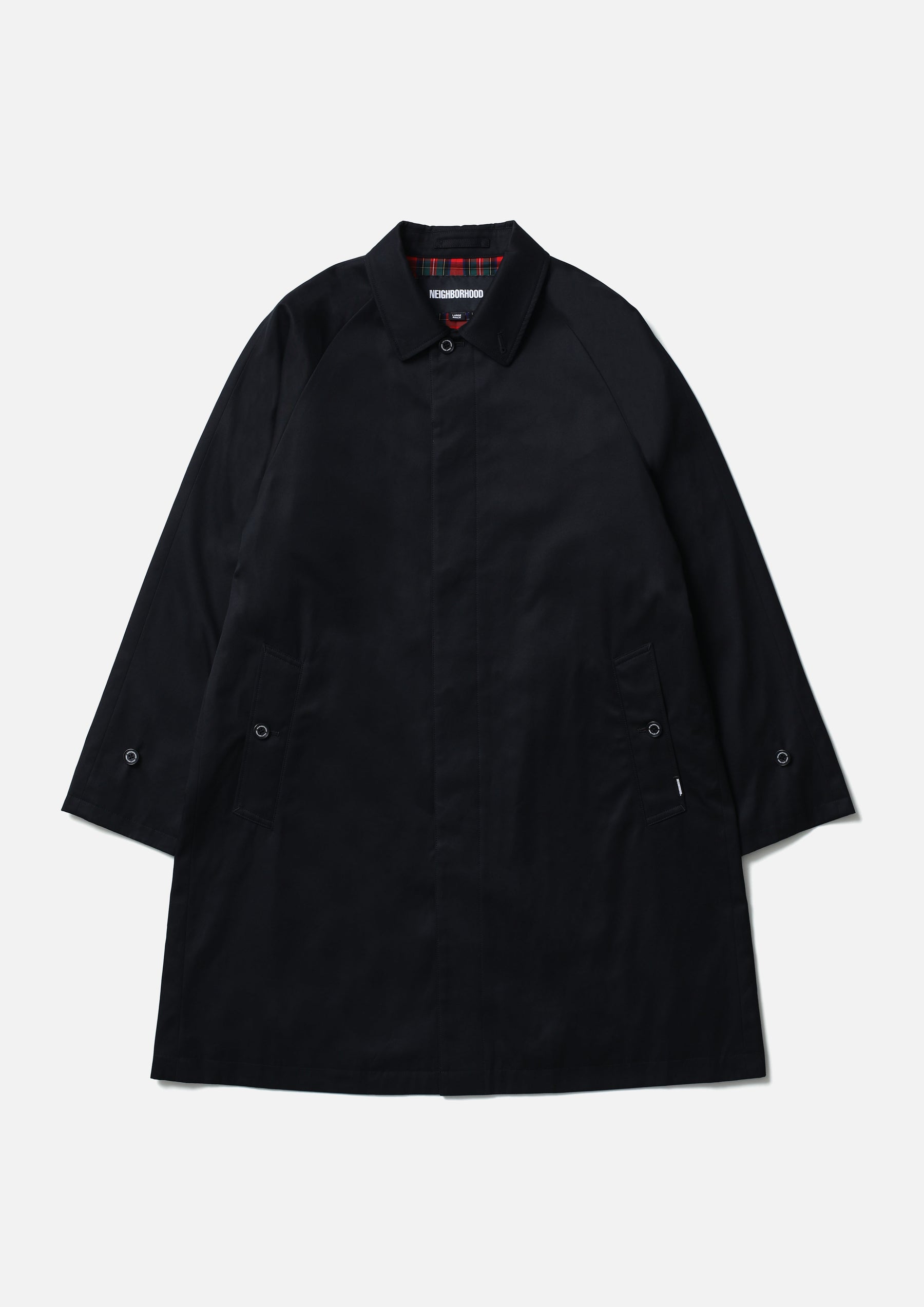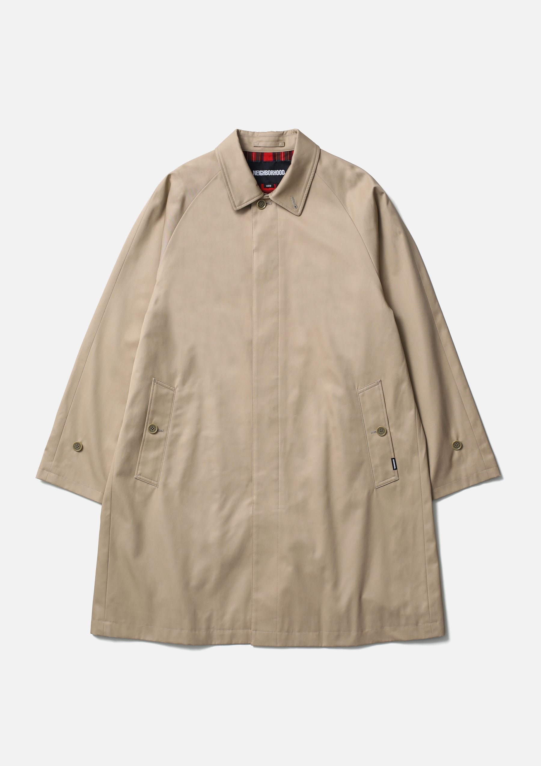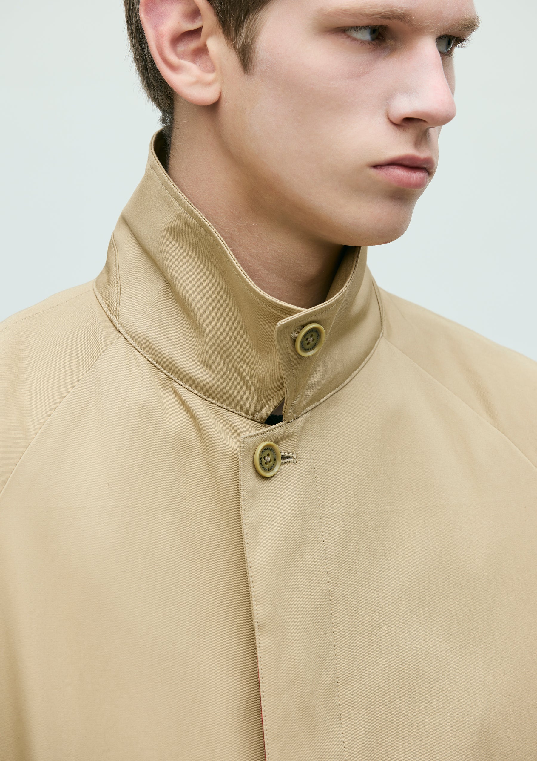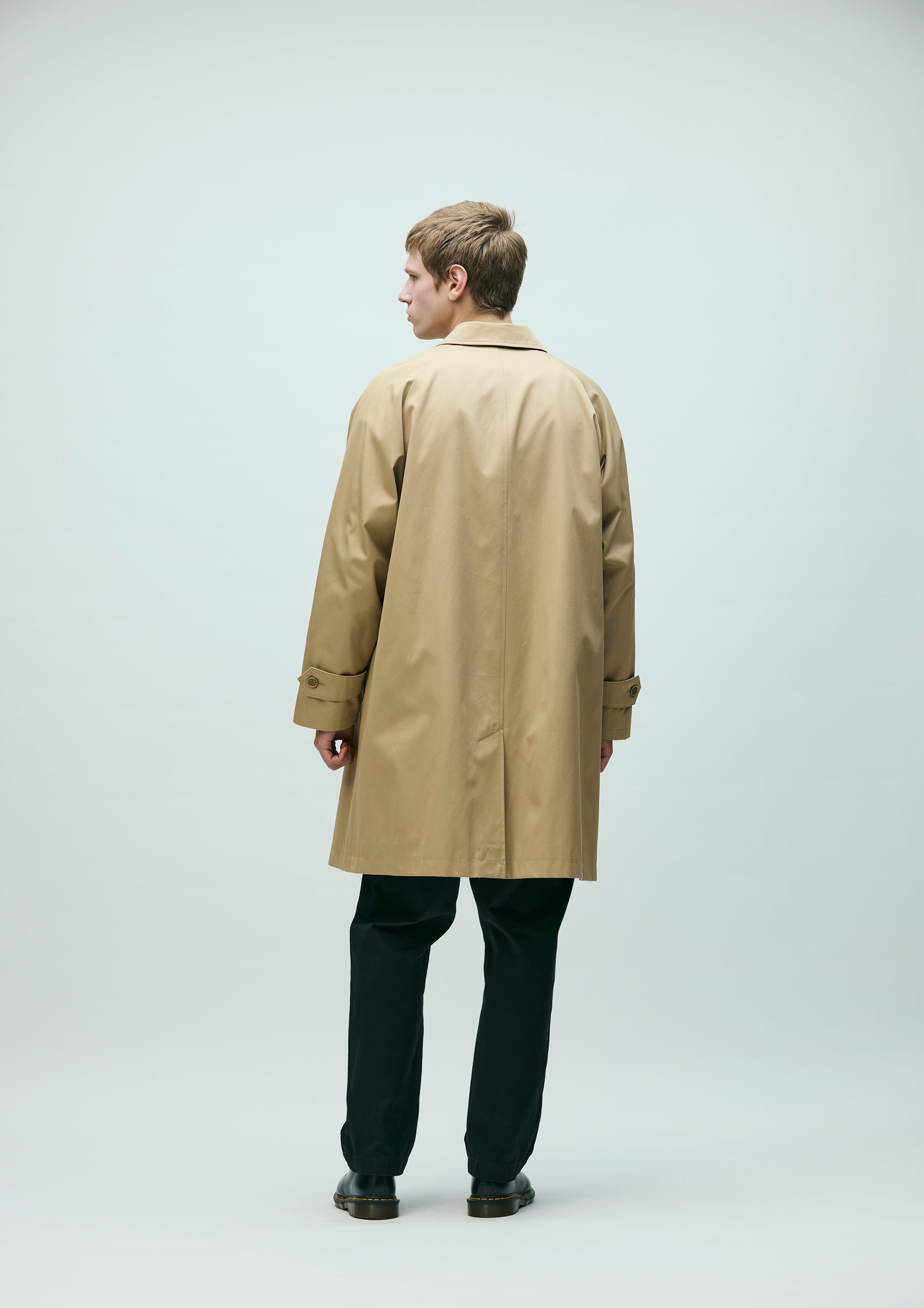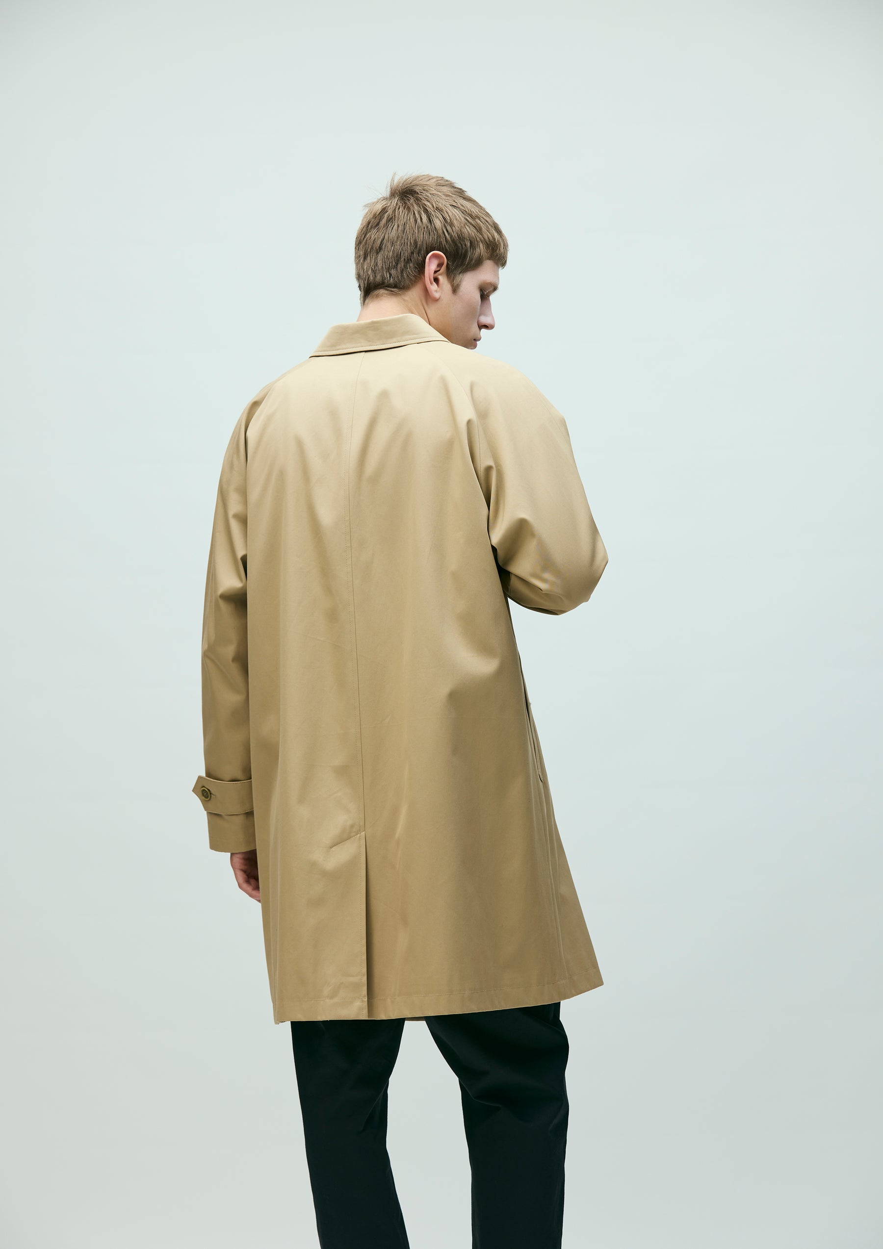 Bal-collar coat made from Ventile® gabardine fabric, offering both water repellency and breathability. The high-density cotton weave blocks external moisture while allowing internal vapor to escape. Designed with classic details such as raglan sleeves, box pockets, adjustable sleeve tabs, and a concealed front placket. Finished with original buttons. A brand tag is placed at the right front hem, and a woven side label is attached beside the pocket.