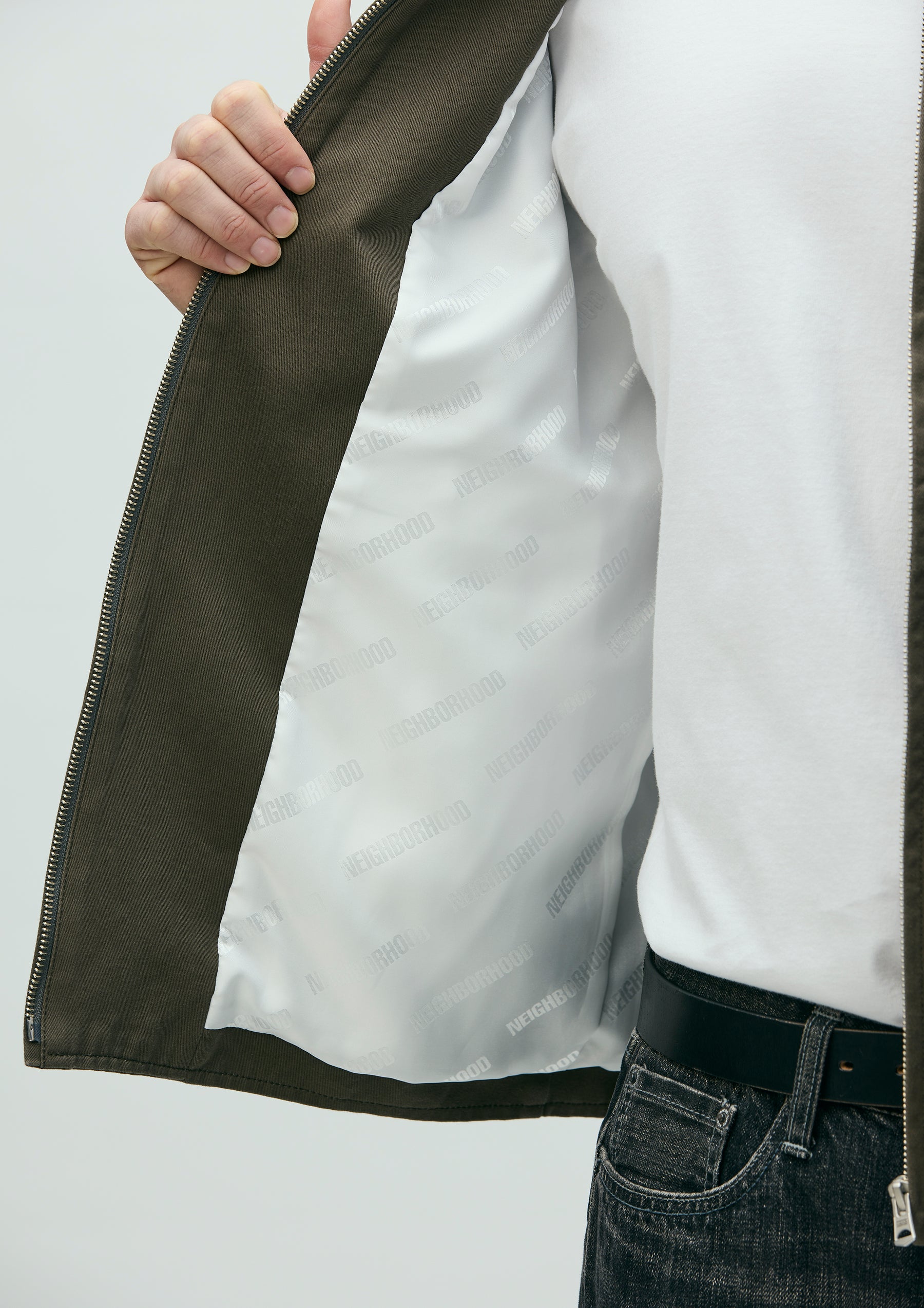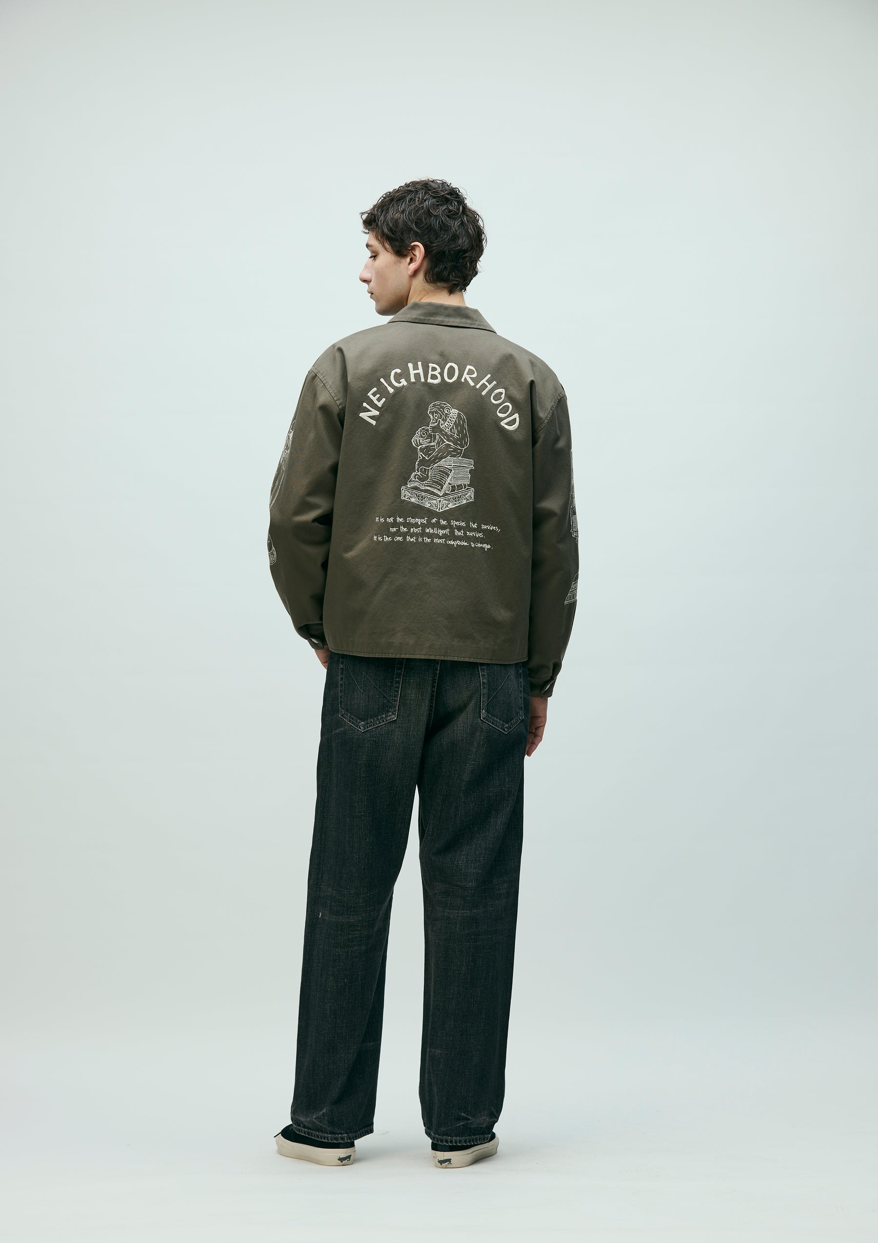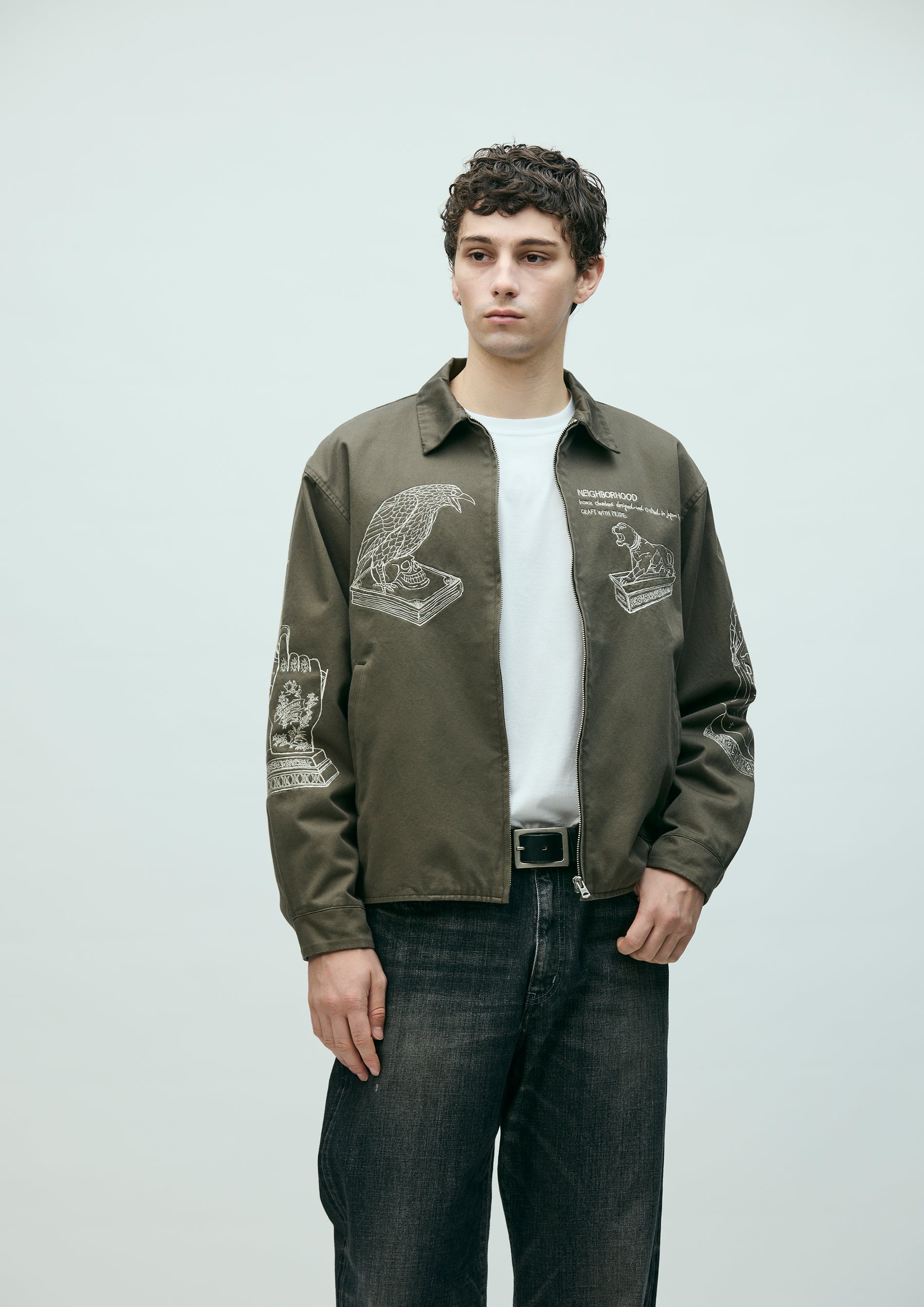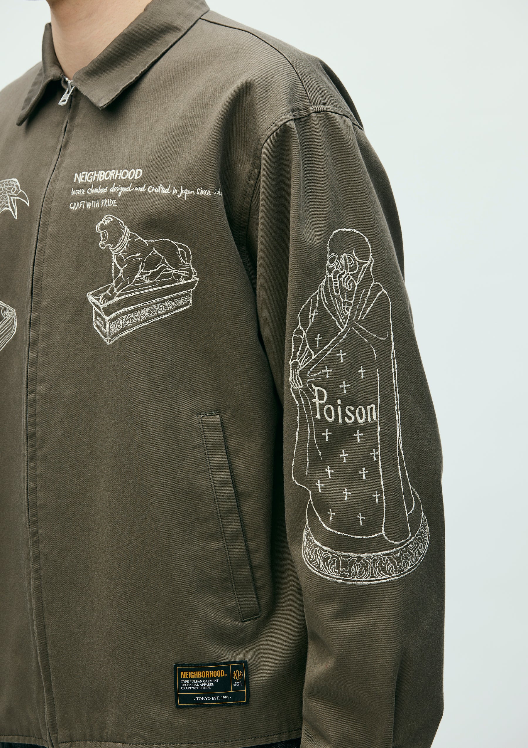 Souvenir jacket made from medium-weight chino cloth fabric. Features storm cuffs and embroidery of incense chamber motifs on the body and sleeves. Finished with original snap buttons. A woven side label is attached at the side seam.